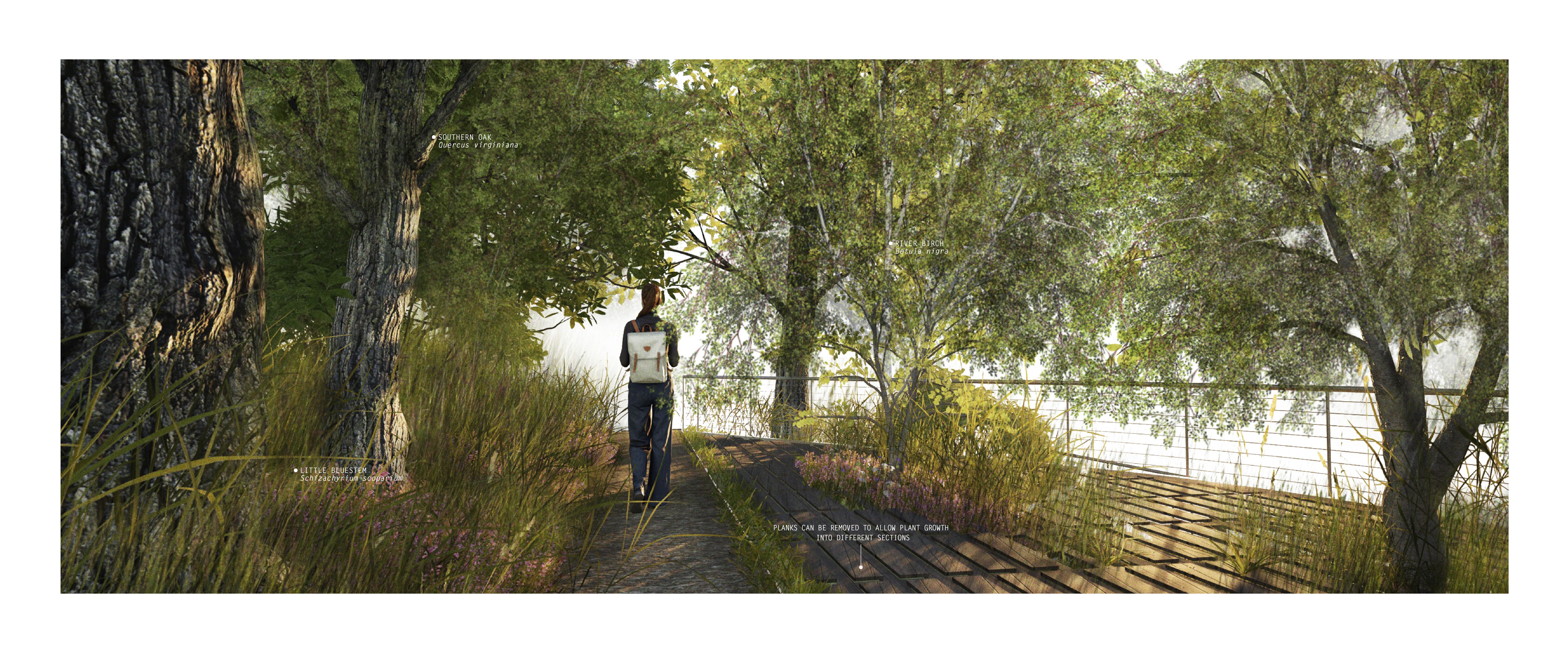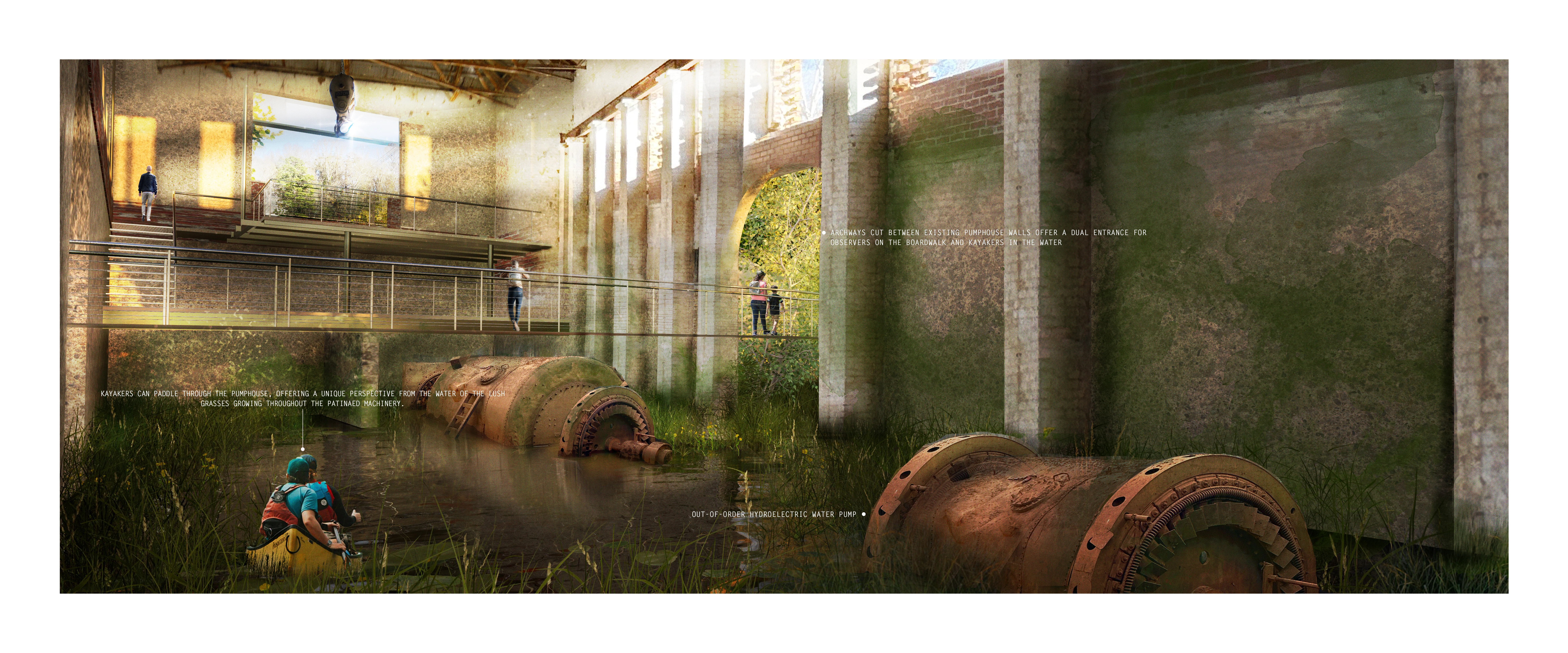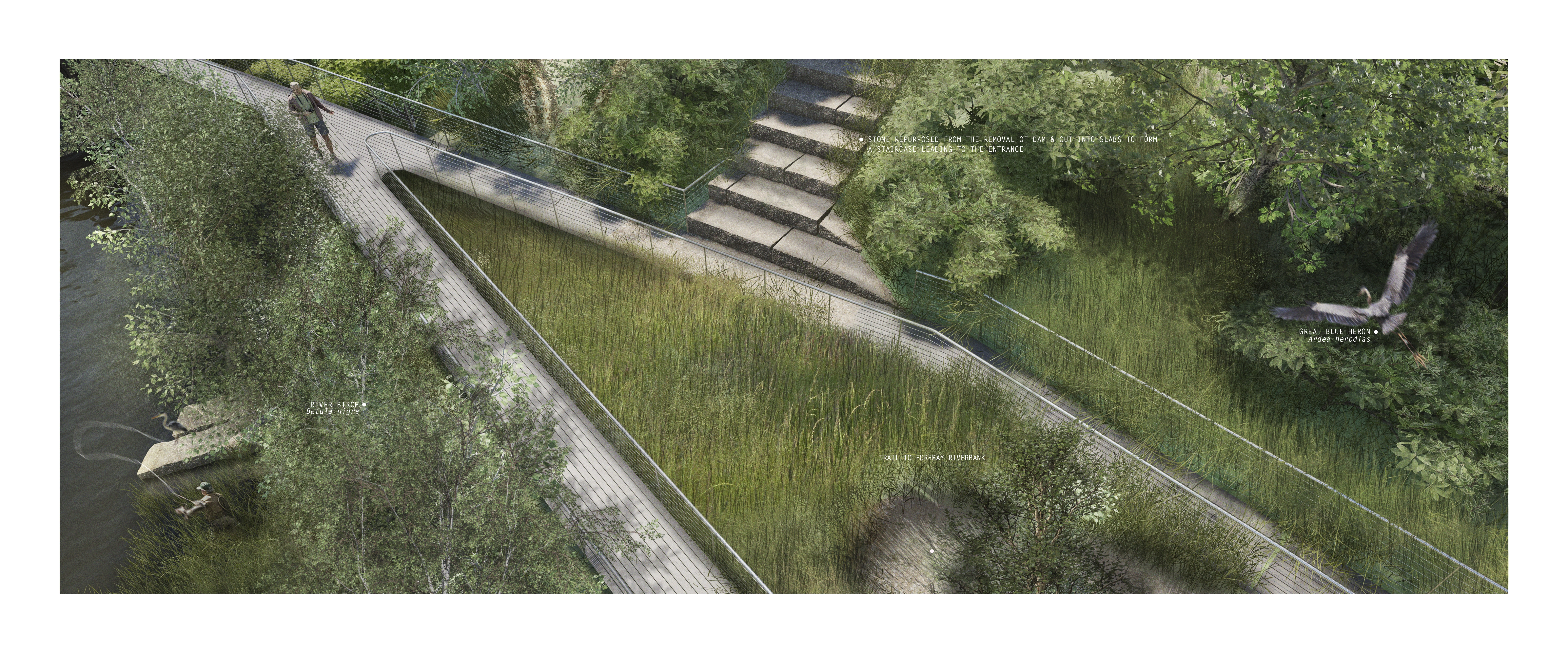 The boardwalk comprises three levels, each carefully designed to provide unique experiences. The first level serves as the main point of entry, featuring dense vegetation like native oaks, sycamores, and ash trees. The second level is an open meadow area with native grasses like bluestem and switchgrass, along with seasonal flowers. This level offers shaded spots provided by the canopies of the 1st level and houses smaller trees such as black tupelo and river birch, which enjoy wet conditions towards the pumphouse.The final level of the boardwalk brings visitors closer to the water, providing access for activities like kayaking and fishing. Here, the design incorporates moments where visitors can interact with remnants of the dam, including areas where the river once flowed through gates when the dam was operational or standing on the bridge that floats over the existing form of the dam allowing viewers to see the formations, known as "rock pedestals," created by water currents from the dam during its operation. The pumphouse allows kayakers and visitors to appreciate the grandeur of its patinated machinery amidst wild river vegetation from within. Archways cut into the pumphouse allows up close exploration of this area.
