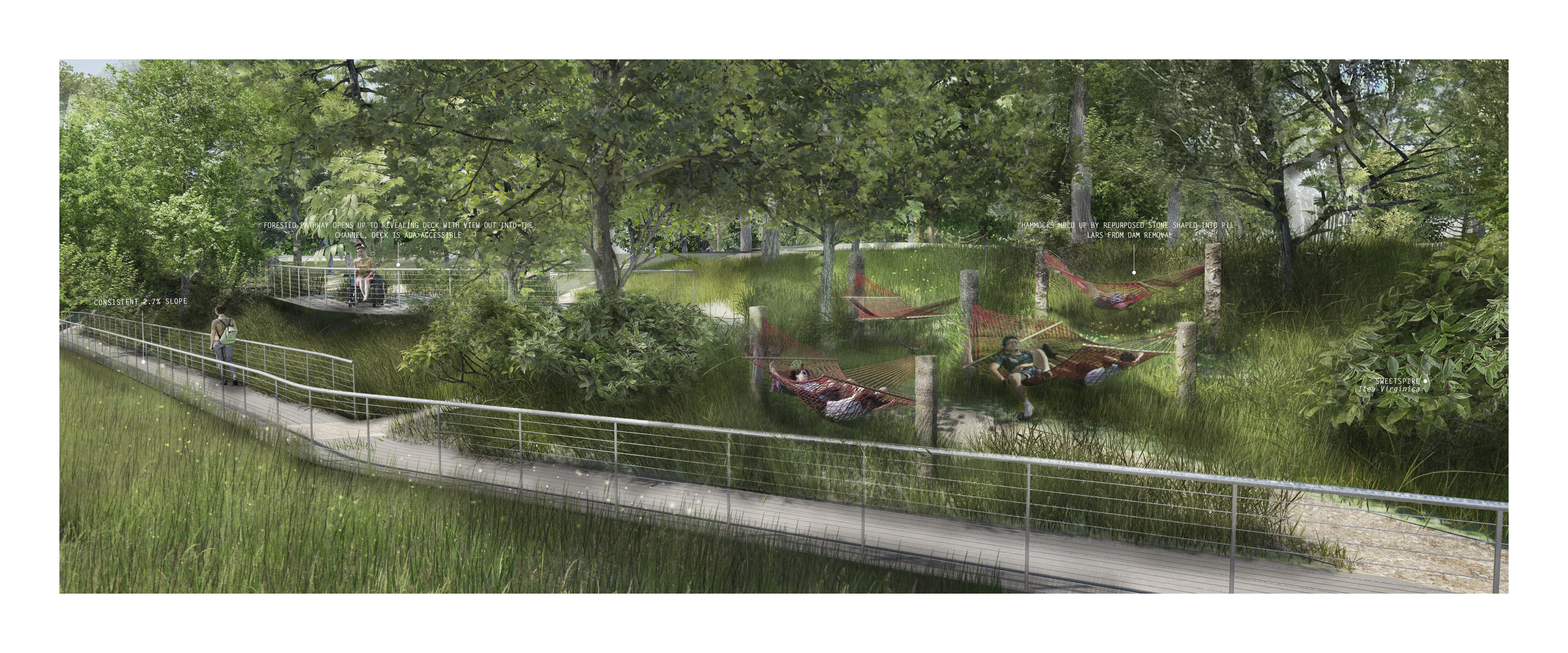 Breathtaking. A creative project that honors history while transforming the site into a usable landscape with ecological function. The graphics are outstanding. The concept is simple and elegant, striking a wonderful balance between the wild and the modern, carefully inserted elements and the historic remains.