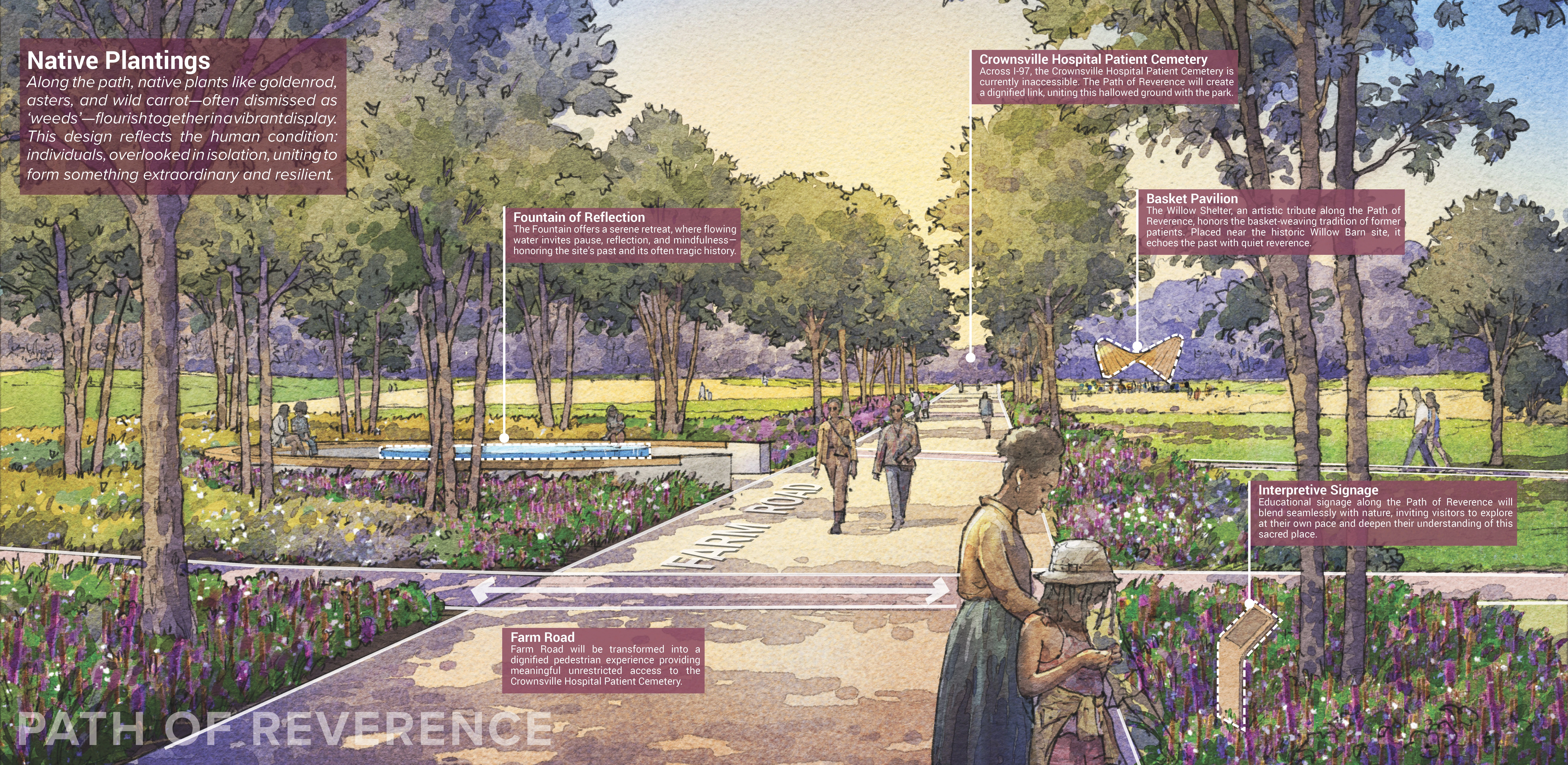 Crownsville Hospital Memorial Park is a transformative master plan that reimagines the former “Hospital for the Negro Insane of Maryland” into a powerful landscape of healing. Once a place of segregation and suffering, it now fosters mental wellness through remembrance, reflection, and community connection. By honoring those once forgotten and creating spaces for solace and renewal, the park confronts the past while shaping a more compassionate future. It stands as a testament to resilience—where isolation gives way to belonging, and suffering is met with hope—redefining how public spaces can promote mental health and inspire collective healing.