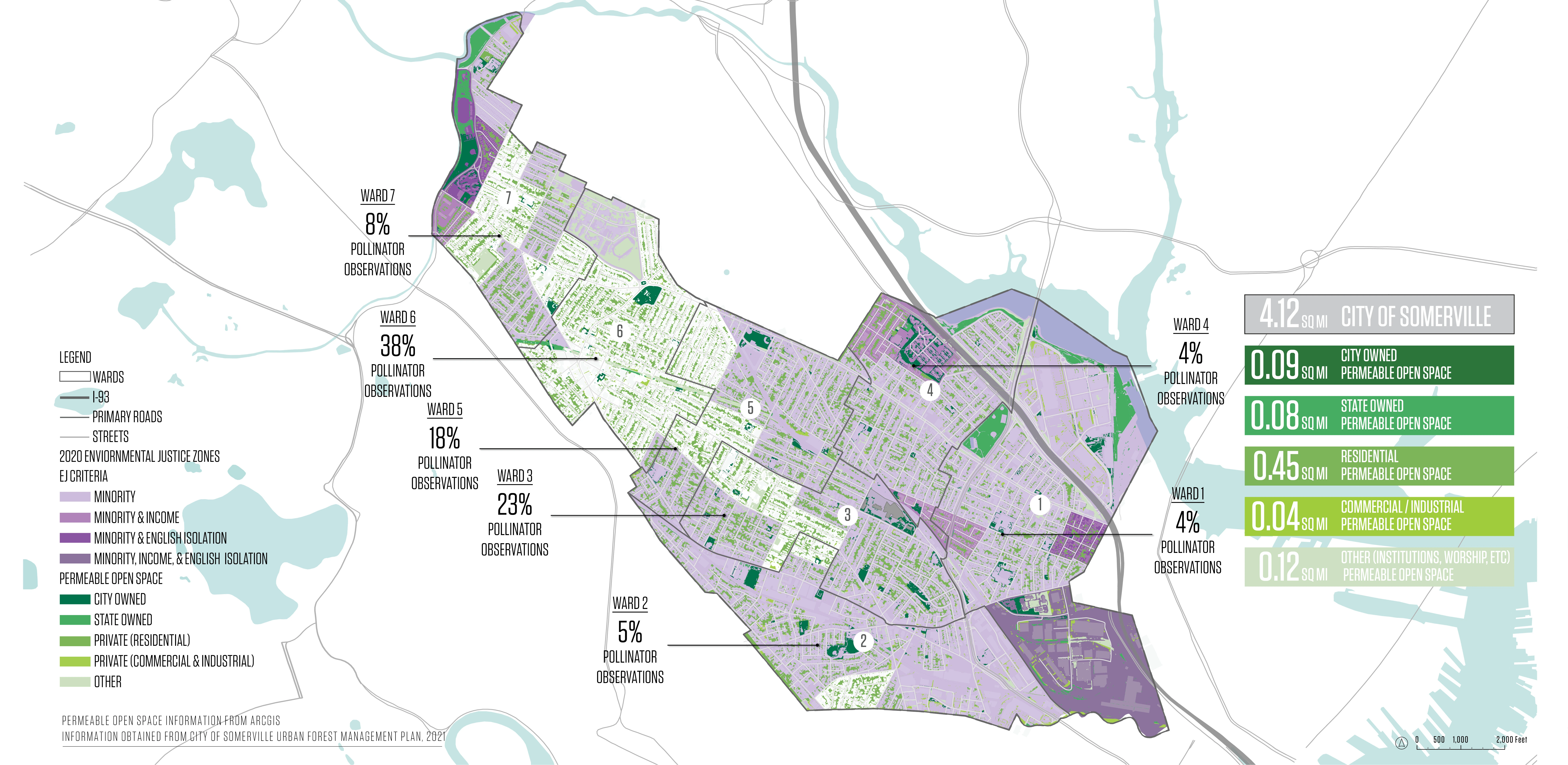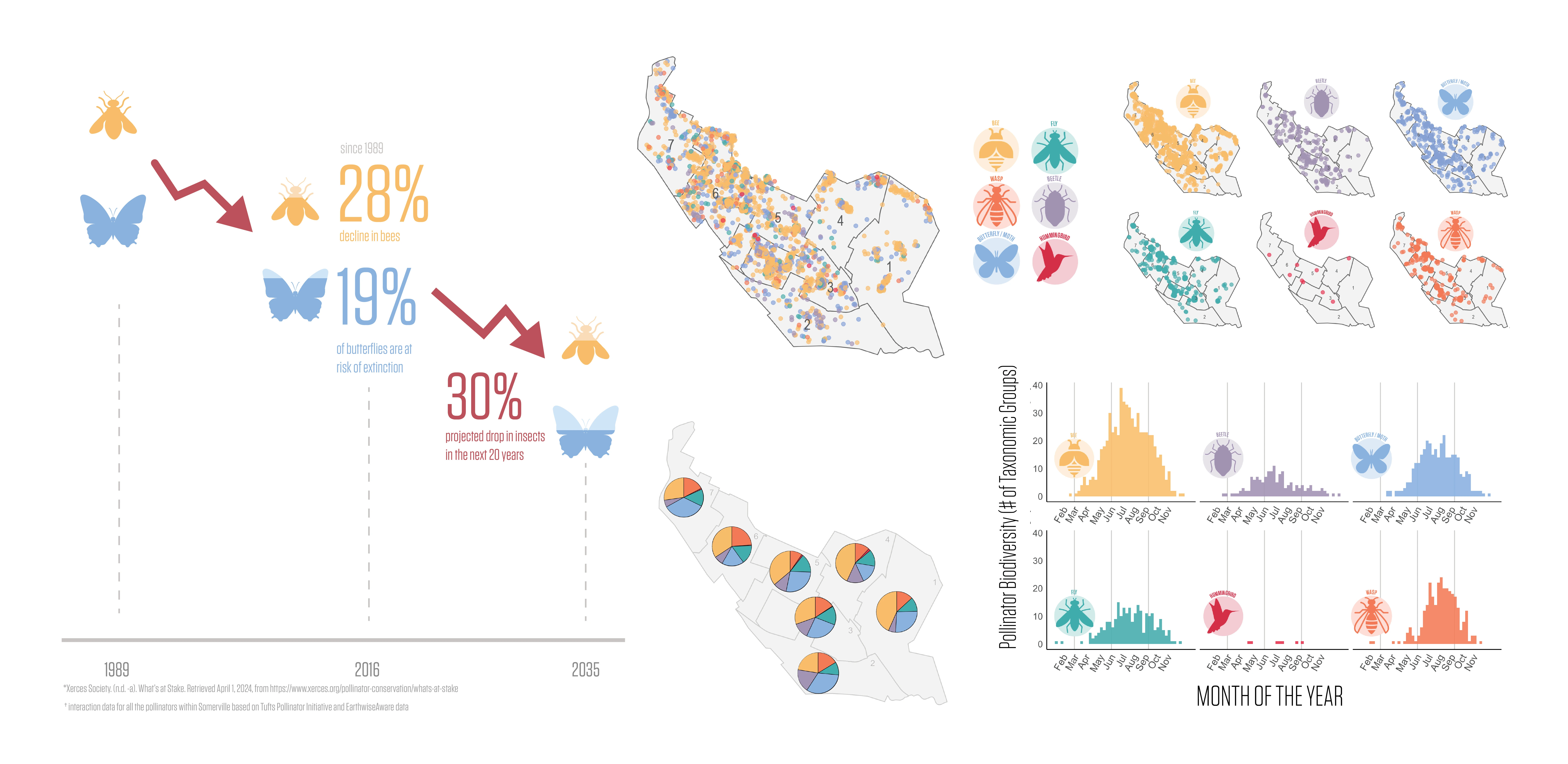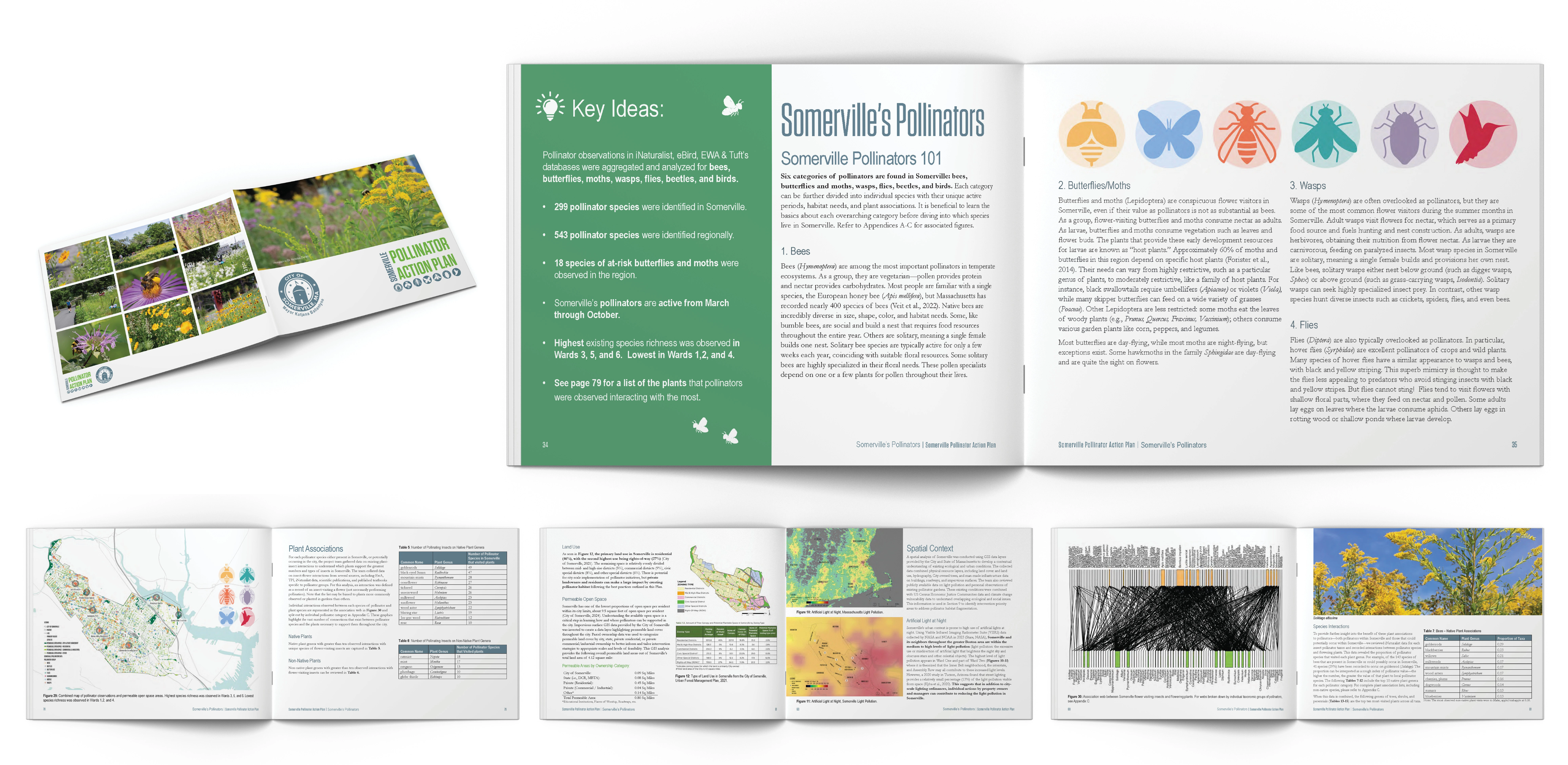 The Somerville Pollinator Action Plan is a first-of-its-kind urban pollinator research and policy framework, envisioning a city where biodiversity grows alongside community. Pollinator decline—projected at 30% insect loss over the next 20 years—demands urgent attention. iNaturalist and community observation data was mapped to create a baseline of known local pollinators. The plan details pollinator support strategies with both science and aesthetics in mind, including original ecological research, plant lists, revamped municipal policy and maintenance practices, and a ‘Pollinator Pantry’ of 40+ regionally specific planting ‘recipe cards.’ The methodology and open-source framework is replicable across the US to support urban biodiversity.