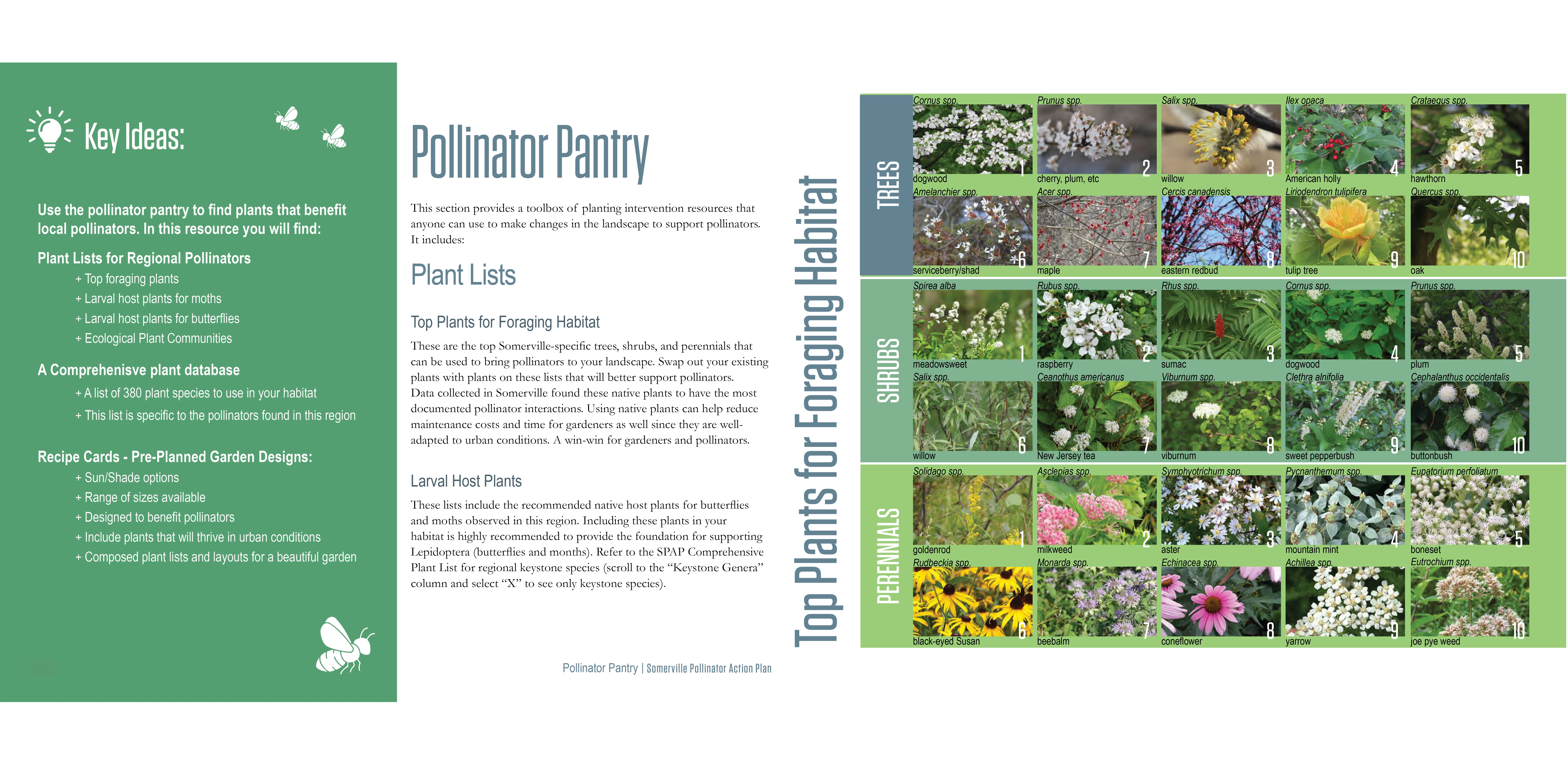 Modifying conventional landscape practices is critical to making cities more pollinator- and people- friendly. Somerville, MA is the most densely populated city in New England, with only .17 sq miles of publicly owned pervious land. Interventions must occur both at the residential scale and on public lands. The SPAP, developed with scientists, public officials, landscape architects, and community leaders, delivers original urban pollinator research and a format for intervening immediately at both small and large scales. Cities have a critical role to play in reconnecting landscapes to pollinators and people to pollinators.