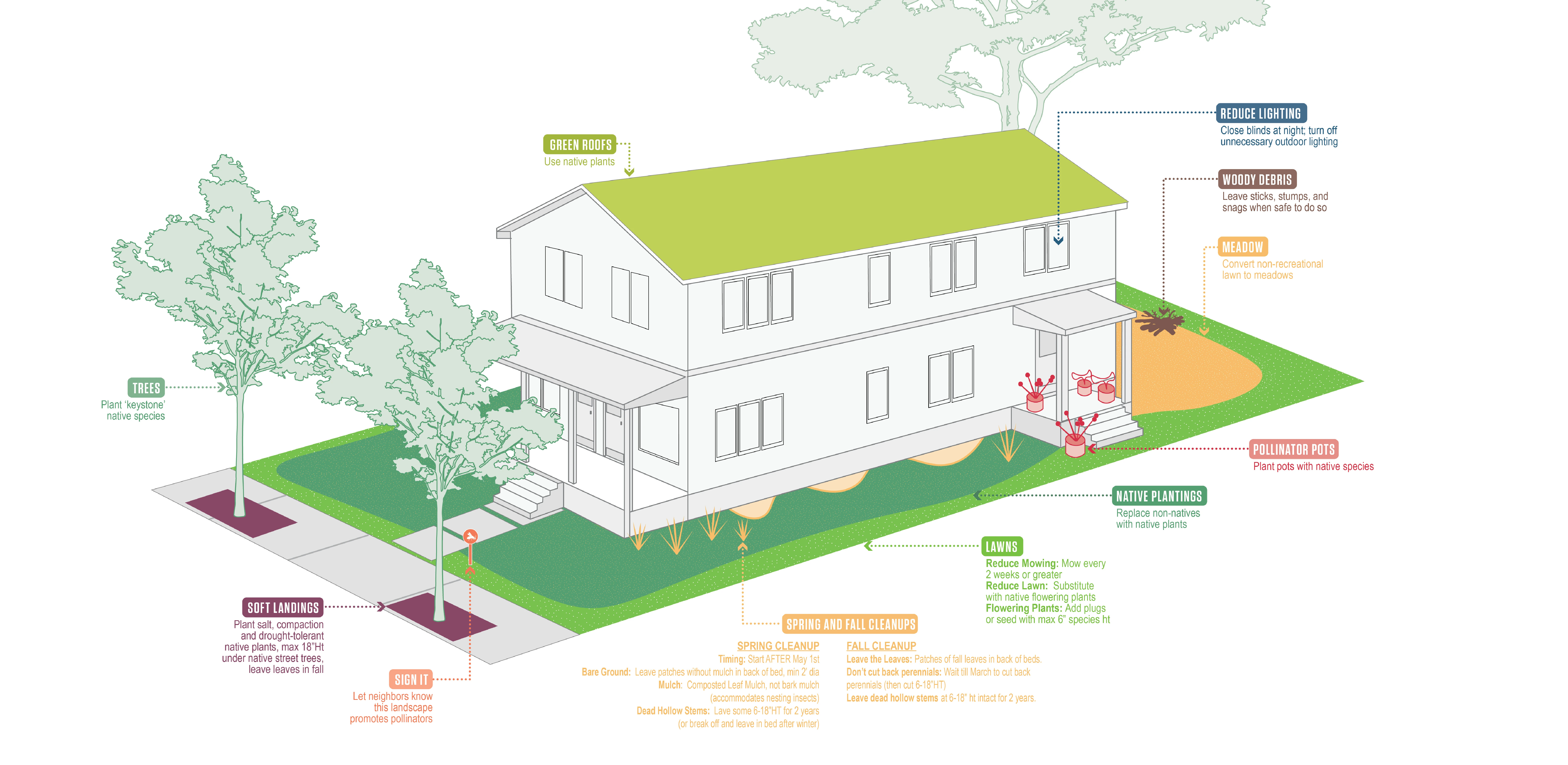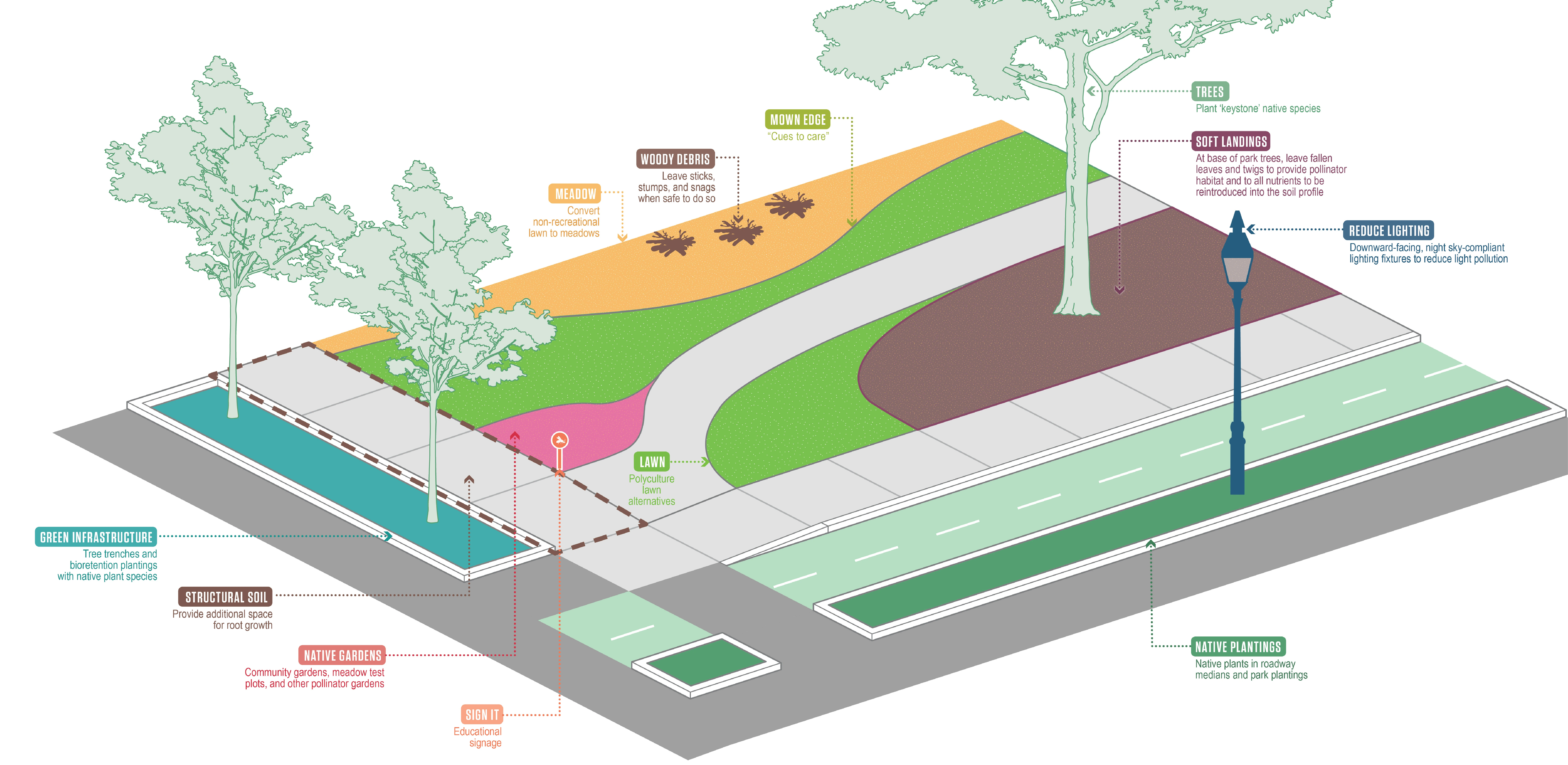 Public policy recommendations include revisions to lighting, maintenance, native plant and green roof ordinances. These small modifications have a big impact on urban pollinator health.