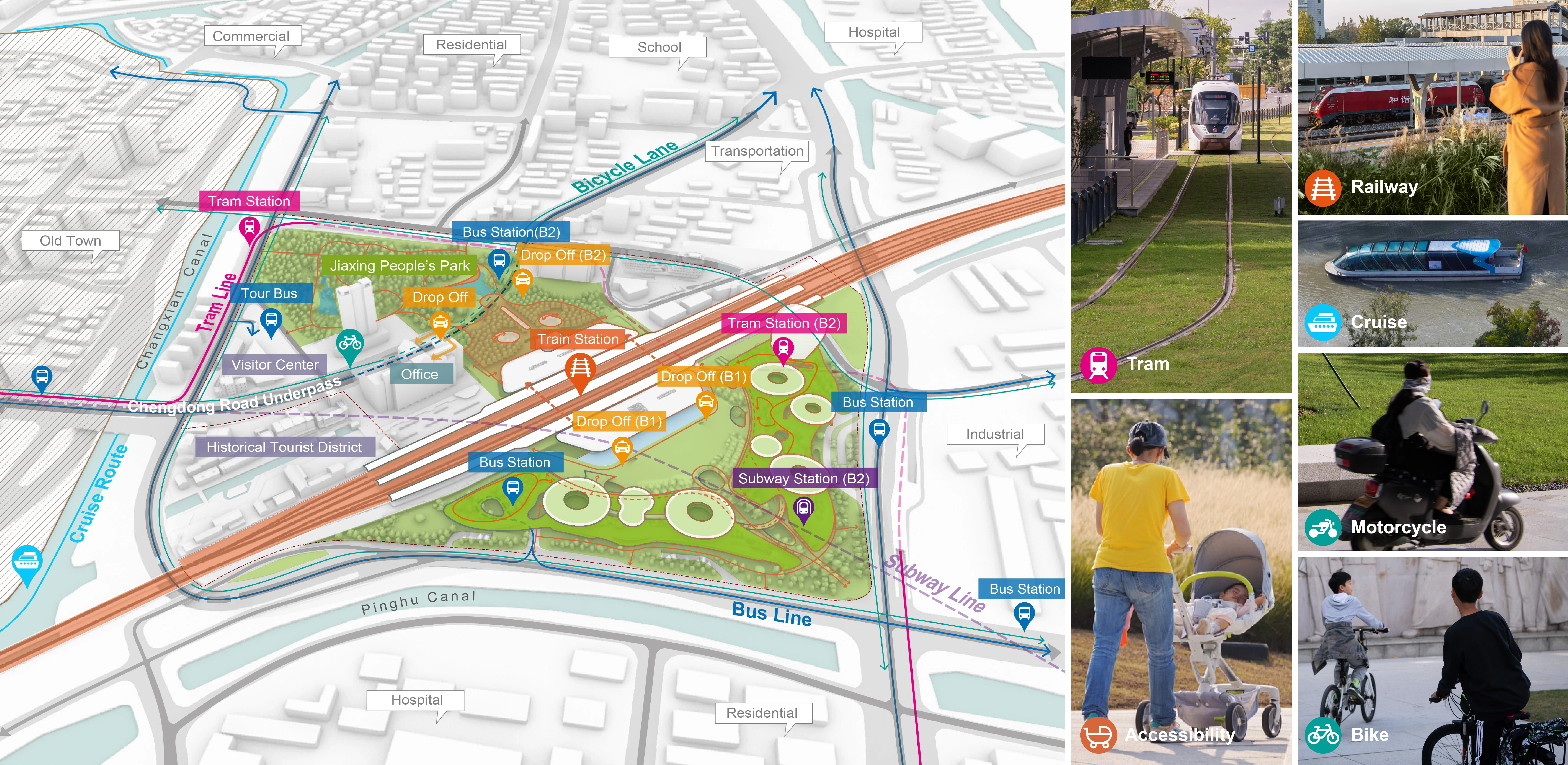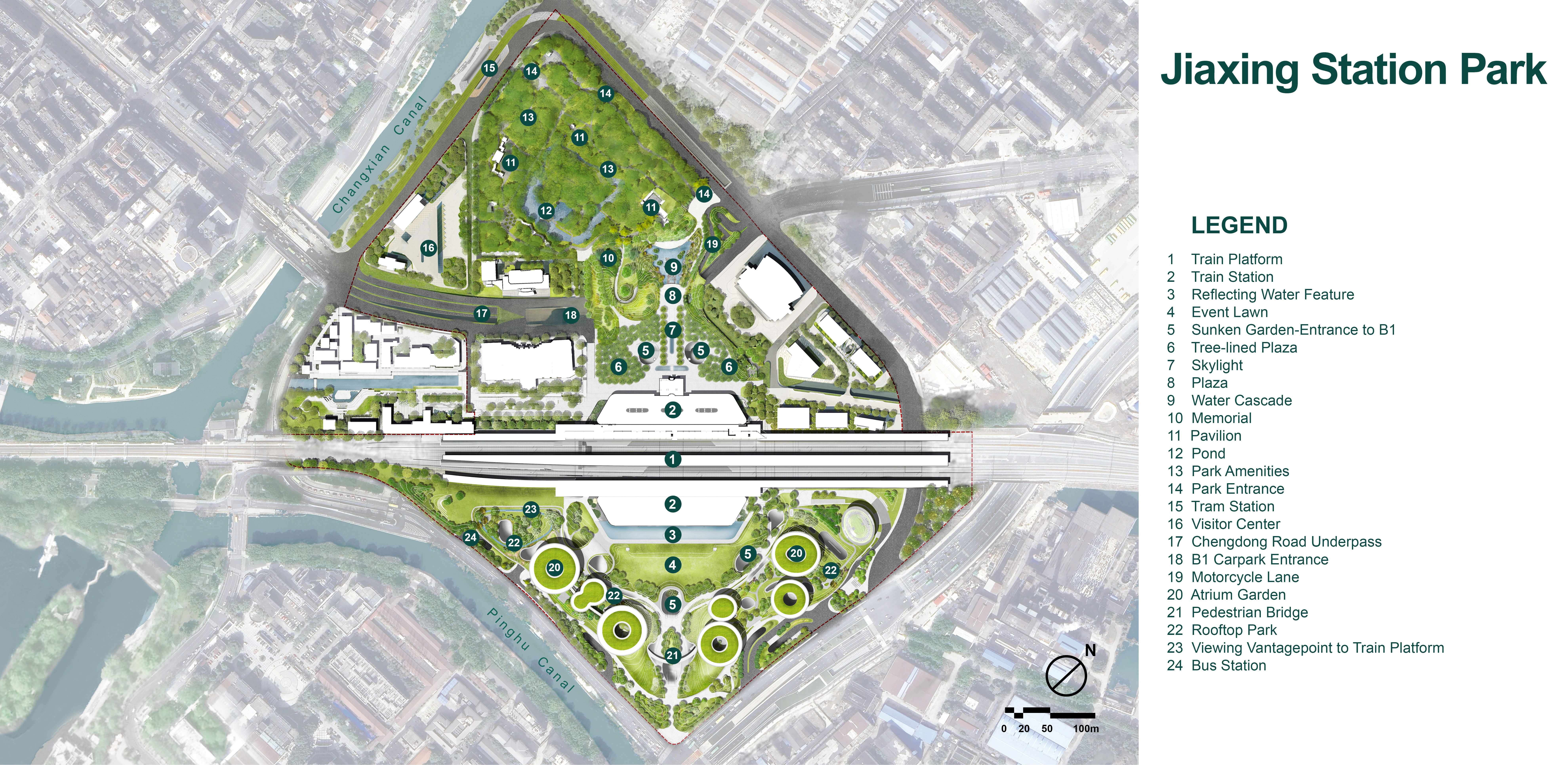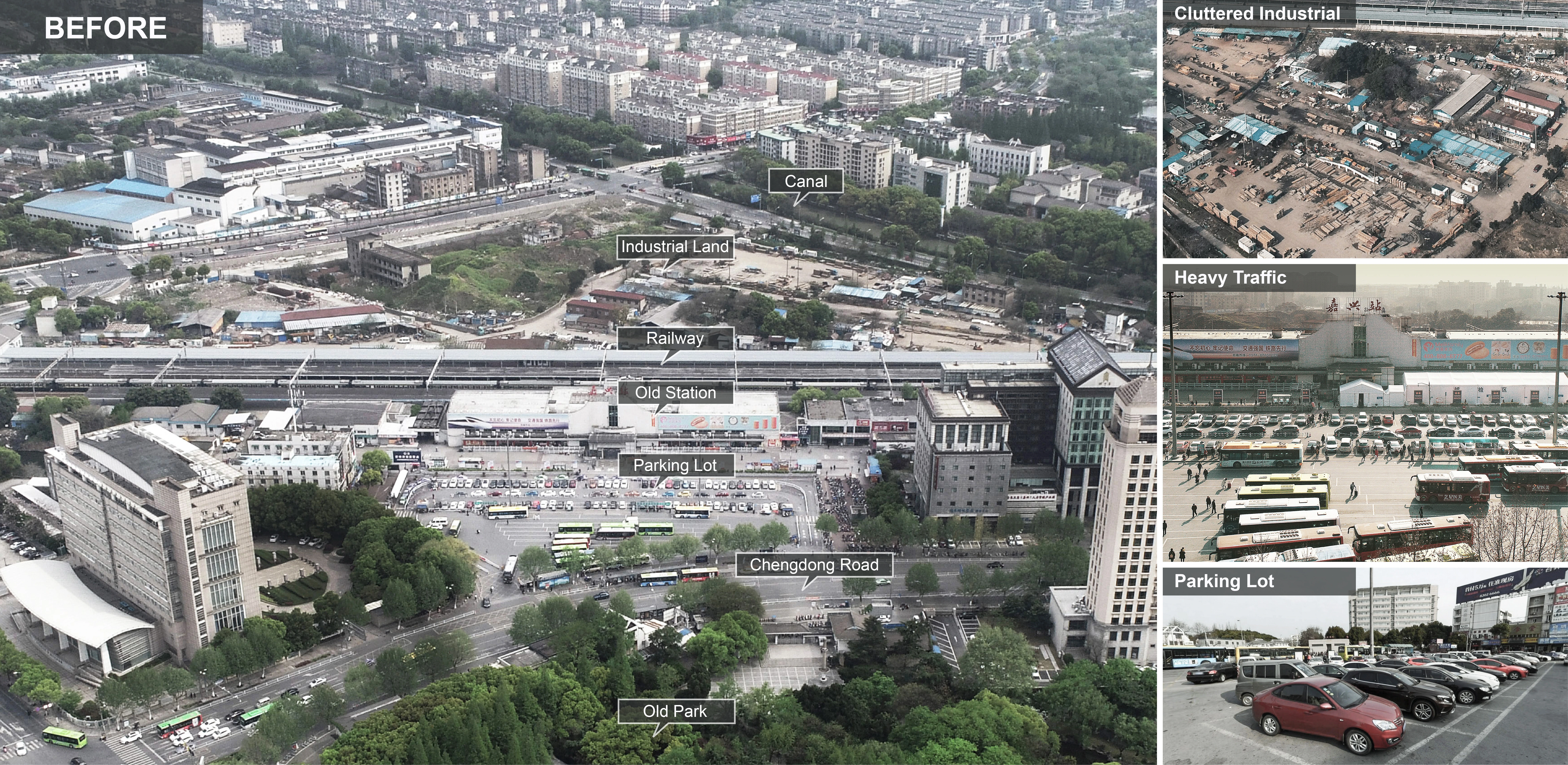 Conceived as "a station in nature," Jiaxing Station Park was established as a catalyst for Transit Oriented Districts (TODs) in the ever-evolving urban fabric. Over the past few decades, the Jiaxing station area, a traditional urban core of 87.5 acres, has experienced long-term urban decay, low walkability, heavy traffic congestion, degraded environments and poor air quality. The railway and Chengdong Road divide the city and cut through communities, with disorganized parking lots to the north and deteriorating industrial land to the south.