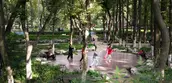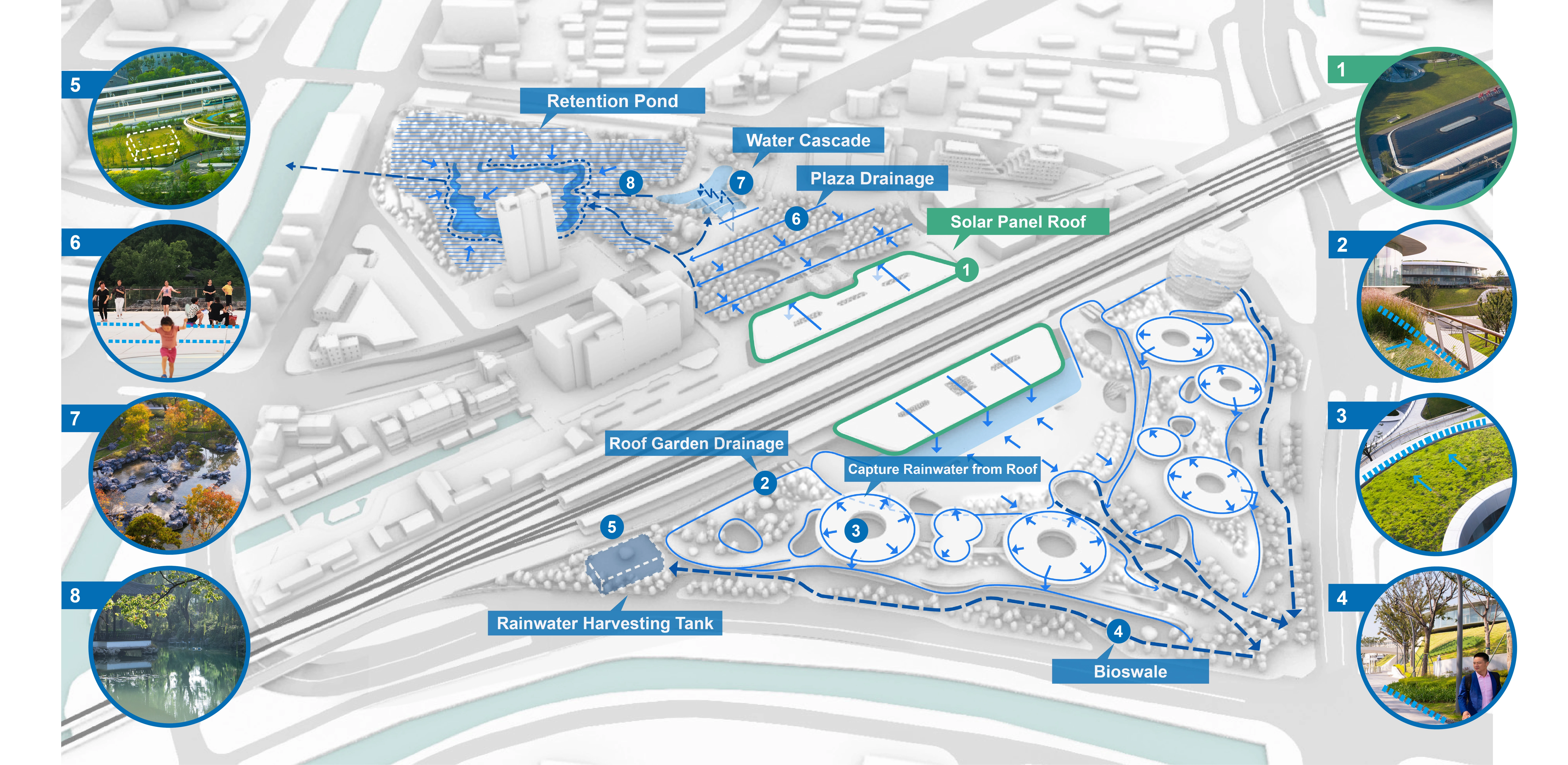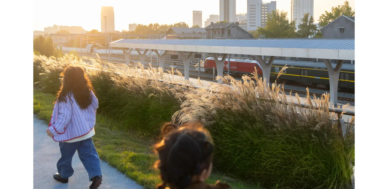 The park showcases civic and cultural spaces deeply rooted in the city's history. Abundant designed spaces beneath the woodland canopy offer neighbors the opportunity to engage in traditional activities such as Taiji, Kung Fu, singing, playing musical instruments, playing Go and Chinese chess, and writing calligraphy on the ground, especially during the hot summer months. The tree-lined plaza becomes a favorite space for locals to engage in square dancing, festival gatherings, as well as for students to join the English corner. The rooftop park is the first in the country to offer visitors a unique experience of overlooking the bustling train platform.