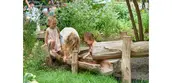 In the Little Prairie, the existing grade change was utilized to design an active street edge with benches and climbing features, inviting neighbors to socialize while watching children play. The benches, steppers, runnels and balance beams were crafted from trees that were removed due to disease. In total, three trees were repurposed: two black locusts and one bur oak. To honor their origins, the trees' locations have been engraved onto their surfaces.