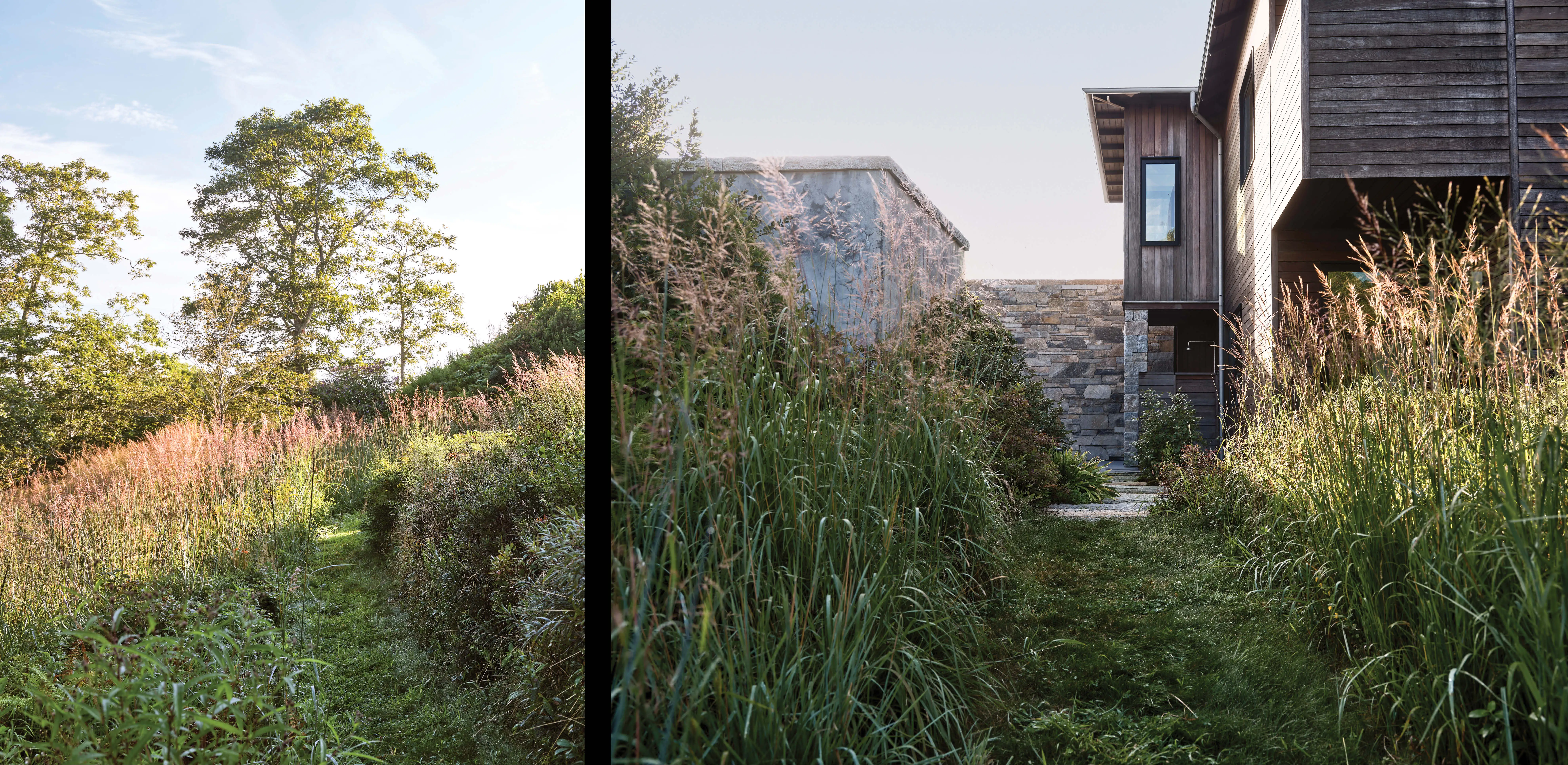 By the time the landscape architects joined the project, much of the land had already been cleared for house construction, leaving behind a barren, lifeless expanse surrounded by a sculptural beech, oak, and pine forest. Rather than replant the forest, the team embraced a successional native plant palette, crafting a mosaic of unique species assemblages that grew quickly into a thick vegetative armor that adapts to everchanging weather patterns. The challenge was to invite wanderlust through experiences that engage the site’s topography and to stimulate the island’s unique ecologies to return to the site where mature woodland once stood. The resulting landscape blends strength with beauty, offering dynamic multiseasonal interest, increased habitat, and expansive biodiversity.