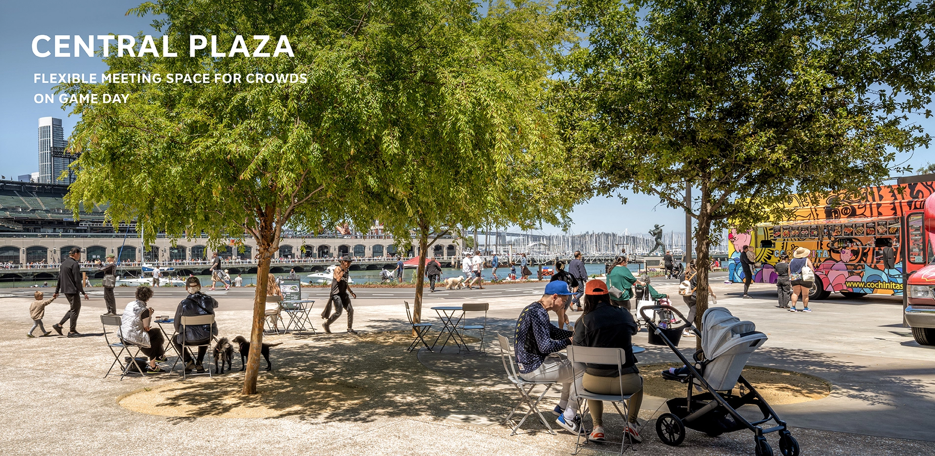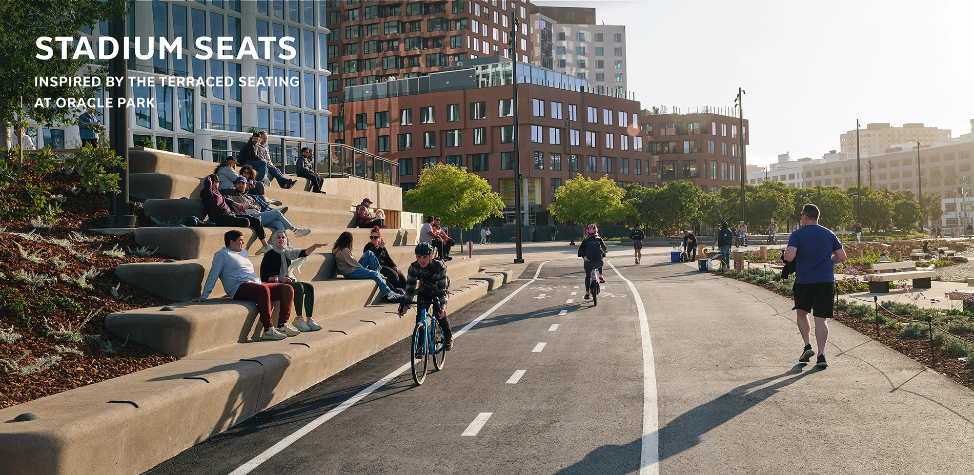 Just past the Grove, the Central Plaza captures the energy of the ballpark, Mission Rock neighborhood, and surrounding communities. It features an all-gender restroom integrated into the topography. To the north, the Shoreline Sands bring visitors closer to the waterfront. Inspired by textures of local beaches, the area features reclaimed eucalyptus logs as interactive seating. Further east, the Stadium Seats encourage groups to gather and watch the action at Oracle Park across McCovey Cove. The seats mirror the terraced form of the seating at the ballpark.