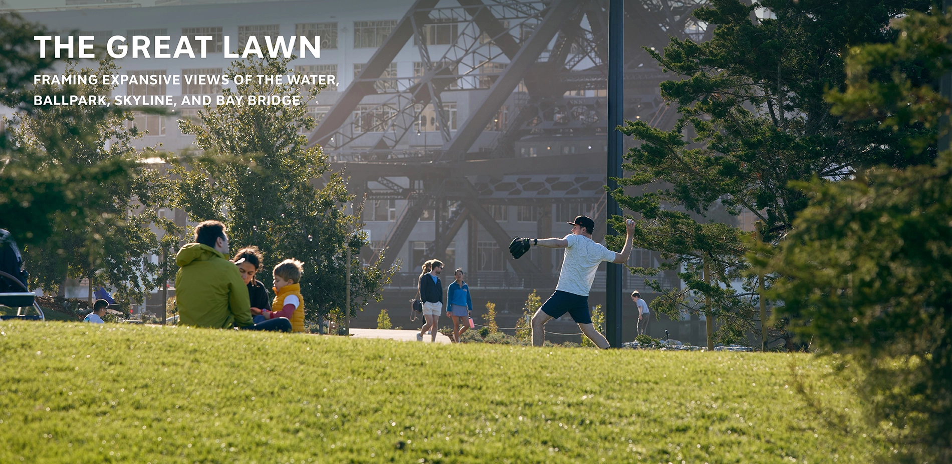 Framing views of the water, ballpark, skyline, and Bay Bridge, the Great Lawn offers flexible space for play, gathering, cultural events, picnicking, and reflection. Sculpted to create the illusion of undulating green space spilling into the water, the lawn is surrounded by Monterey cypress trees, reminiscent of the region’s headland landscapes.