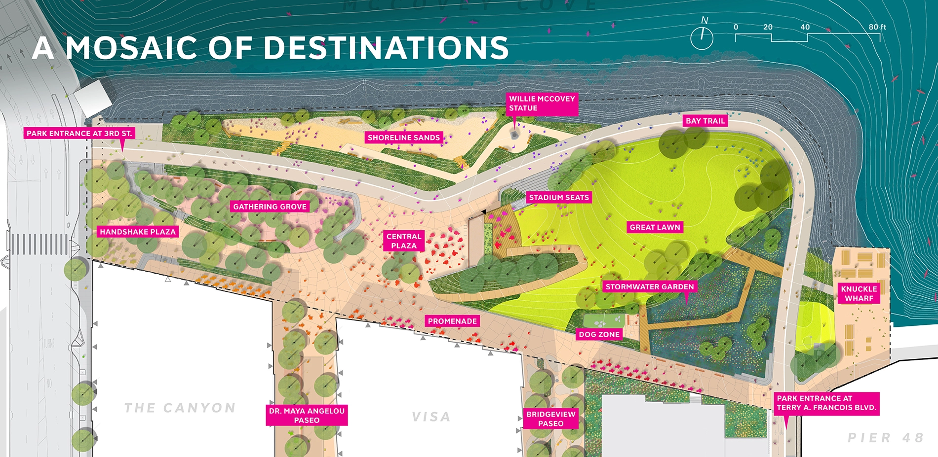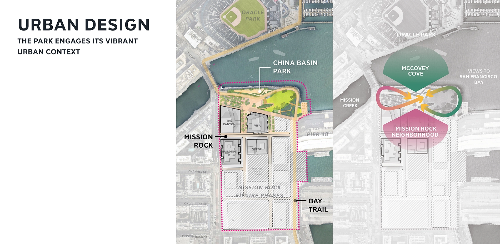 Foregrounding the living systems of the San Francisco Bay, China Basin Park is a 5-acre waterfront park designed and built as the heart of Mission Rock, a new mixed-use neighborhood across from Oracle Park, home of the San Francisco Giants. With dramatic views, diverse amenities, and strong connections to the wider community, China Basin Park is a symbol of optimism for the city. The park welcomes visitors on quiet mornings to experience intertidal ecology and birdwatching and transforms into a vibrant plaza on lively game days when it becomes an extension of the San Francisco Giants ballpark and a place to meet friends and watch the game.