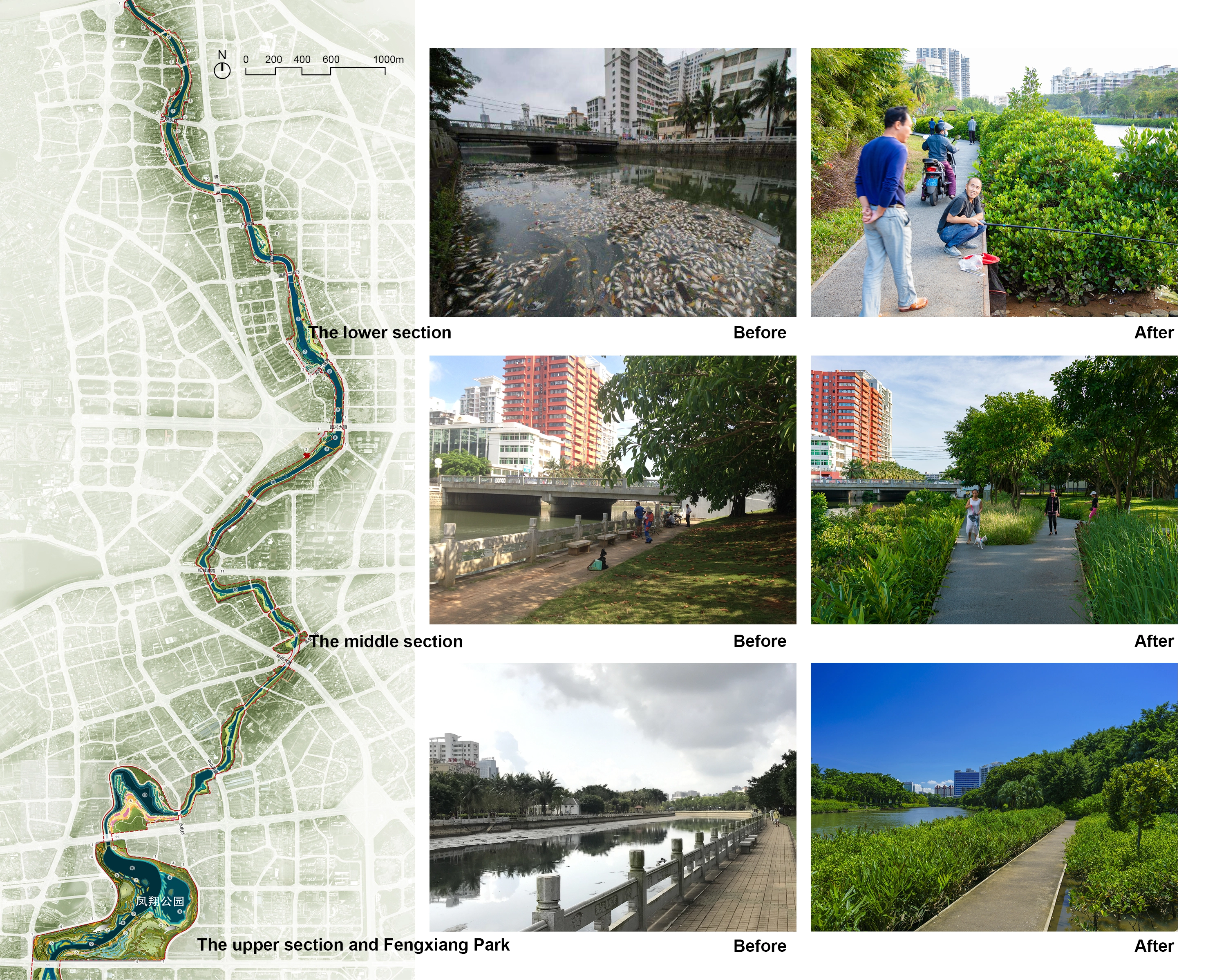 Rapid urbanization in Haikou, a tropical city in China, led to a population boom and neglect of natural water systems. The 23-kilometer Meishe River, previously a sewage-filled concrete canal, exemplified these challenges. Fragmented solutions had failed, worsening the condition. In 2016, the landscape architect was commissioned to revitalize the river and the 80-hectare Fengxiang Park at the river bank. This redevelopment enhanced the ecological landscape and addressed the growing population's social needs.