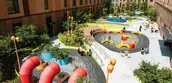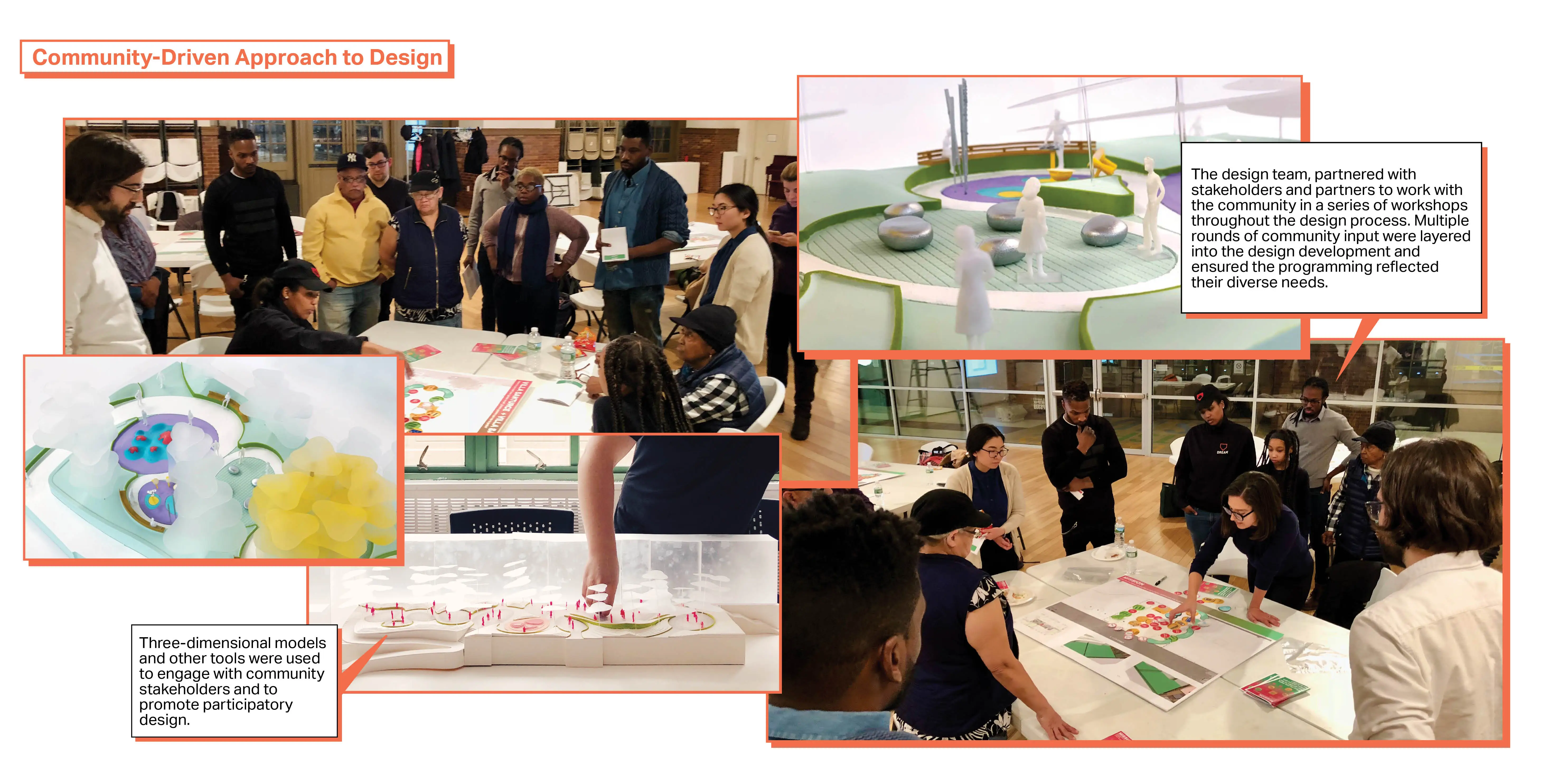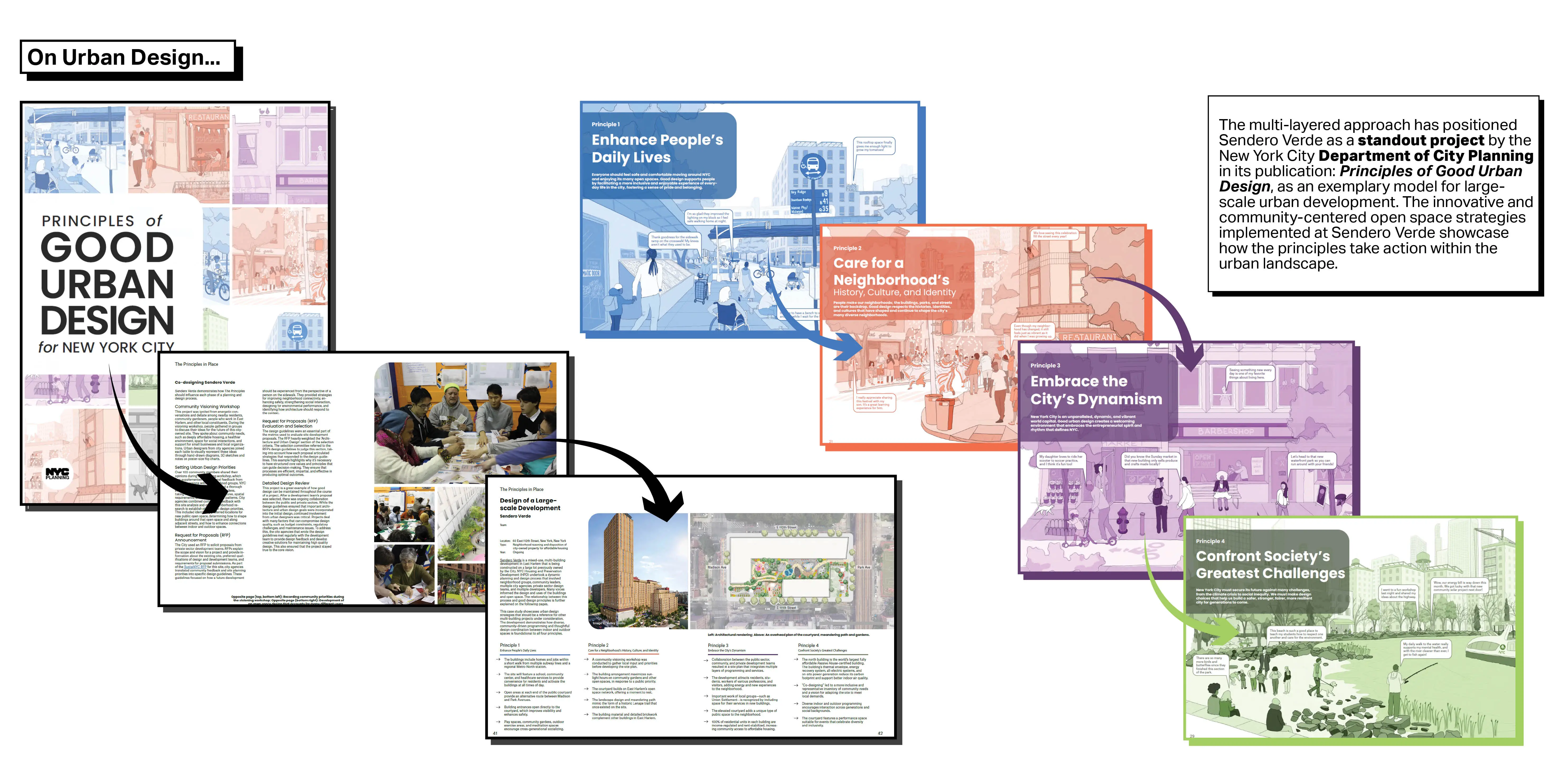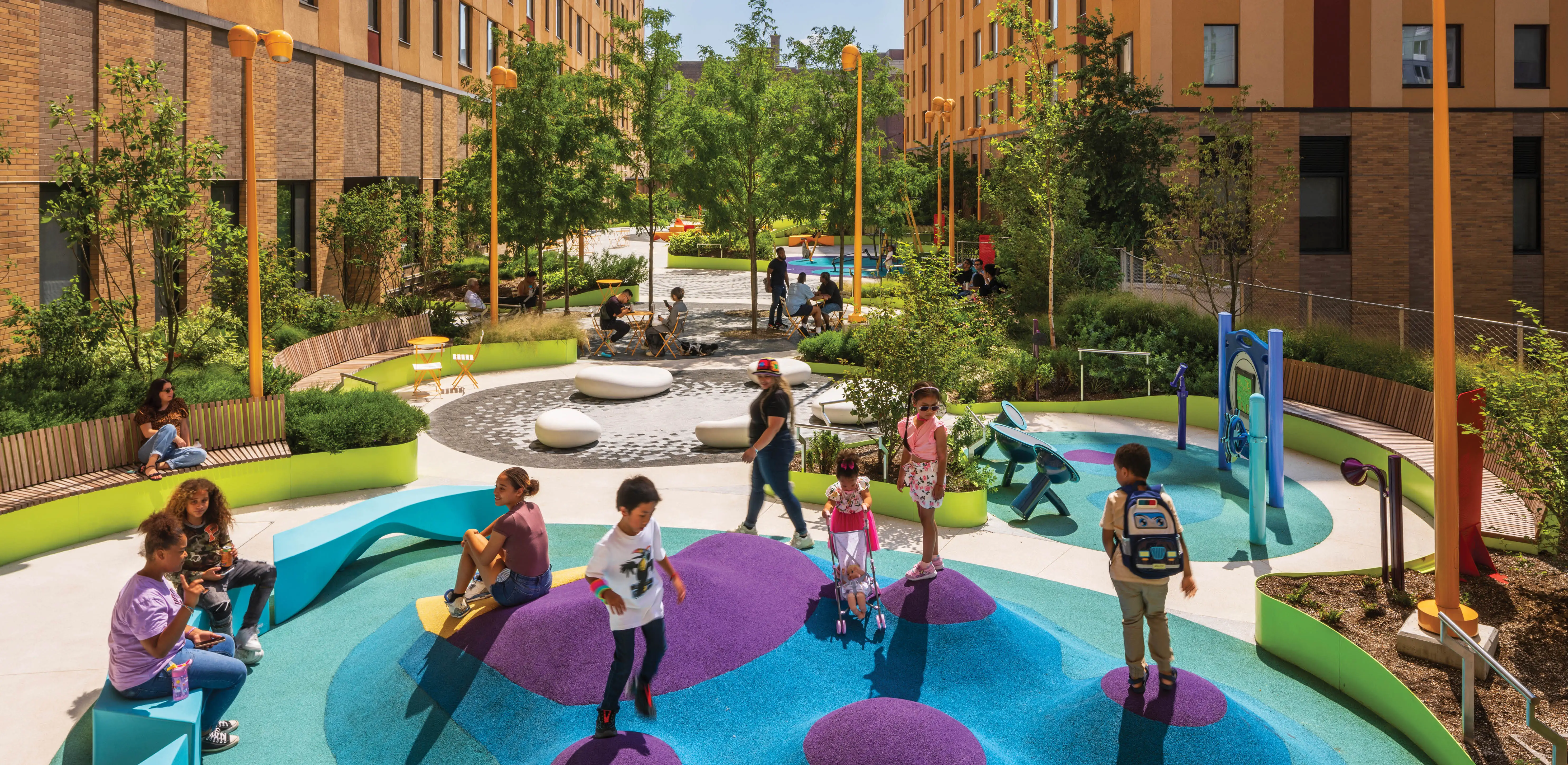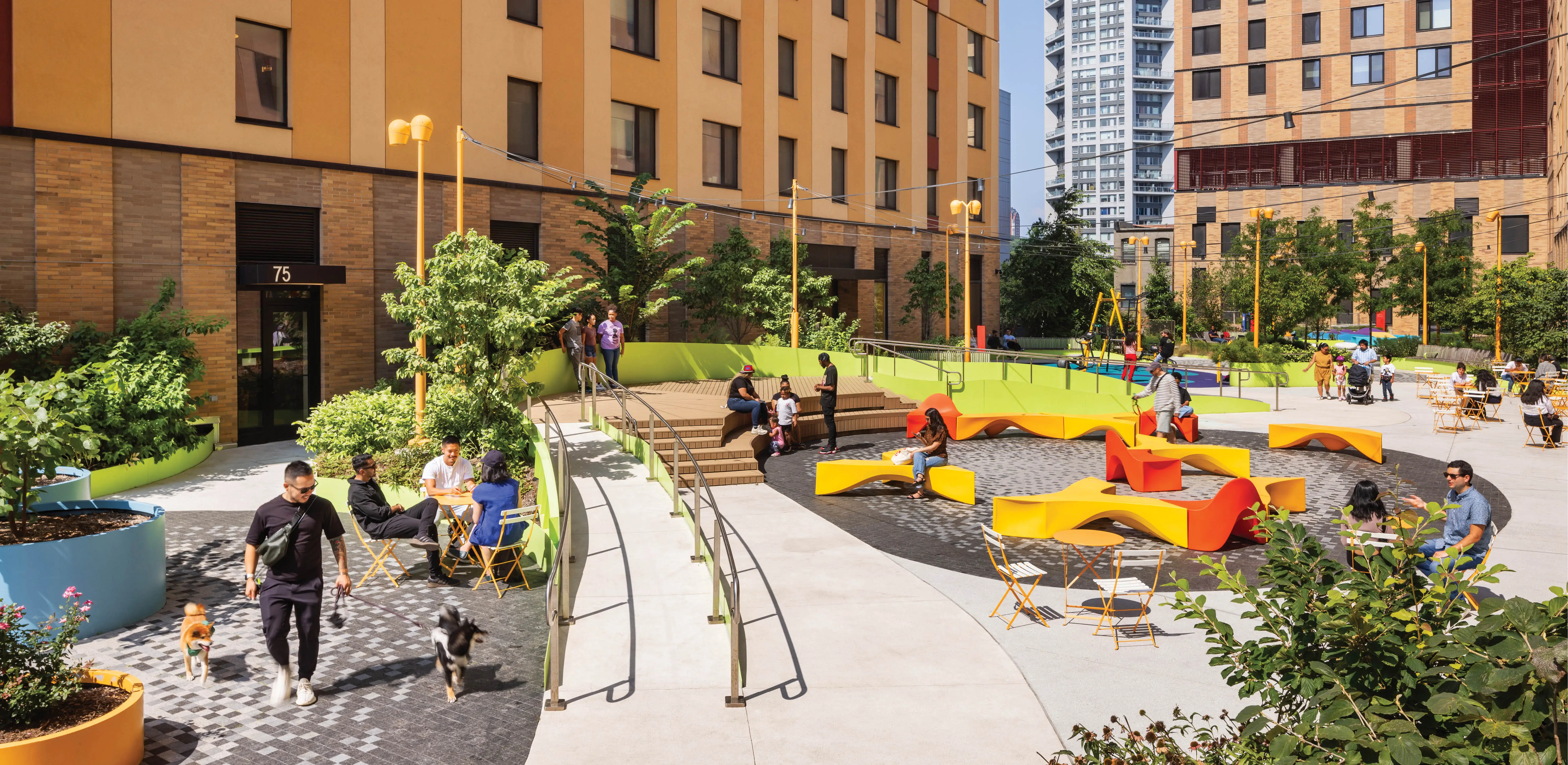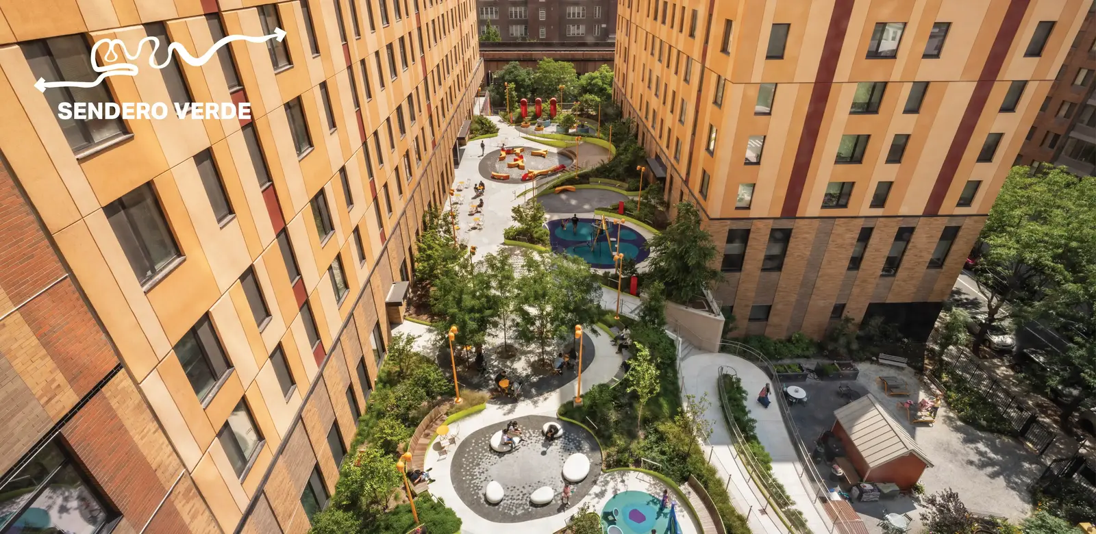 Sendero Verde serves over 700 households in a sustainable, fully affordable development that is the world’s largest Passive House-certified project. The heart of the complex is the publicly accessible elevated courtyard, a shared green space intentionally positioned above street level to offer a peaceful, protected environment. The courtyard features intimate pods for quiet conversation, interactive zones for exercise and play, and a spacious plaza with a performance podium, which hosts community gatherings, cultural celebrations, and artistic performances. This area is specifically designed to foster a strong sense of belonging and social cohesion, celebrating the diverse cultural identity of East Harlem.