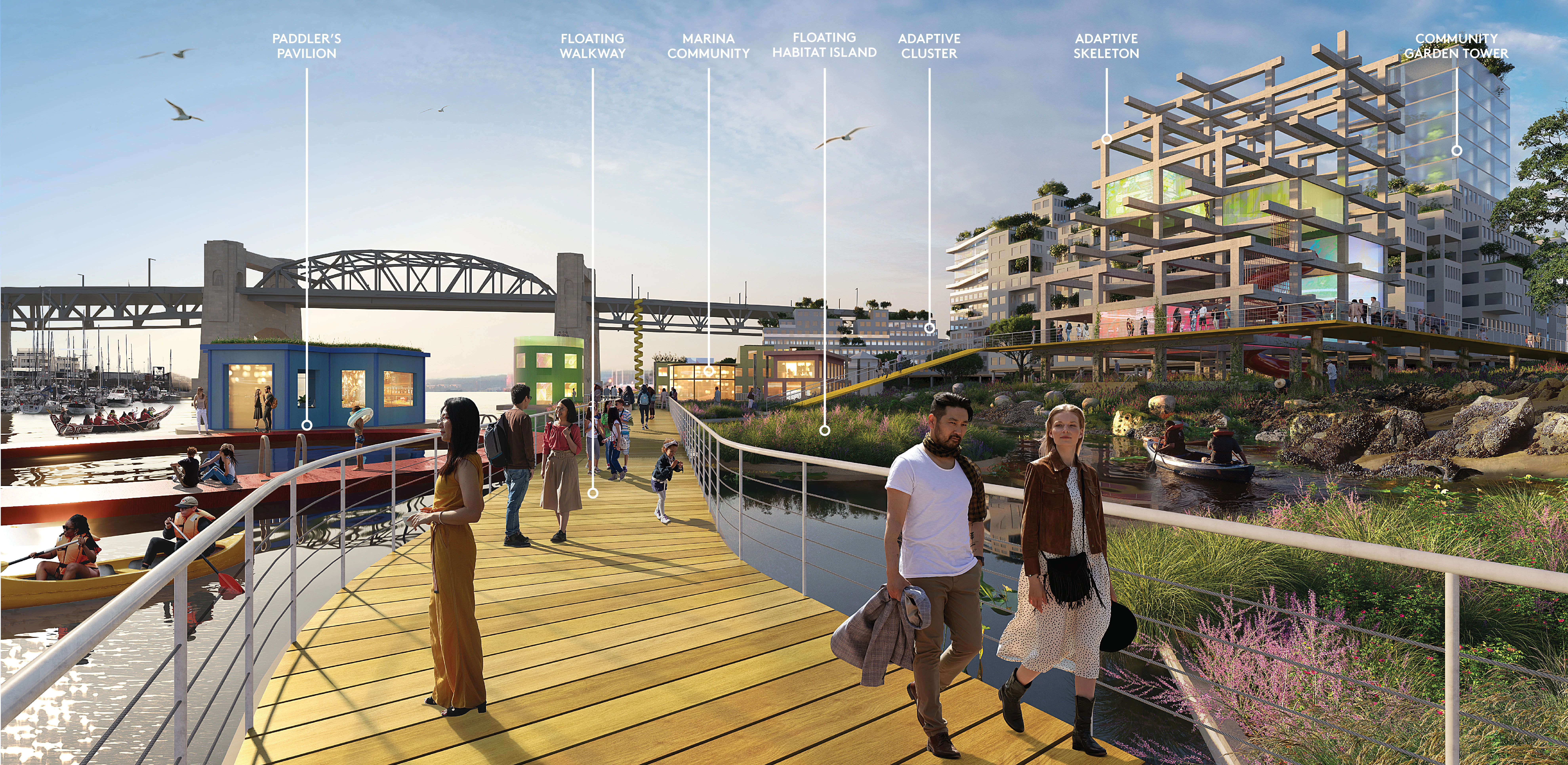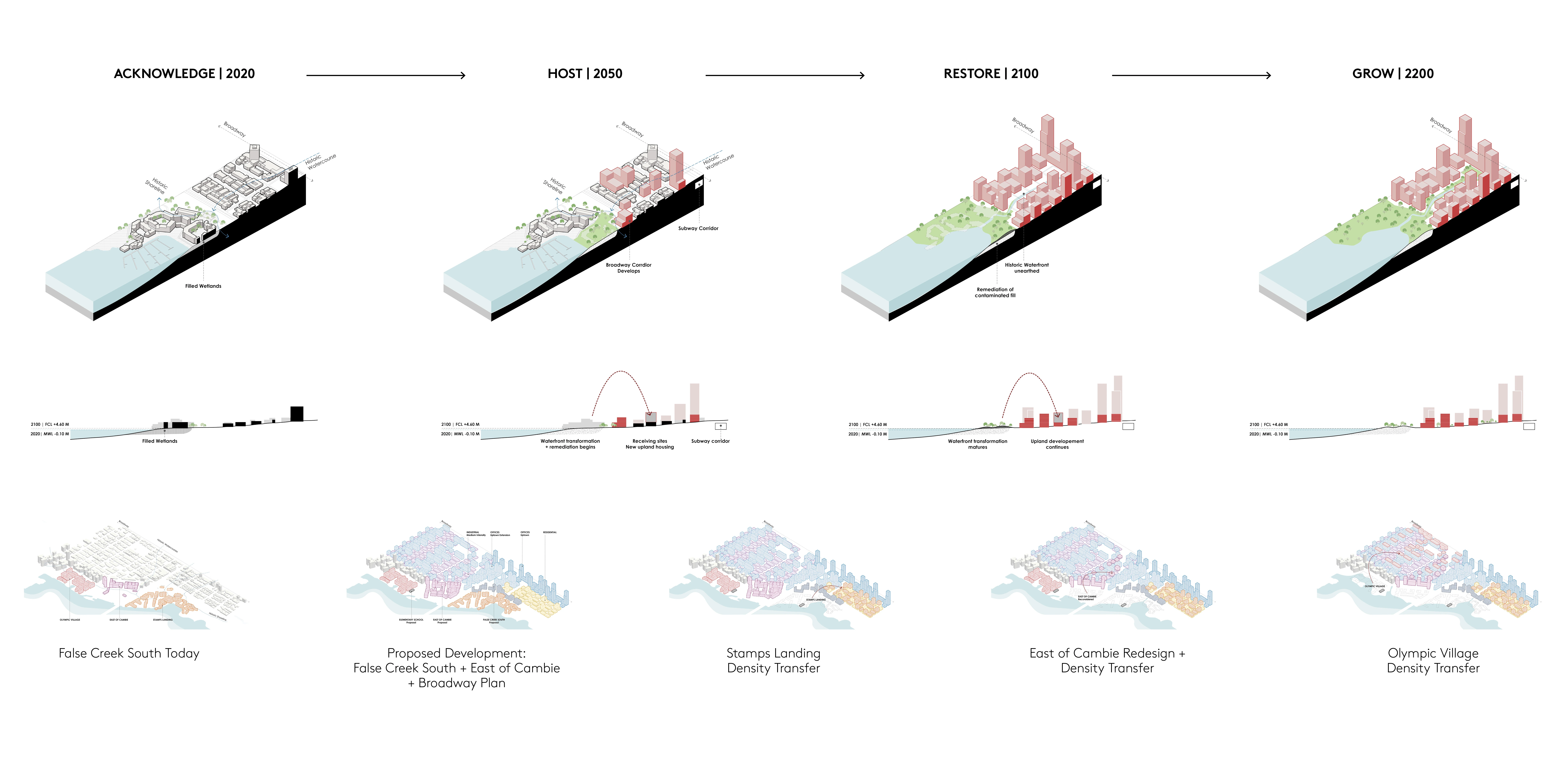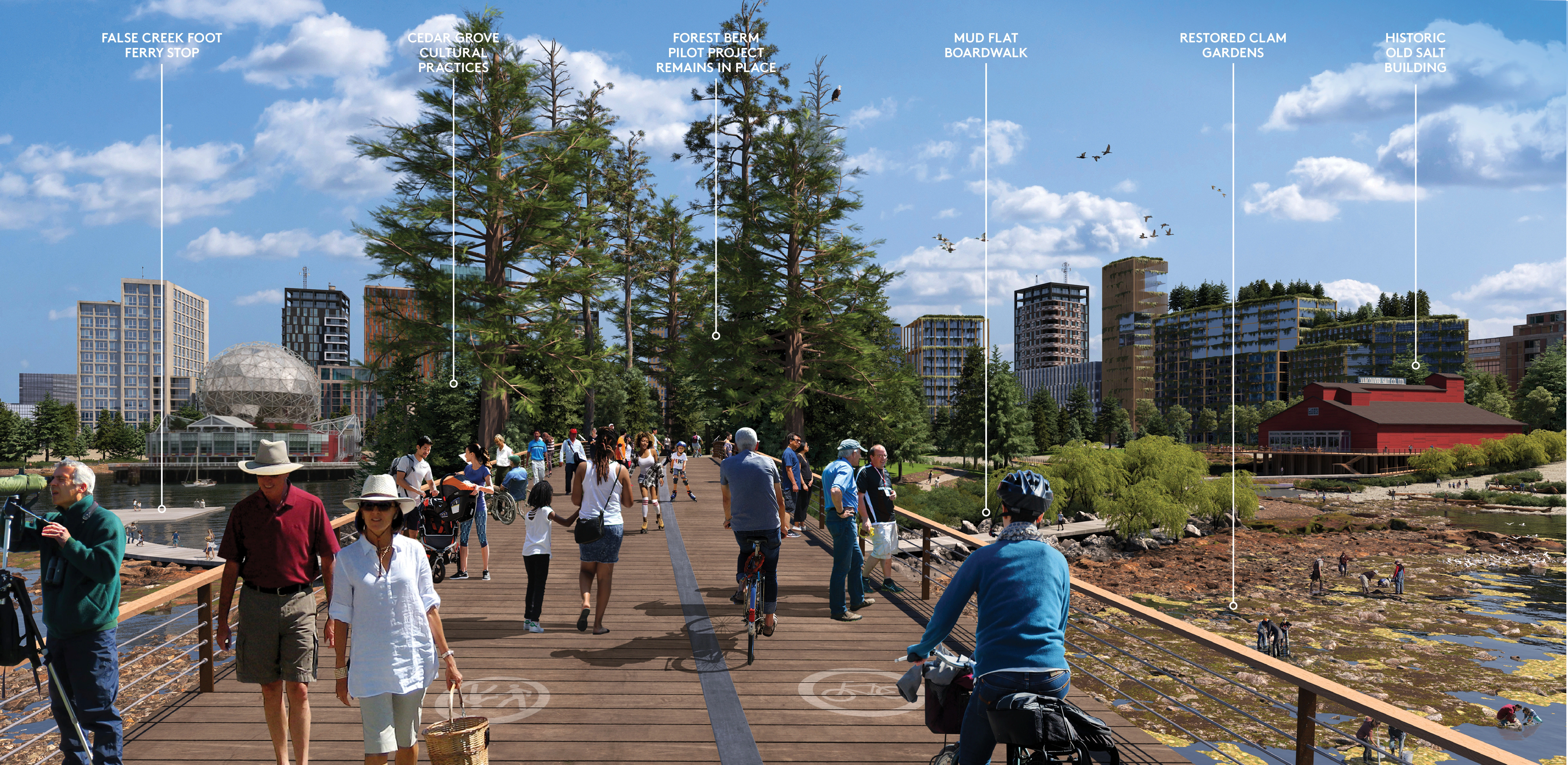 RECIPROCITY AND EXCHANGE Vancouver is situated on the unceded traditional homelands of the xwməθkwəy’əm (Musqueam), Skwxwú7mesh (Squamish), and səlilwətaɬ (Tsleil-Waututh) Host Nations. The area currently known as False Creek has significant meaning to Host Nations who have stewarded the land since time immemorial. Today, the shoreline is a major destination for residents and visitors, and vulnerable to flooding as sea level rises to one meter and beyond in the coming century. The Sea2City Design Challenge was a 12-month initiative to reimagine Vancouver's False Creek shoreline in the context of reconciliation between Host Nations, the City, the province and wider community. Embodying values of reciprocity and exchange, this challenge positioned teams as collaborators rather than competitors, with shared cultural advisors and “collaboratorium” workshops with the city and both teams. The design outcomes inform a framework and vision that prioritizes reconciliation with Host Nations to guide City and regional Coastal Adaptation Plans.