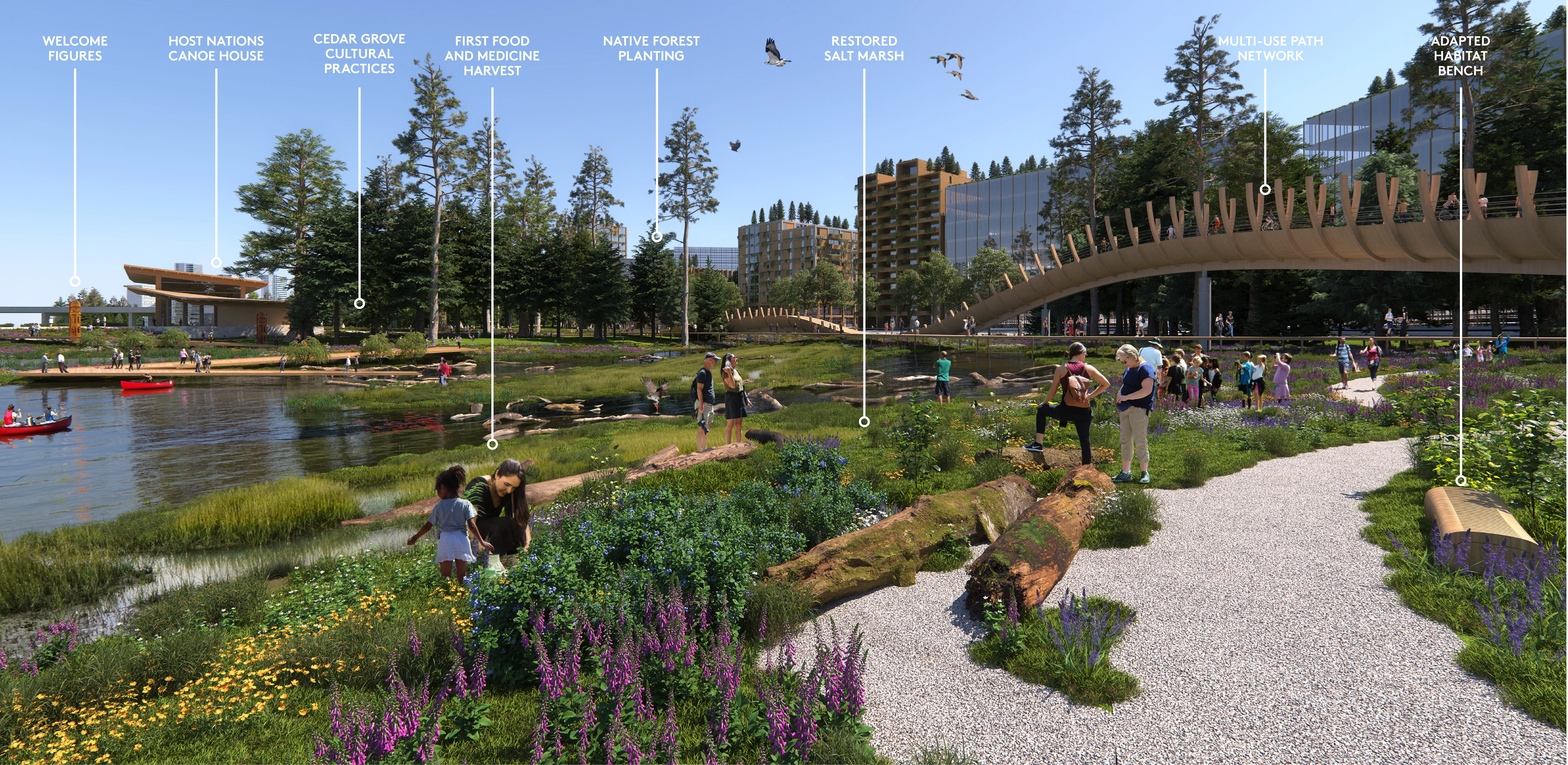 IMMEDIATE IMPACT OF RECONCILIATION AND RELATIONSHIP BUILDING This work is being consistently integrated into regional agency and city department work. It has inspired the city to change direction on existing land use decisions and informs the City’s overarching Coastal Adaptation Plan. Implementation is well funded, including the floating walkways pilot project which is under construction. This work set a precedent for future planning methods and created foundations for meaningful reconciliation. In 2024 the Canada Society of Landscape Architects recognized the project with a National Award of Excellence in Communication and the top Jury's Award of Excellence, given to one project annually that best demonstrates the CSLA's vision of advancing the art, science, and practice of landscape architecture.