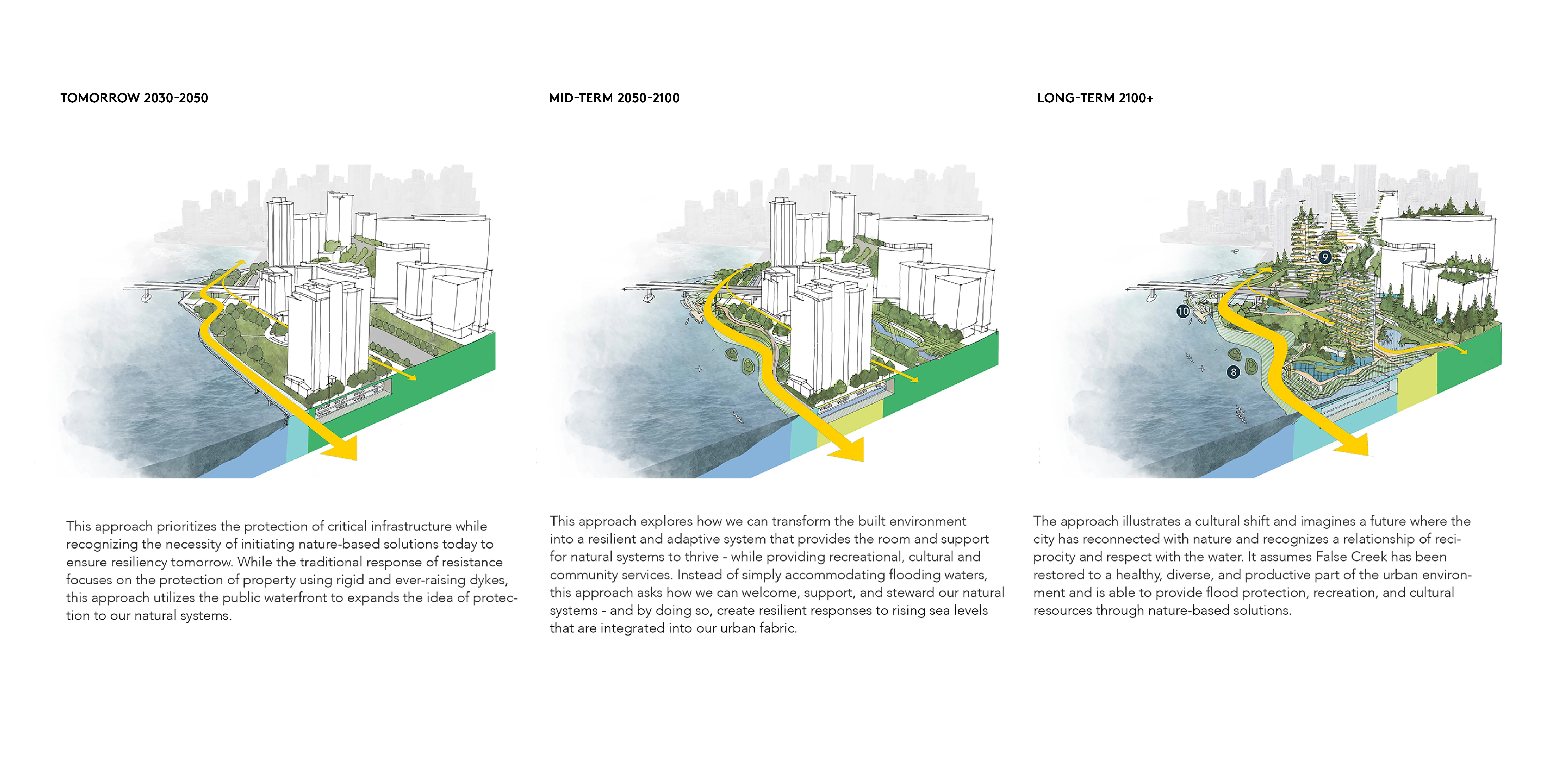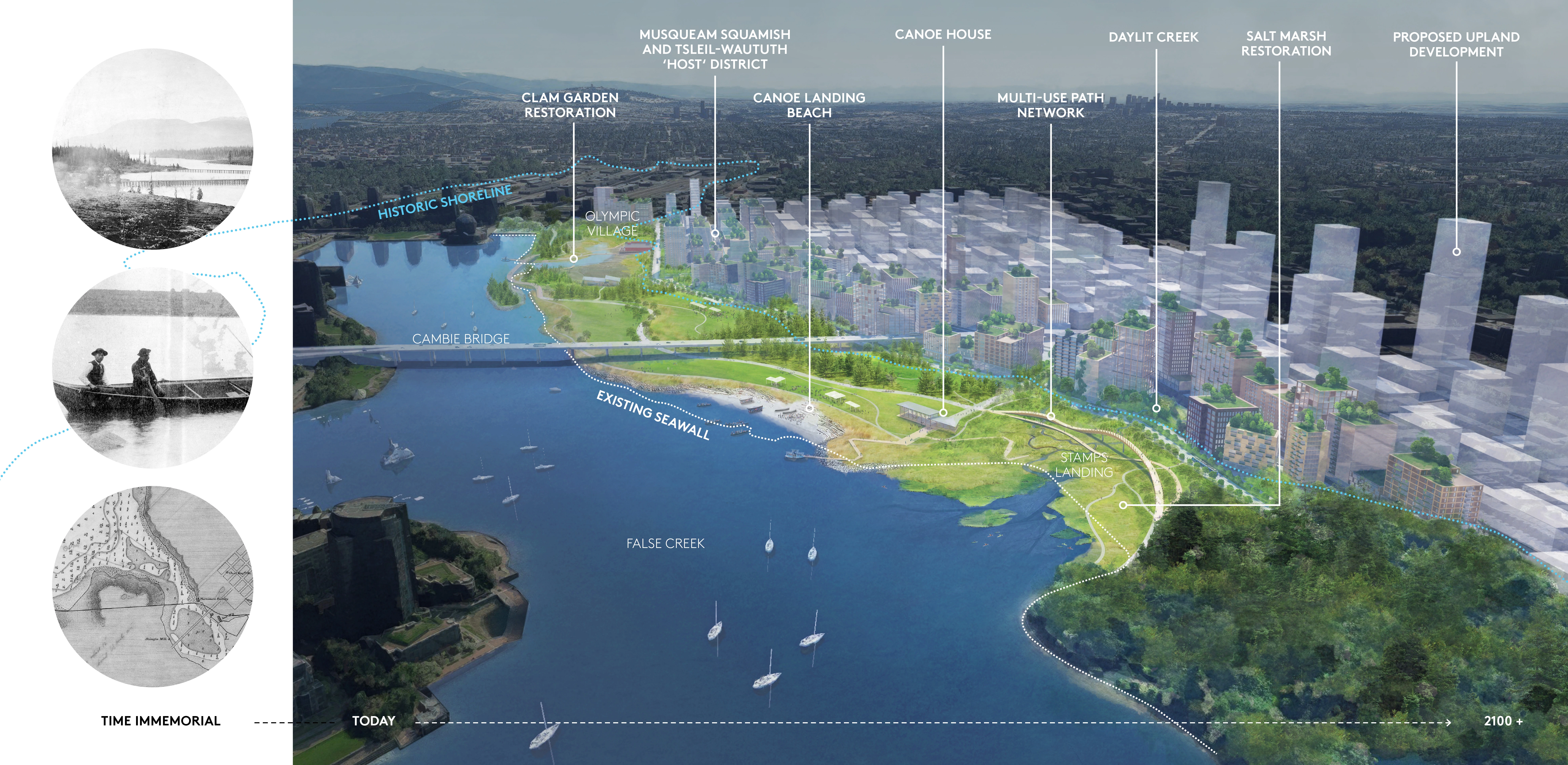 Grounded in the city of Vancouver B.C.’s commitment to truth and reconciliation, this nature-based climate adaptation approach envisions a return to the historic False Creek shoreline. A precedent-setting process prompted ongoing, continuous learning between city and province agencies, a youth adaptation lab, cultural artists, designers, the public, and Host Nation cultural advisors. With reconciliation and reciprocity as the foundation, design outcomes represent a future in which Host Nations are active, celebrated partners in the strategic transformation of an ever-changing shoreline over generations. Both visionary and technically informed, this work inspires the practice of adaptation and charts a course for meaningful reconciliation.