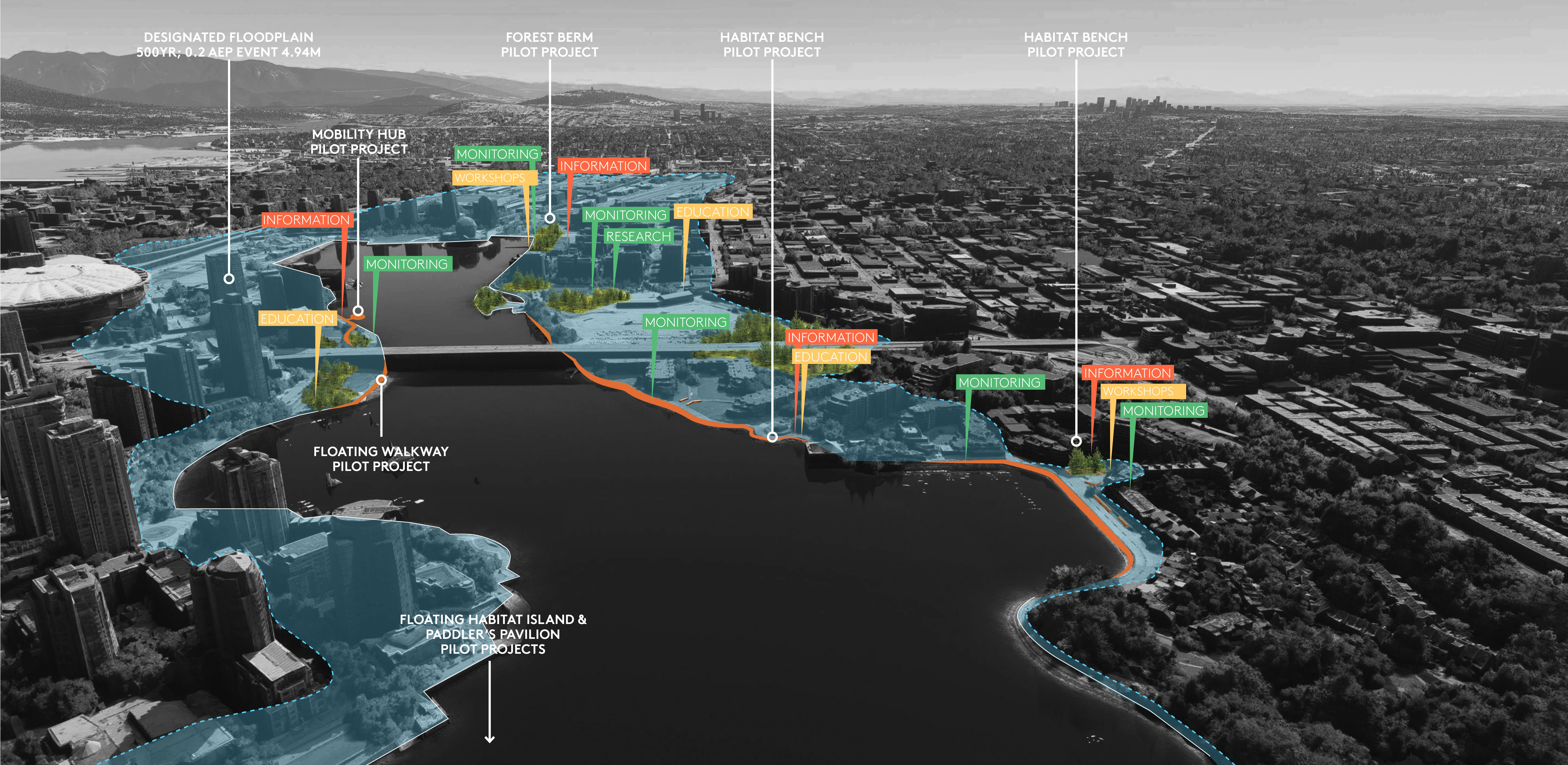 COMPREHENDING THE CLIMATE CRISIS The adaptive design responses illustrated short-term and long-term design opportunities to protect and adapt the promenade and surrounding land and water scapes. Responding to the urgent need for shared comprehension of the climate crisis, curated cultural events specific to climate adaptation supported collective learning and capacity building. This work was recognized by the International Association for Public Participation (IAP2), with the Canada Indigenous Engagement Award and the International Project of the Year Award.
