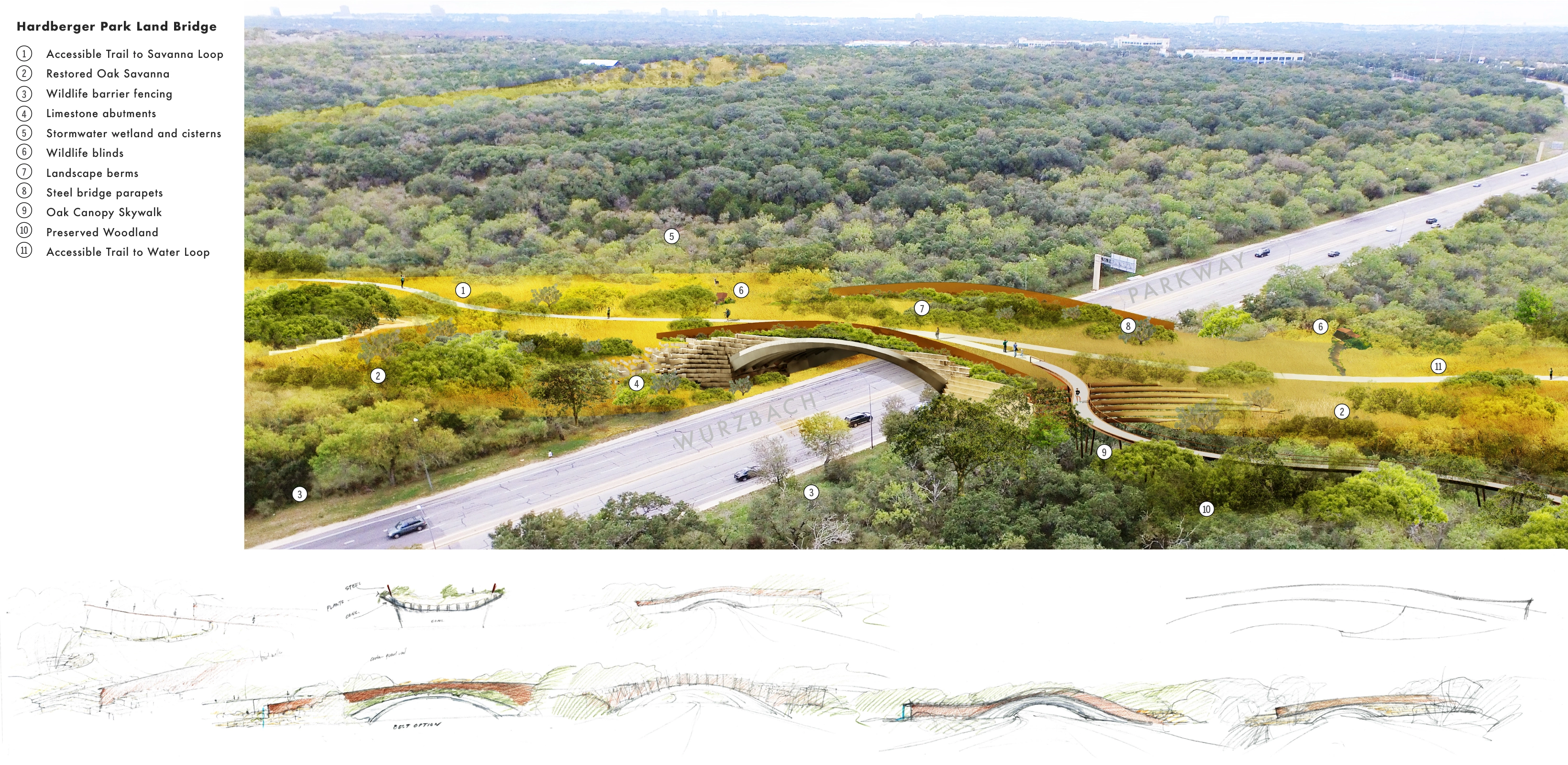 Phil Hardberger Park, is a 330-acre urban park in San Antonio, the 7th largest city in the United States. Designed in phases from 2007-2019, the park opened to the public in 2010 as a cultivated wild, where trails wind through preserved woodlands and restored savanna, with parking, picnic and play carved from scrubland. For over a decade, the park existed as two parcels and the last piece of the Comprehensive Plan, the land bridge, remained unrealized. Six lanes of Wurzbach Parkway severed the landscape, creating a barrier for humans and causing fatal collisions for wildlife migrating along the 38-mile-long Salado Creek. The land bridge was finally realized through a 2017 voter-approved city bond of $13 million and $10 million in grants and donations. It opened to the public in December 2020 and the park sustains 750-1,000 visitors per day. The project demonstrates a union of urban wildness and city-wide activism.