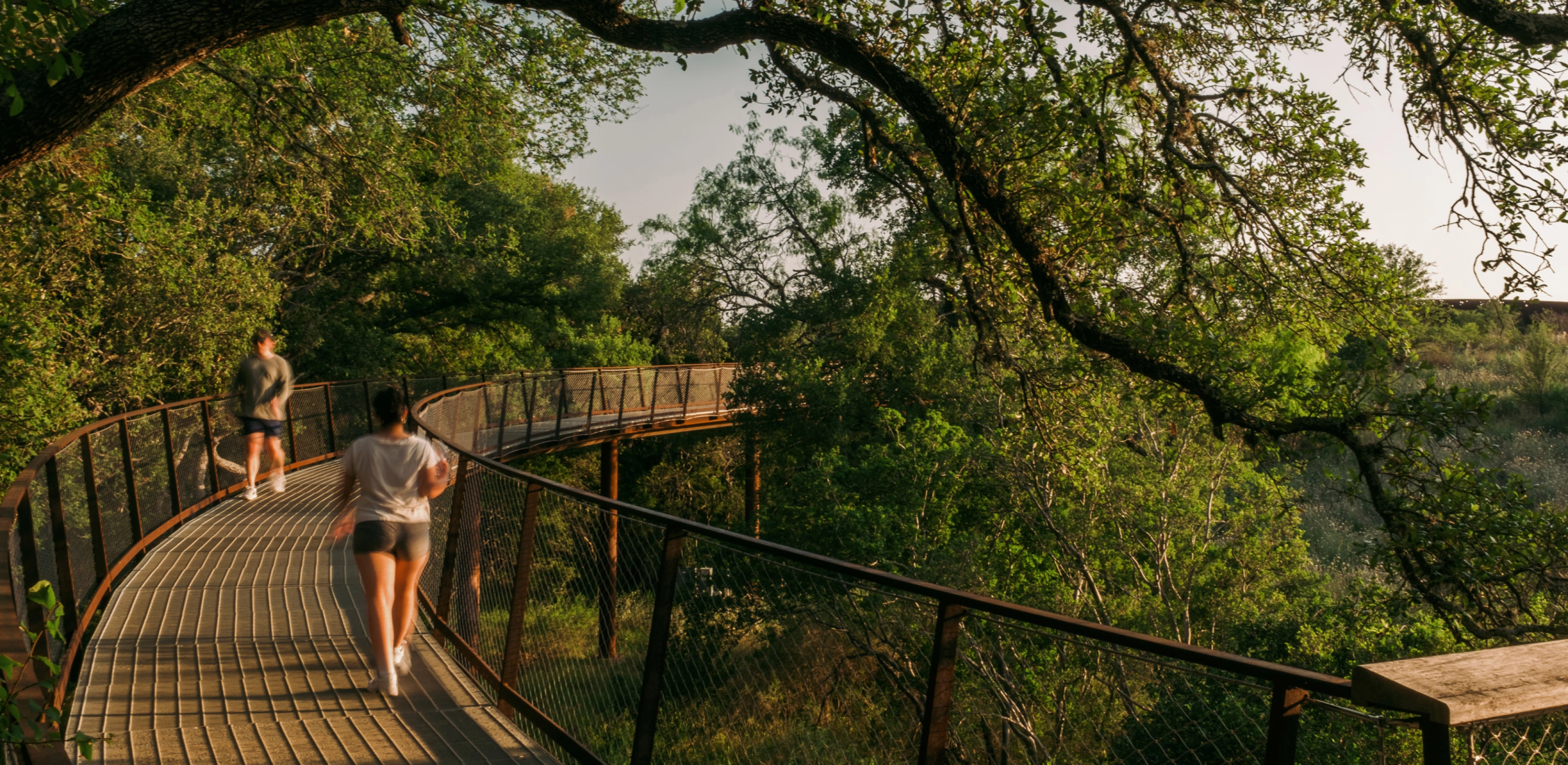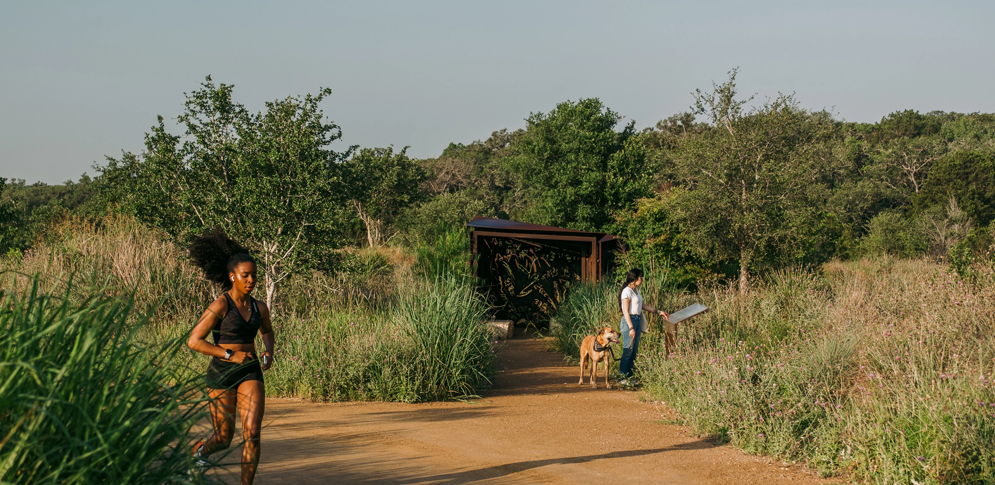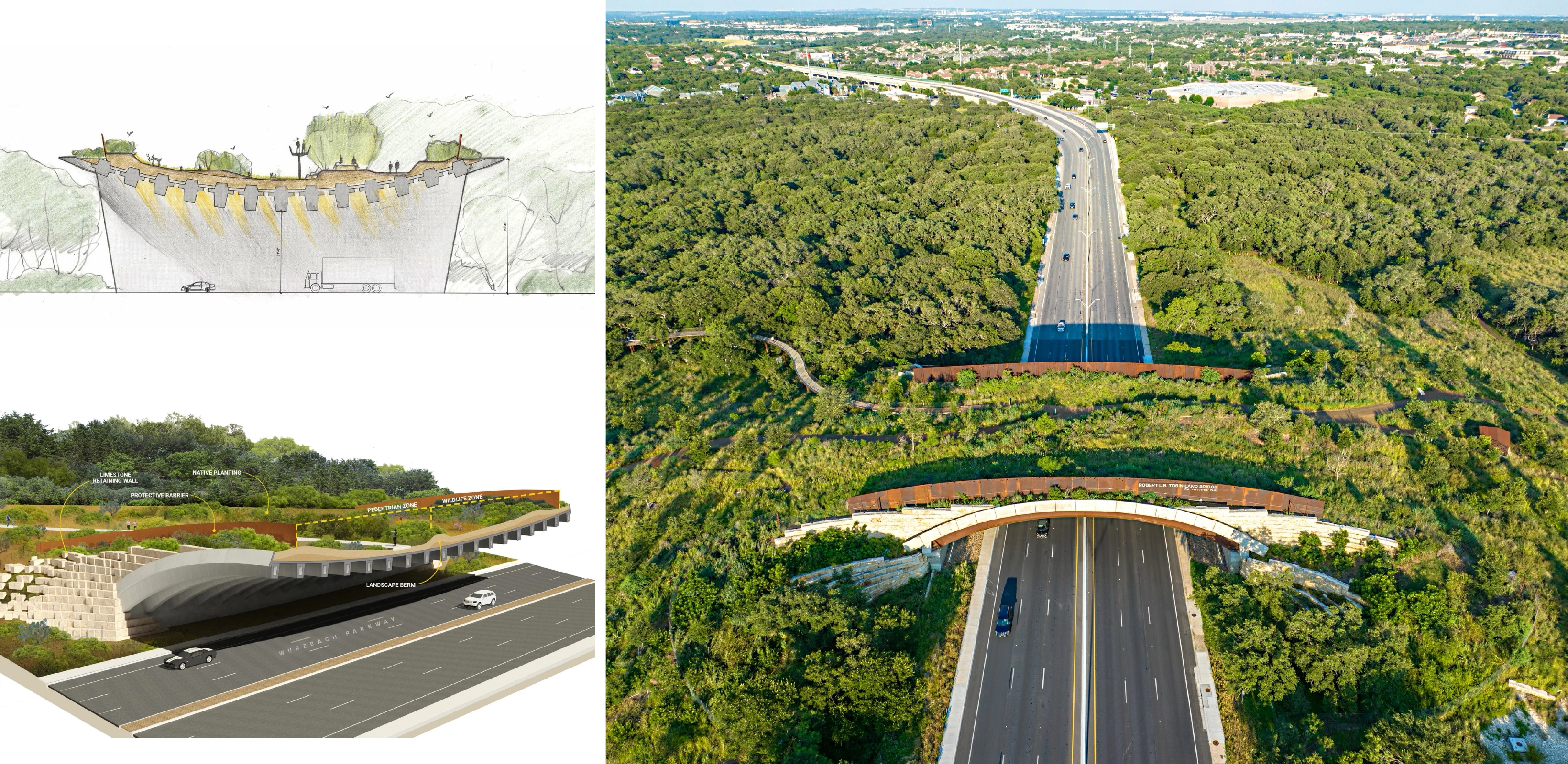 Wildlife biologists educated decisions on bridge dimensions and habitat requirements to maximize animal crossings. Passage is guided by 3,300 linear feet of barrier fencing along Wurzbach, directing animals upwards, while berms and plantings provide continuous cover across the structure. The bridge diversifies habitat with over 50 reintroduced species, many bearing fruits, providing shelter and supporting prey species. Before the first anniversary of the bridge, every mammal species known to reside within the park was captured on the land bridge’s trail cameras, including bobcat, white-tailed deer and ringtail cat.