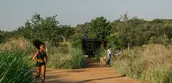 The bridge was conceived as a flowing extension of the land itself. Sculpted earth, layered with amplified savanna and scrubland, spans 175’ across Wurzbach Parkway and reconnects both sides of the park back to Salado Creek. The 160’ wide corridor of densely planted landscape is bermed along one edge for wildlife movement, while offering a narrower, accessible trail system for people. A 25 foot elevated skywalk of wood and steel sensitively winds through the tree canopy to the top of the land bridge. At the summit, steel parapet bridge walls create unexpected quietness, and the view extends for miles across the city. Wildlife blinds are sited at either end of the bridge, offering shade and a chance to observe animals at the water guzzlers. The perforated wall patterns take cues from the site’s flora and fauna, created by local artists and detailed by the landscape architects. All the materials, plants and forms of the bridge are responsive to the site and inspired by the region.