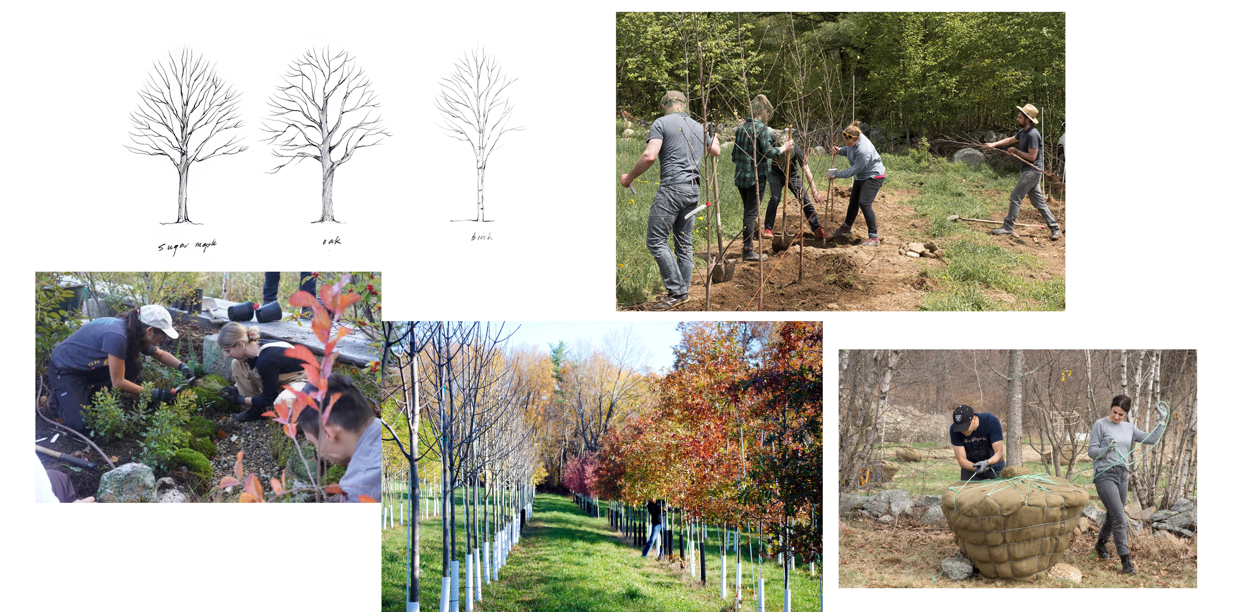 HOMESTEADING AND FARMING Charbrook is located in Nipmuc territory in rural Massachusetts. We began homesteading by rebuilding stonewalls and reclaiming invasive shrubland for grazing livestock. Pastures were re-seeded and farm lanes were planted with rows of native hardwoods. Five acres of fields and edge habitat were restored. Soon after, a house, barn and coop were constructed using our own red oak. Working gardens, pasture and meadows were established for vegetables, cows, sheep and wildlife. The farm abuts Audubon and State land, with the MA Mid State Trail running through, testing the idea that agriculture is compatible with restoration ecology. We oversee a twenty-acre plant nursery, fifty acres of hayfields, and a mosaic of woods and wetlands. As landscape architects, our instincts, spontaneous trials and experiences here have taught us the most about horticulture, craft and construction. After our second child was born, we realized our practice could benefit from this unique relationship with the land, and Charbrook has evolved into a place of mentorship, beyond the traditional studio.