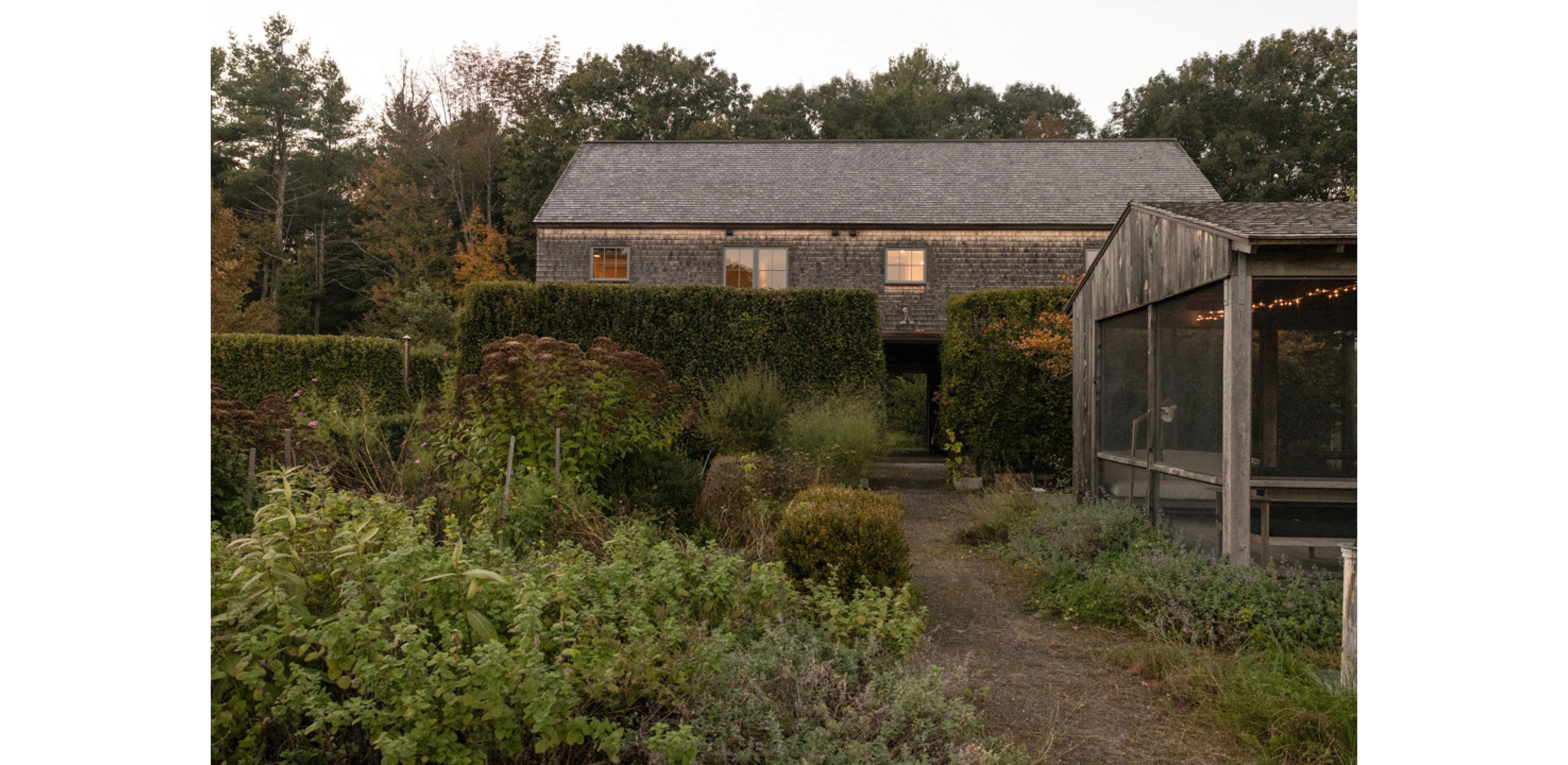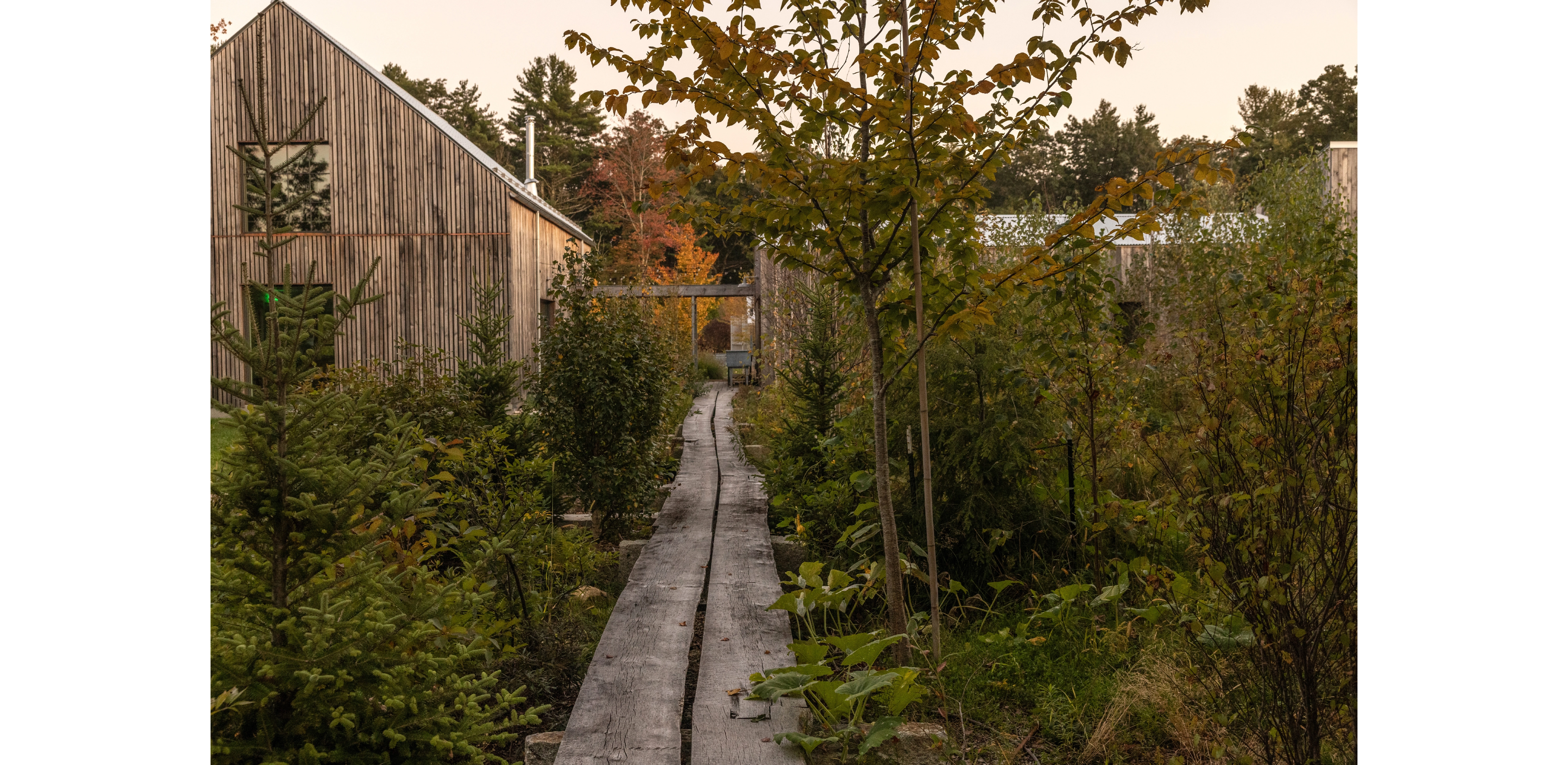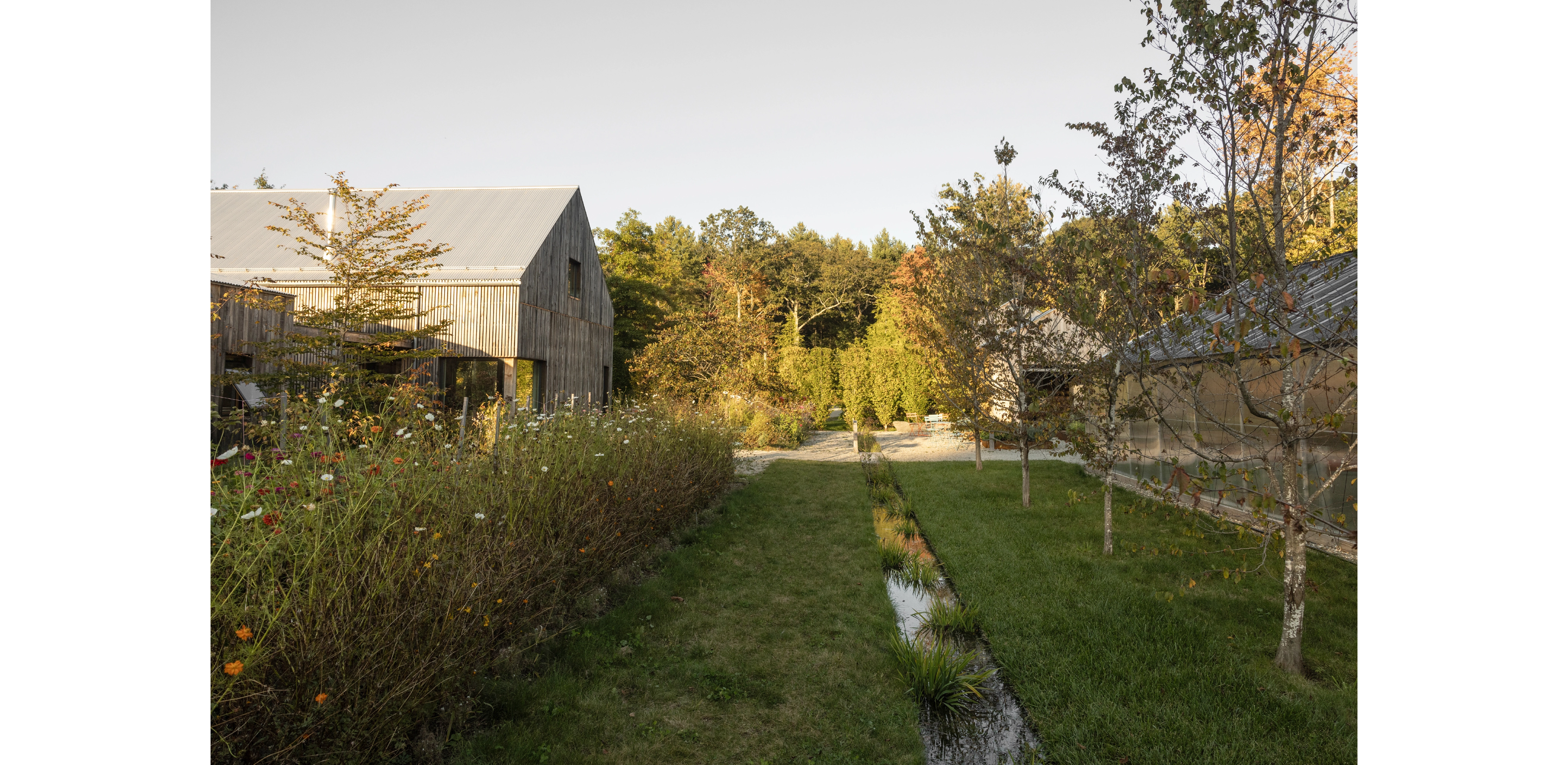 FIELDWORK AND PRACTICE In 2020, a trio of buildings were completed, expanding Charbrook’s role in our practice. A studio, grange hall and greenhouse were constructed on the lower pasture using passive-house standards and sustainably harvested site timber. The farm has become a series of exploratory plots where we study materials, test planting strategies and experiment with field-based design. We have the construction equipment and ability to build mock-ups and host charrettes and farm tours. Students from design programs come for nursery dig and plant days. Lectures, exhibits and events engage the broader public. Charbrook is at once a home and a place of inquiry, making, and community—where the act of designing is inspired by the rural landscape.
