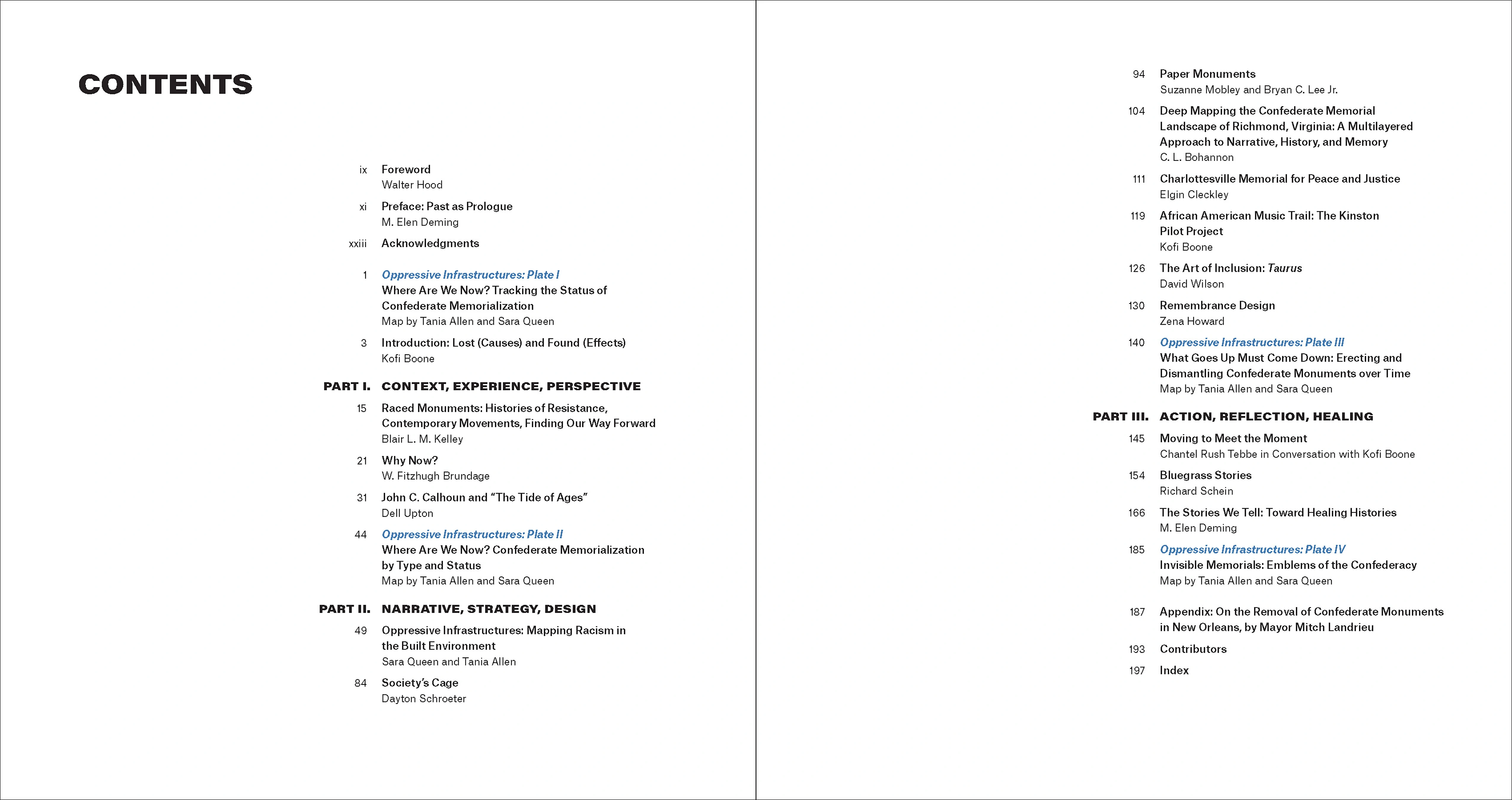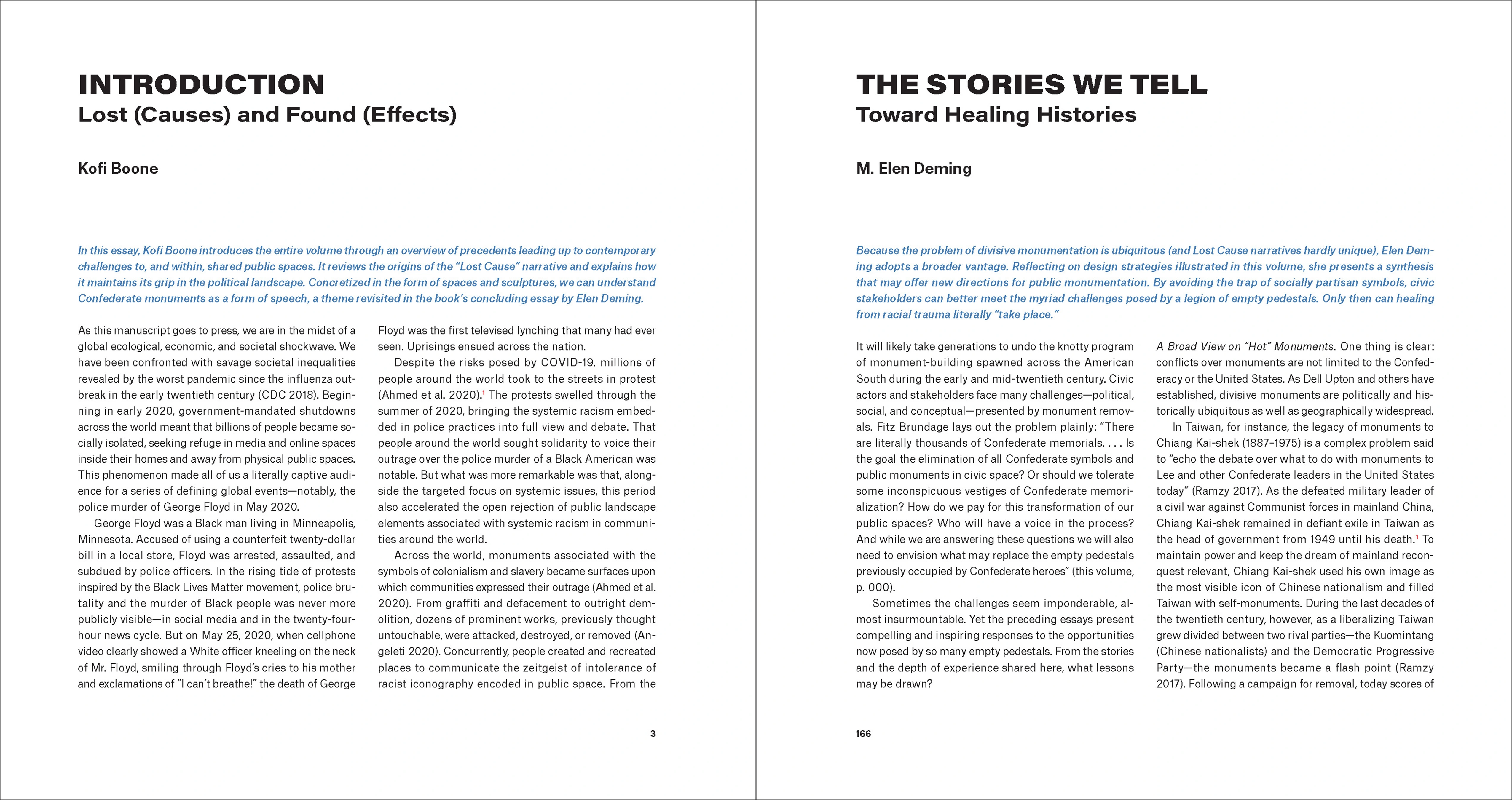 Empty Pedestals uses a design perspective to explore how Confederate monuments reflect regionalism, racist political agendas, and collective pain. Boone and Deming, along with the volume’s 14 contributors, strive to elevate novel frameworks and shared solutions for the issues troubling American cultural landscapes. Empty Pedestals amplifies the voices of those who have confronted hateful narratives and devised strategies that stand apart from old mythologies. If and when oppressive symbols such as Confederate monuments are permanently eliminated, design alternatives presented here may offer healing in shared spaces, healthier social discourse, and stronger community resilience. Walter Hood’s foreword challenges designers to lean into conflict, discomfort, and the critical learning processes those situations afford. The volume is organized into three parts with visual essays interspersed. Tania Allen and Sara Queen provide four innovative visual essays (plates) exploring specific data-driven aspects of Confederate monumentation. Part I: Context, Experience, Perspective offers four accounts of how Confederate monuments and their public spaces have impacted communities from the Reconstruction Era through the Civil Rights movements to the present. The essays foreground the experience of Confederate monuments seen through critical histories and non-White perspectives, some based on deeply affective personal experiences. Part II: Narrative, Strategy, Design is the heart of the volume, featuring local interventions and public narratives led mainly by Black artists and designers. Adopting a case study approach, these essays are richly illustrated with contemporary designs, public art installations, maps, renderings, and other visualizations. Eight case studies are arranged along a spectrum of design strategies. Part III: Action, Reflection, Healing features essays drawing out transferable tactics, principles, and frameworks from previous perspectives and designs. This section considers broader systems within which local public spaces perform, including grassroots cultural, economic, and political entities charged with preserving and effecting changes in the built environment. These reflections provide orientation, impetus, and direction for designers, planners, funders, and others working towards a more inclusive and vibrant local public landscape. Elen Deming concludes Part III with “Stories We Tell: Toward Healing History(s),” distilling overarching ideas into a framework for action by designers, bringing the book full circle to emphasize the power of narratives in shaping social and spatial systems. With the permission of former Mayor Mitch Landrieu, the volume concludes with an appendix featuring the full text of his nationally significant speech explaining why he decided to take down monuments in New Orleans. The completion of Empty Pedestals included a Graham Foundation grant recognizing the book’s value to critical discourse and contributions to equitable spaces. Since its release, Empty Pedestals has received the Louisiana ASLA Chapter Award, been featured by the Society of Architectural Historians (SAH), and been the subject of many presentations, including a convening hosted by the University of Virginia’s School of Architecture.