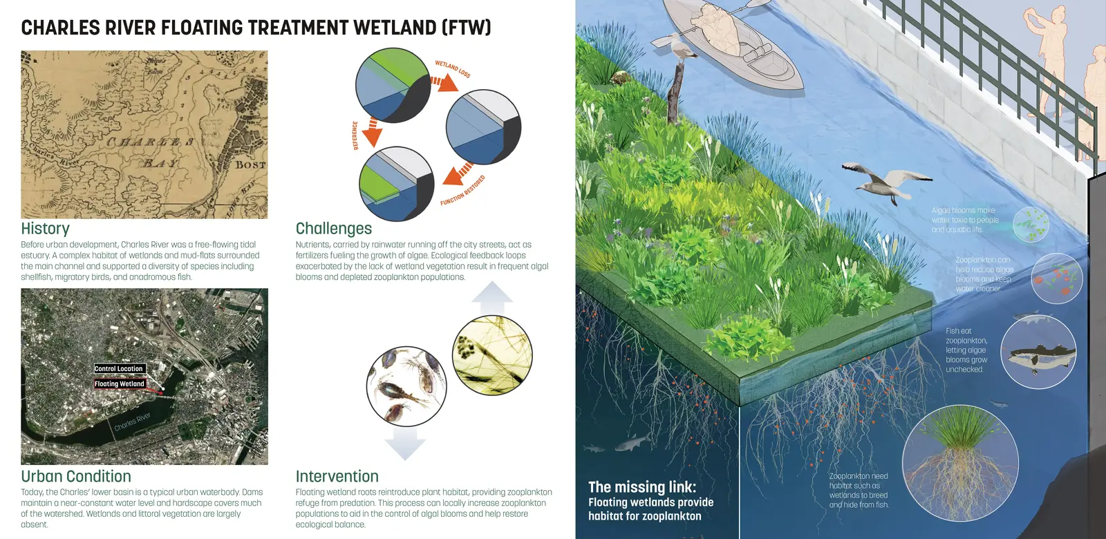 The Charles River Floating Wetland Pilot Project investigates the application of Floating Treatment Wetlands (FTWs) as an innovative solution to improve degraded urban waters. This research addresses the linked challenges of missing habitat, degraded water quality, and impoverished public perception of urban waters. By combining scientific research, design experimentation, and public outreach, the project demonstrates how FTWs can enhance water quality, support biodiversity, and provide educational opportunities. The findings offer a defensible method for sizing FTWs and highlight their potential as an effective tool for landscape architects to address urban water quality challenges and foster environmental stewardship.