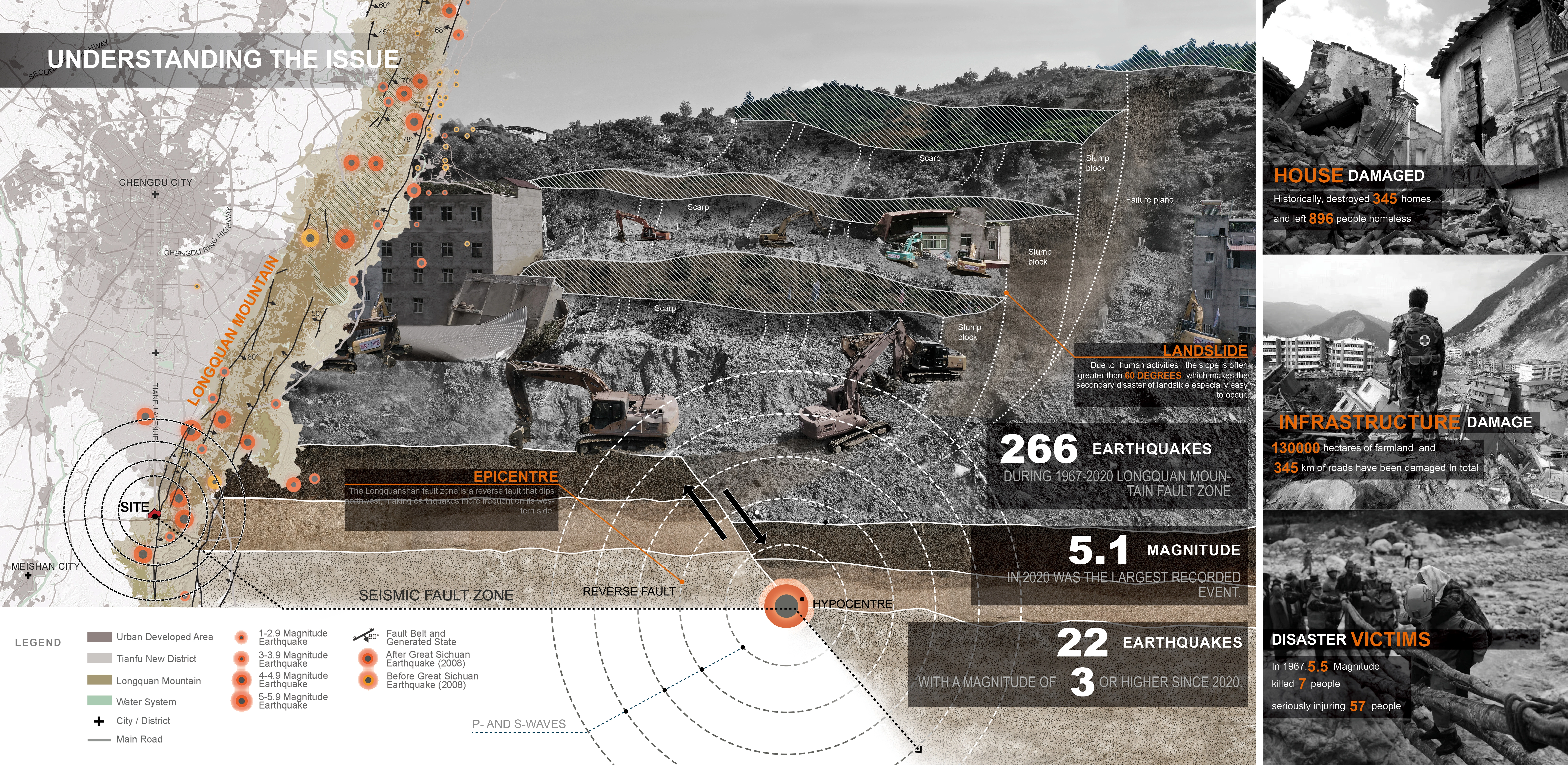 This study presents a landscape-based approach to earthquake disaster mitigation by integrating Geological Restoration of the Mountain (GRM), Radon Gas Measurement Mapping(RGM), and the Earthquake Monitoring Alert System (EMA). By combining advanced hazard prevention with ecological restoration, the design enhances seismic monitoring, early warning, and disaster resilience while also promoting soil and water conservation, landslide mitigation, and landscape aesthetics. Beyond reducing economic losses, this strategy transforms Chengdu’s mountainous terrain into a multifunctional public space, fostering ecological resilience and community engagement.