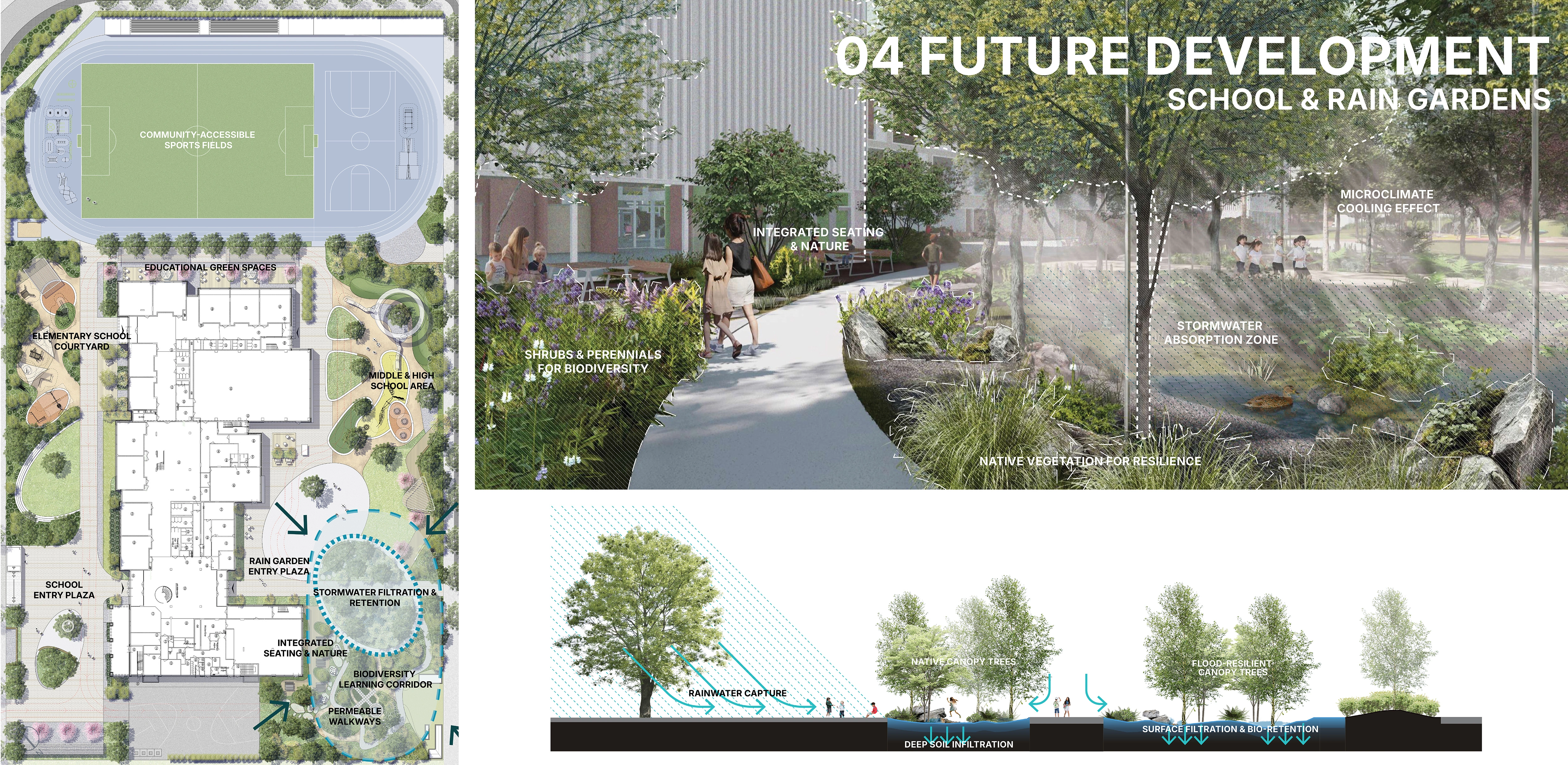 Event Plaza – a flexible civic space for daily activities and large-scale events Pedestrian Streets – walkable streets linking residential, commercial, and educational areas Education Hub – an open campus designed for learning, collaboration, and research School & Rain Gardens – integrating ecological learning and sustainable water management