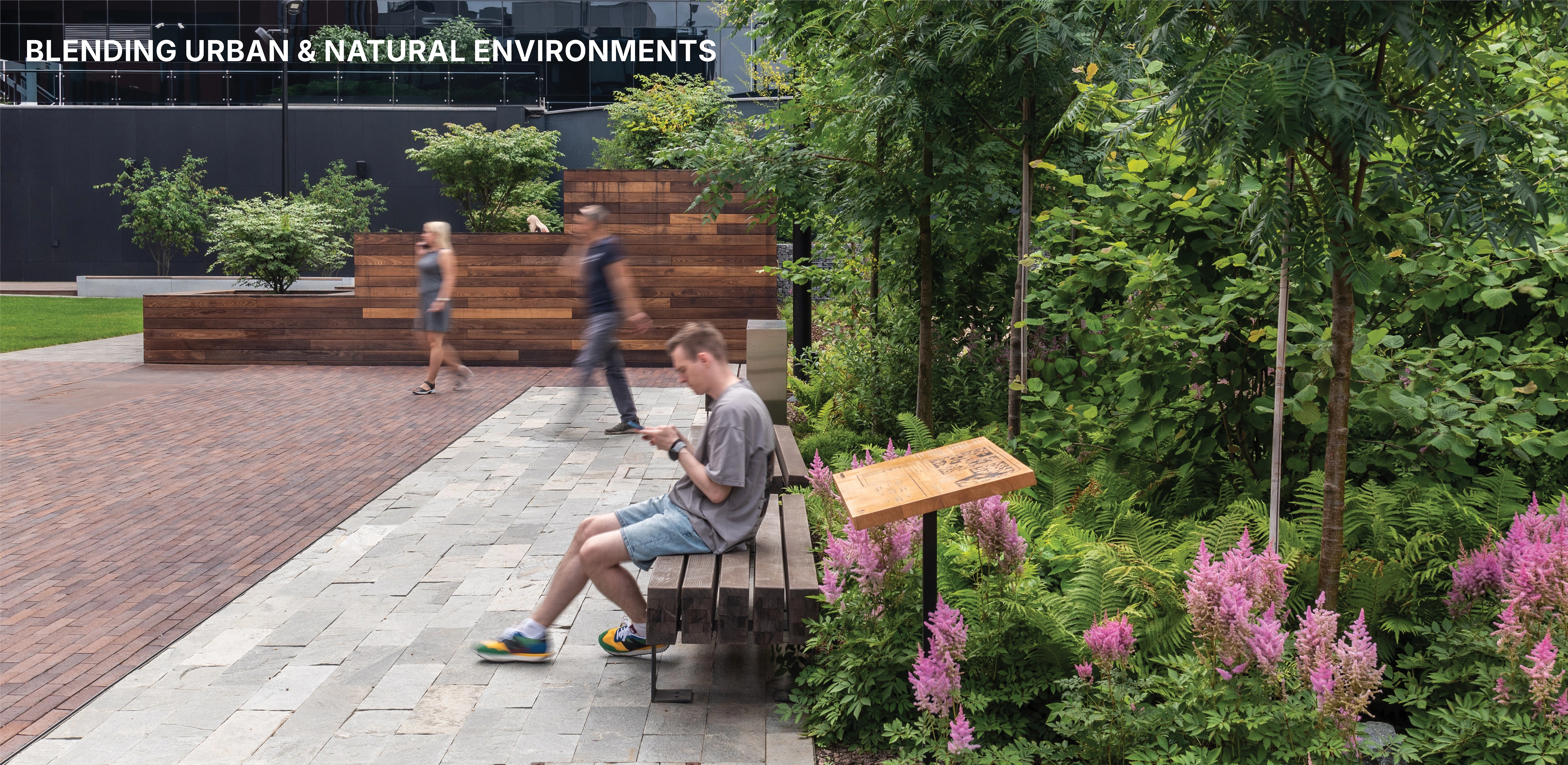 Pedestrian-first design – shared spaces prioritizing people over cars Flexible landscapes – multifunctional spaces fostering work, recreation, and interaction Material identity – corten steel, concrete, and wood reflect the industrial past while shaping a contemporary district