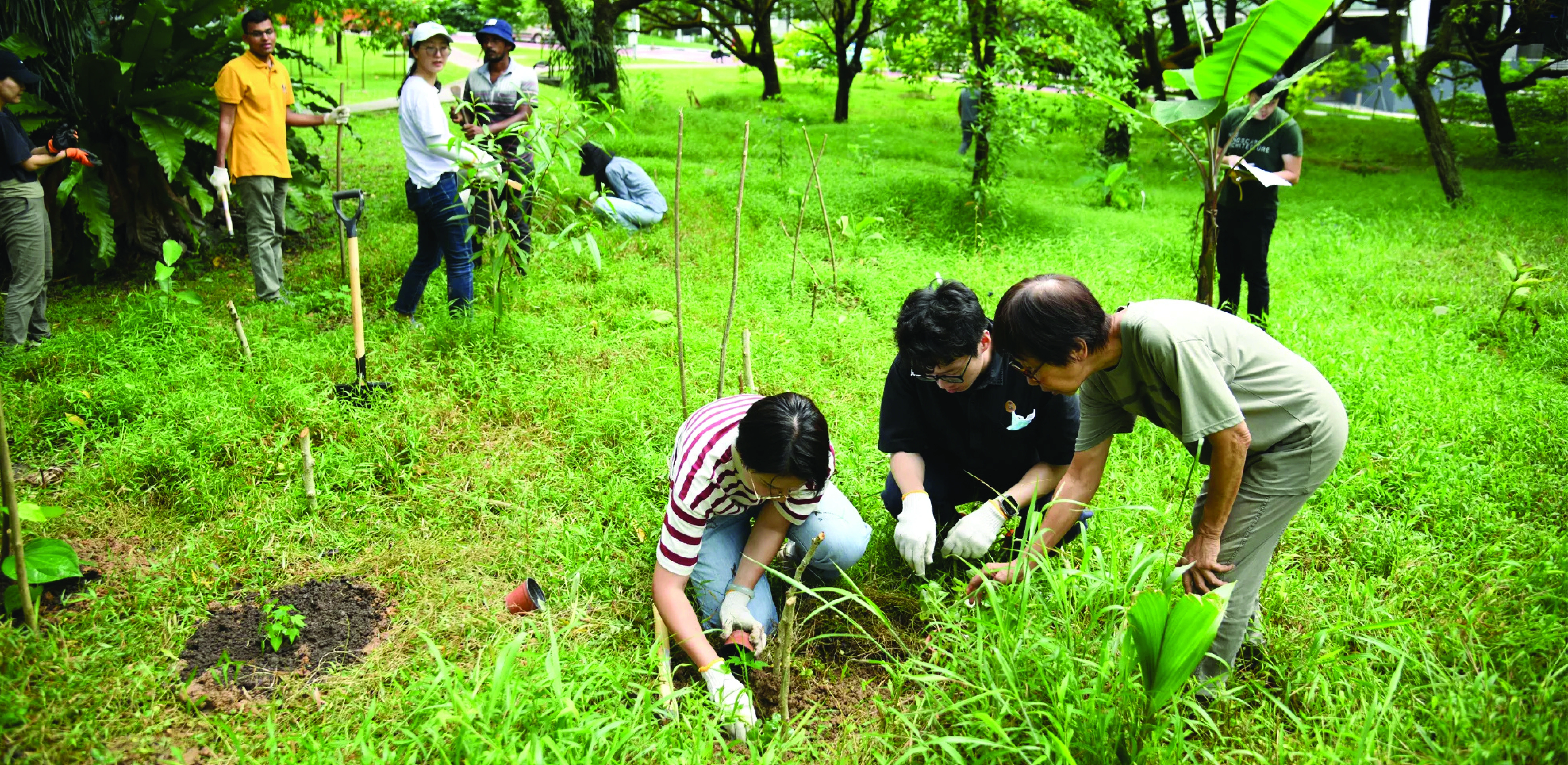 This student-led project presents a rewilded landscape that blends nature conservation with community farming, reconnecting city dwellers to the "Kampung Spirit" of community connectedness. Through organising activities that tap on the university community and collaborators, manicured lawns are turned into a living lab with integrated food-growing functions, boosting biodiversity, preserving sociocultural values and enhancing educational opportunities. This garden fosters environmental stewardship and demonstrates rewilding's potential to redefine urban green spaces, providing a model for institutions to learn about the importance of combining natural processes with thoughtful human intervention to achieve a sustainable campus greenery.