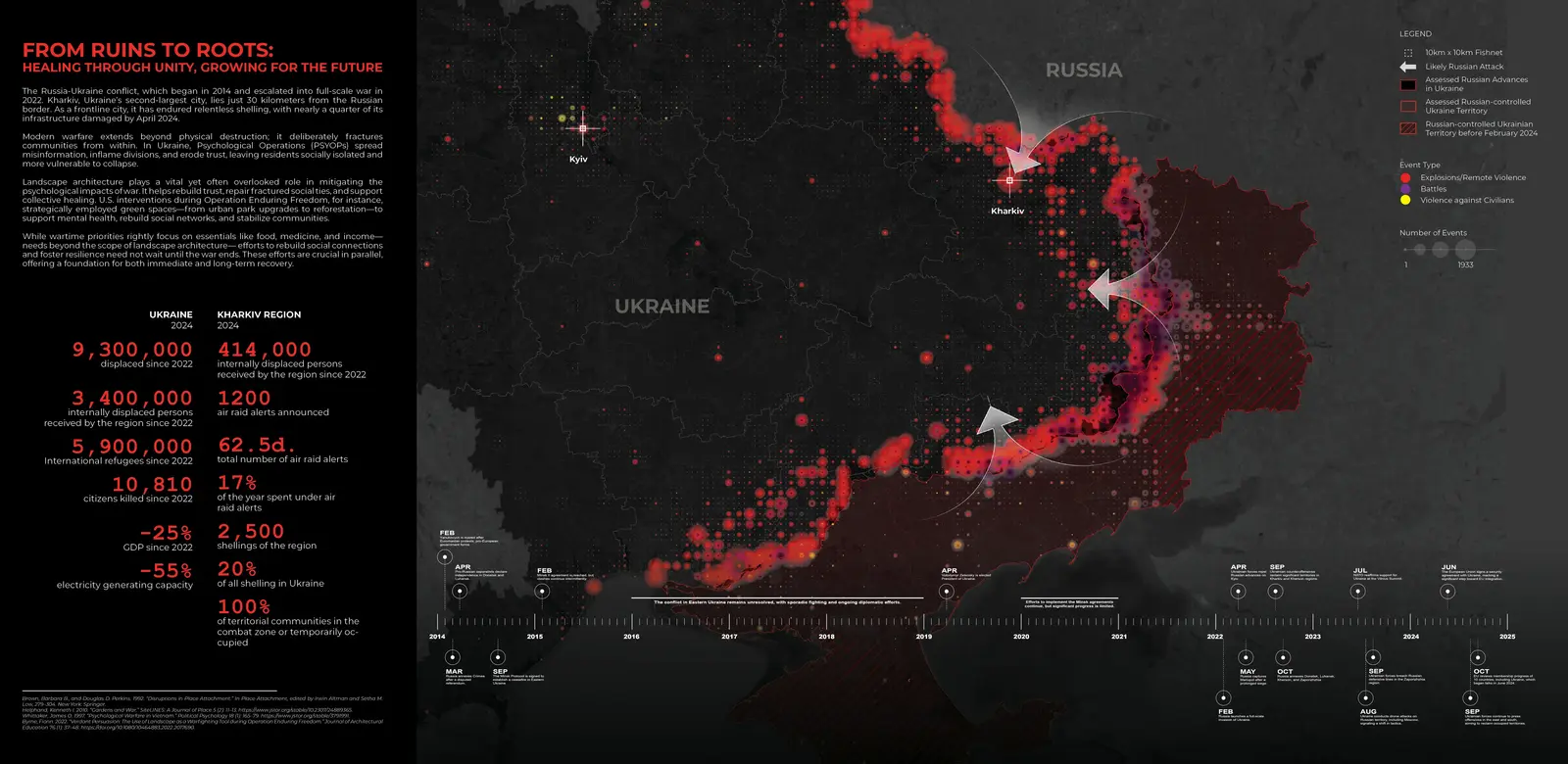The Ukraine conflict has caused widespread devastation. Modern warfare goes beyond physical destruction, employing psychological tactics to erode trust and deepen social divides. While meeting basic needs is essential, restoring cohesion and resilience must advance in parallel. Landscape architects play a vital role in this effort. During Operation Enduring Freedom, U.S. initiatives like park upgrades and reforestation showed how design can rebuild social ties and stabilize communities. This project carries that idea forward—reimagining metro stations as dual-purpose hubs for shelter and connection, fostering community resilience during conflict, and laying the groundwork for post-war recovery through adaptive, community-led interventions.
