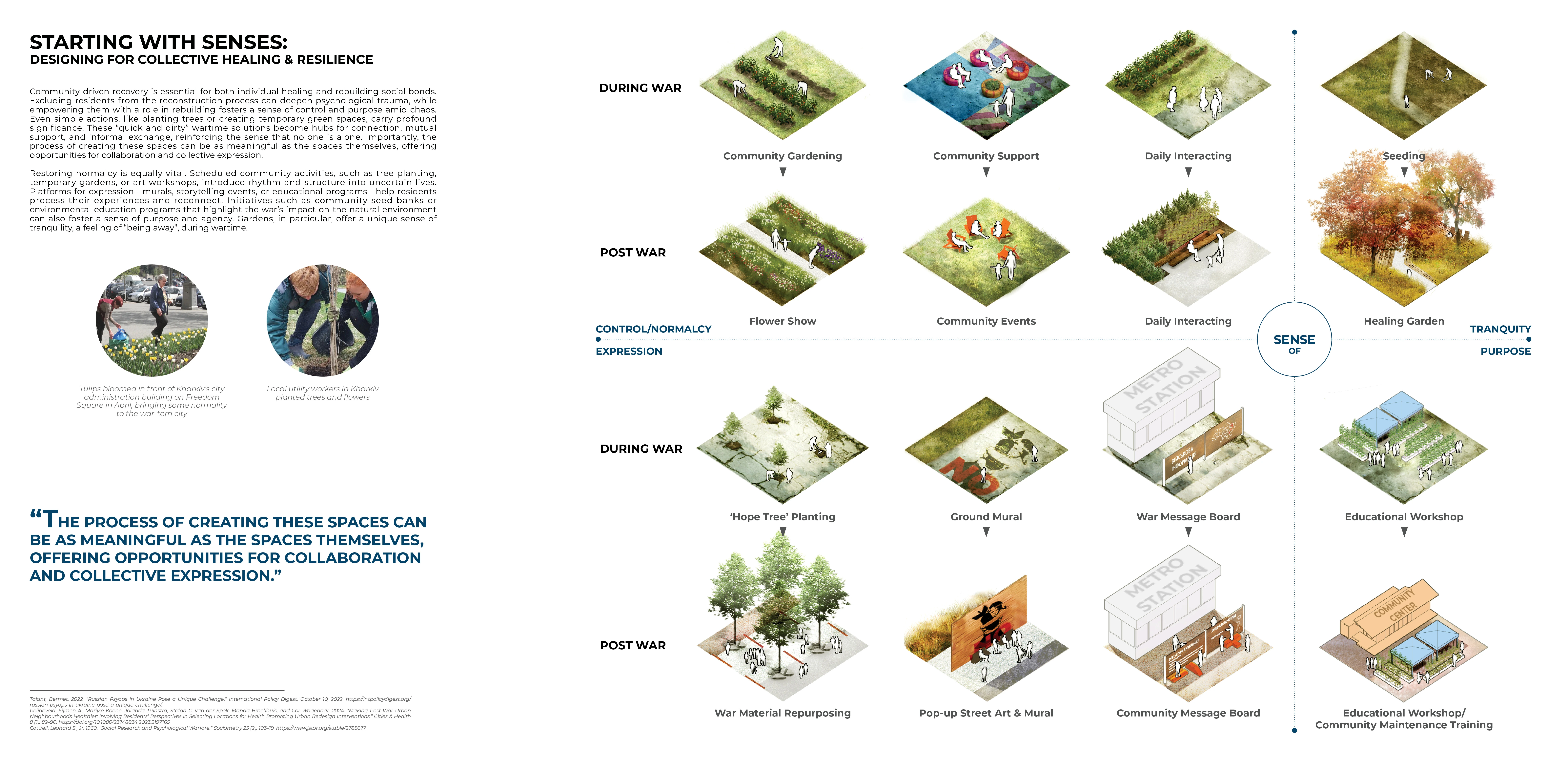 Spaces for expression—like murals or storytelling events—help residents to process trauma and reconnect with others. Initiatives such as community seed banks, aimed at restoring war-torn ecosystems by propagating phytoremediation seeds and raising awareness of the conflict’s environmental impact, can also foster a sense of purpose and agency. These “quick and dirty” interventions build collaboration, solidarity, and belonging, evolving into lasting spaces that preserve community resilience.