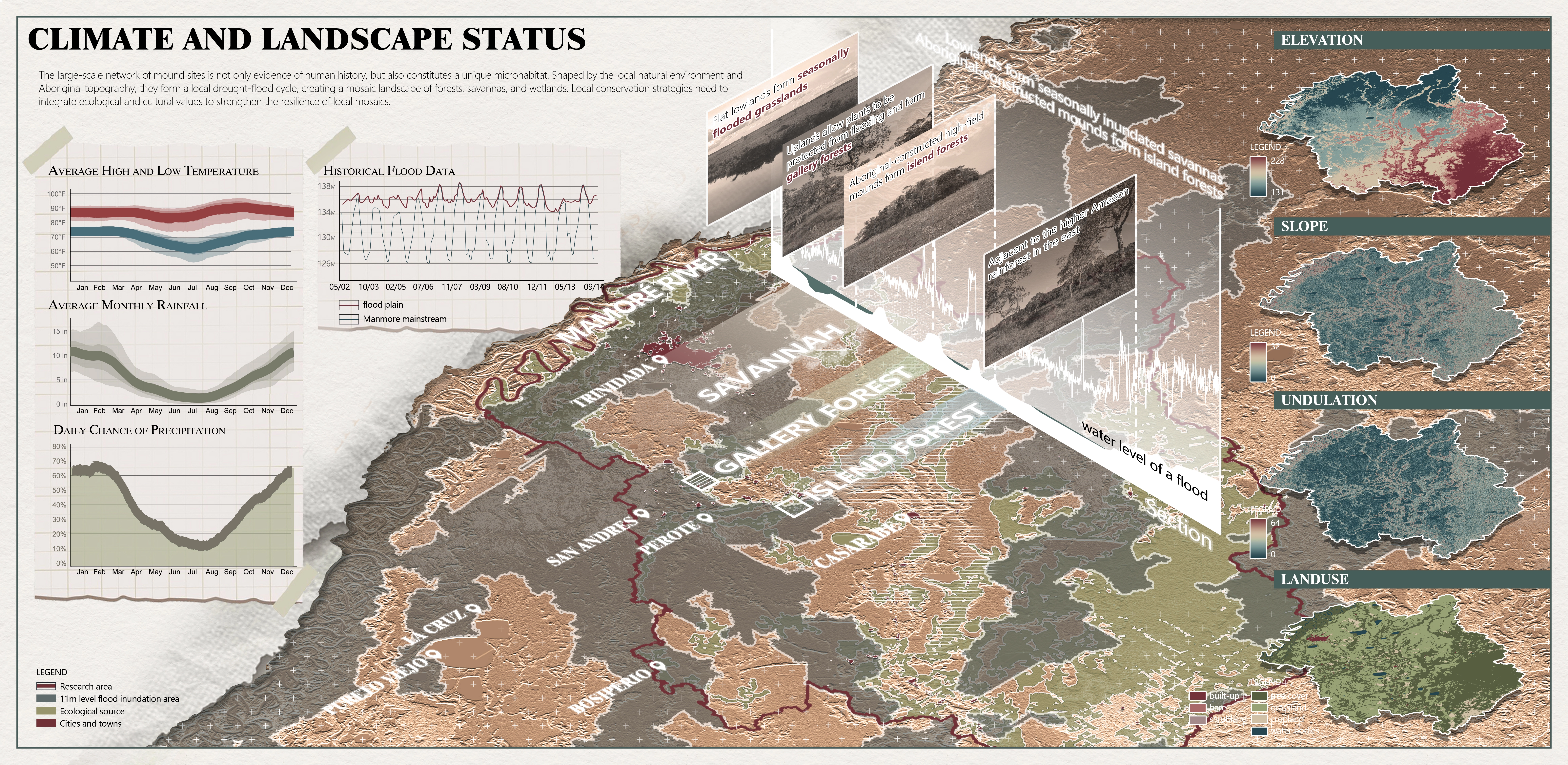 Within Casarabe’s study area, seasonal extremes intensify tensions among three interdependent systems: community livelihoods, agro-pastoral productivity, and site conservation. First, heritage sites are dispersed across thousands of hectares, making coherent protection zones spatially complex. Second, farmers and ranchers rely on the same floodplain that sustains archaeological earthworks; conservation buffers often conflict with productive land parcels. Third, climate variability deepens water stress—extended dry seasons strain crops and livestock, while intense rains cause flooding and erosion, undermining both soil fertility and fragile monuments. Without integration, efforts to boost yields or delimit reserves risk worsening inequities, degrading ecosystem services, and erasing cultural patrimony.