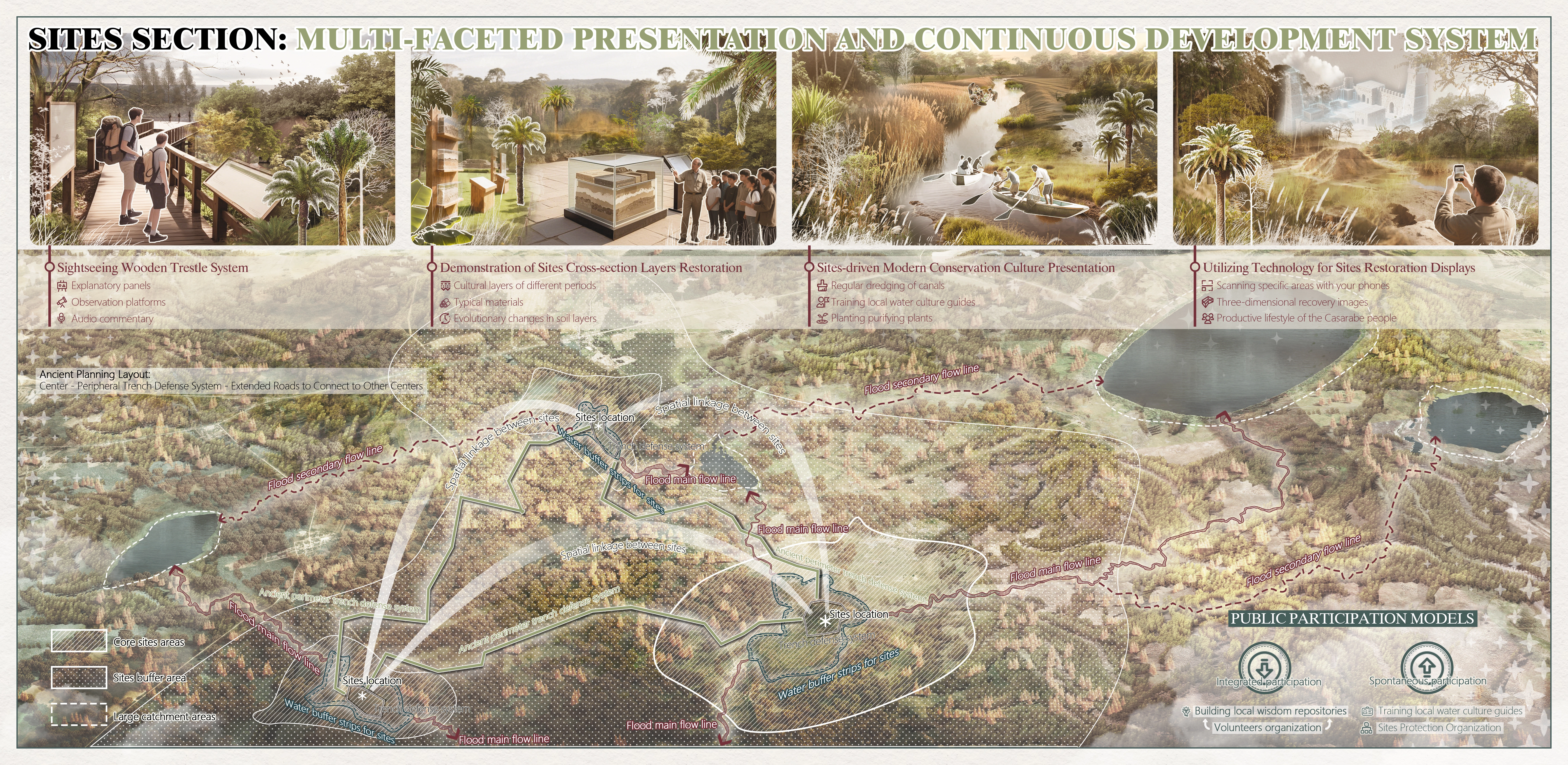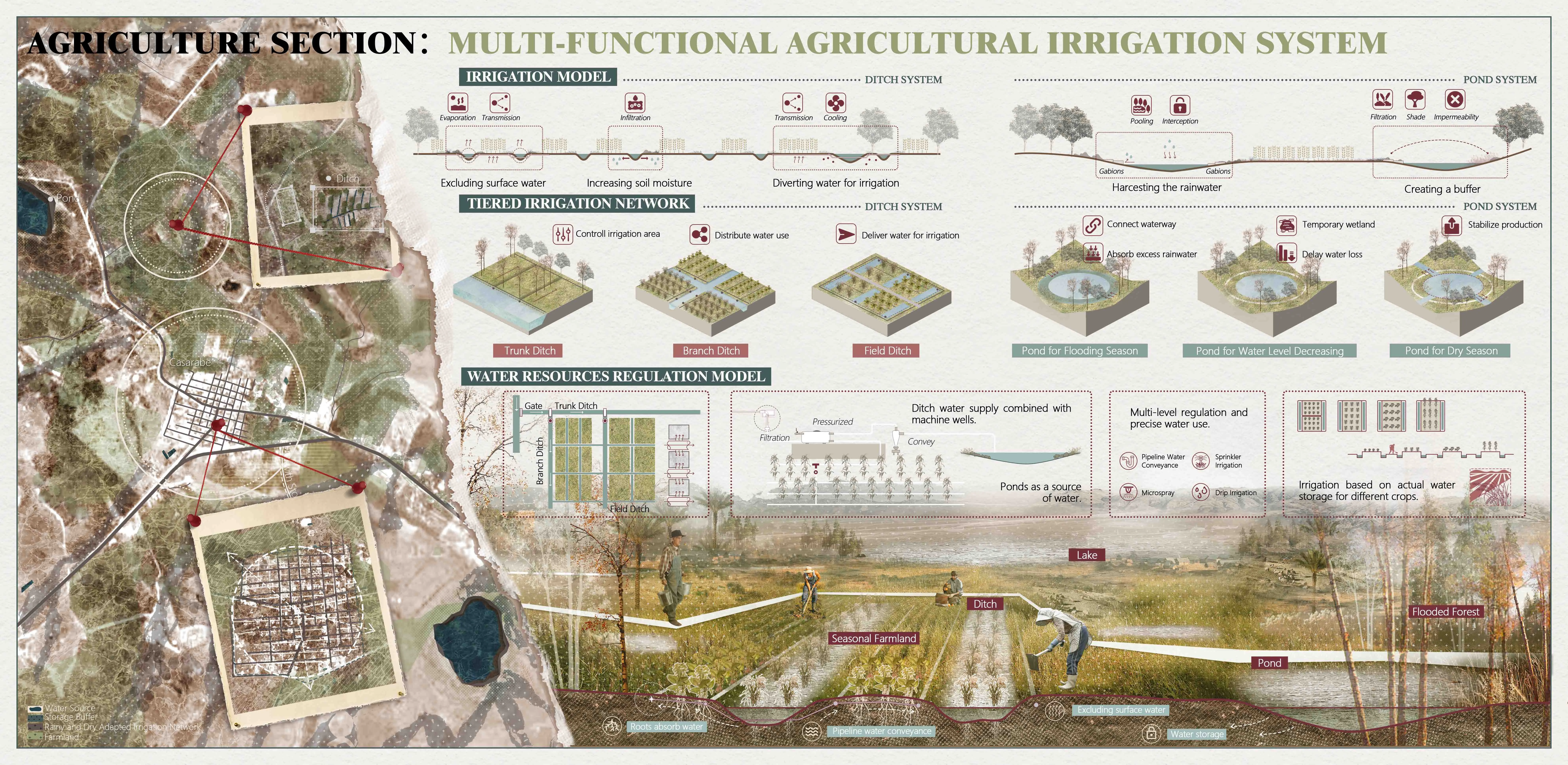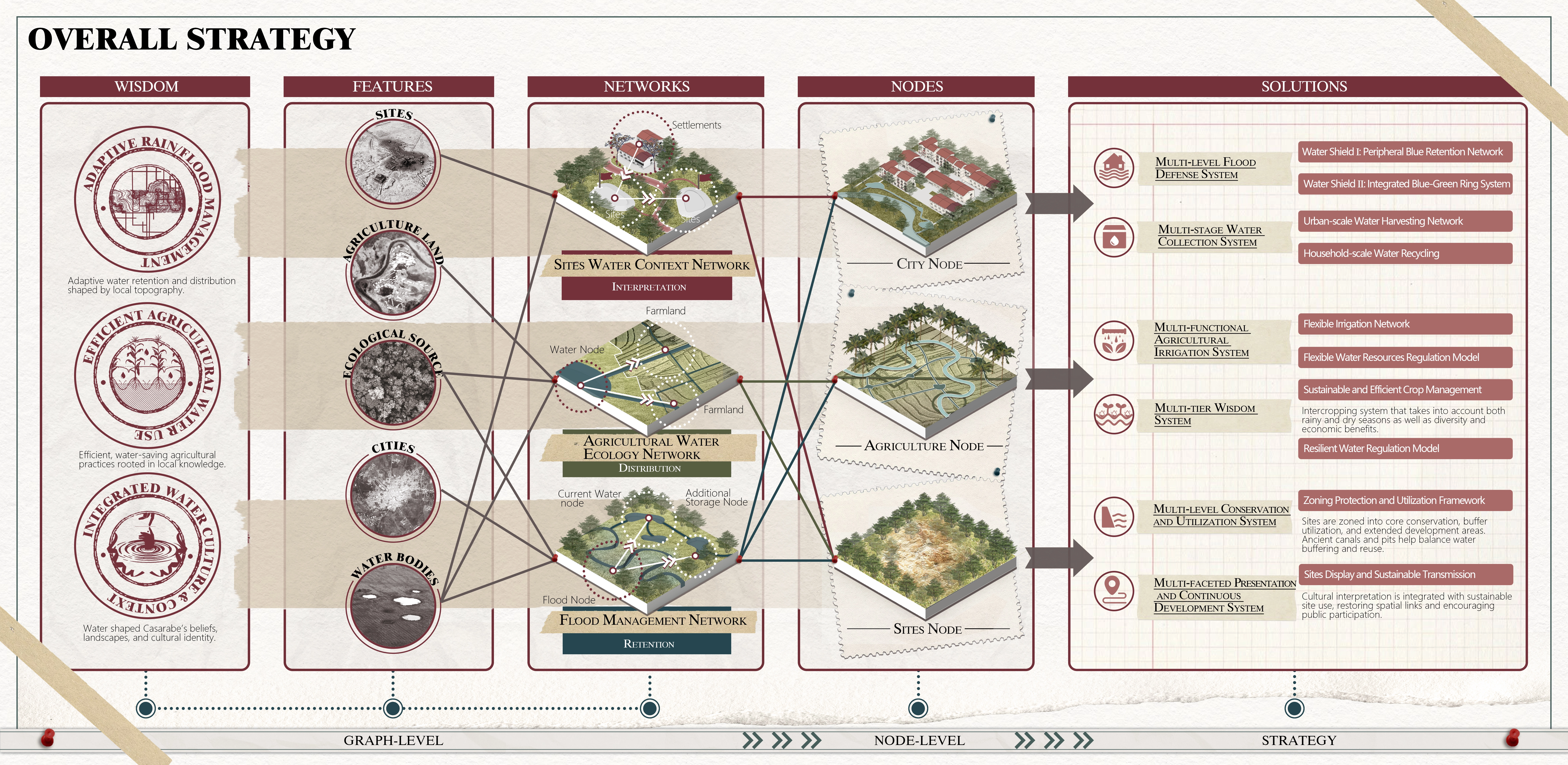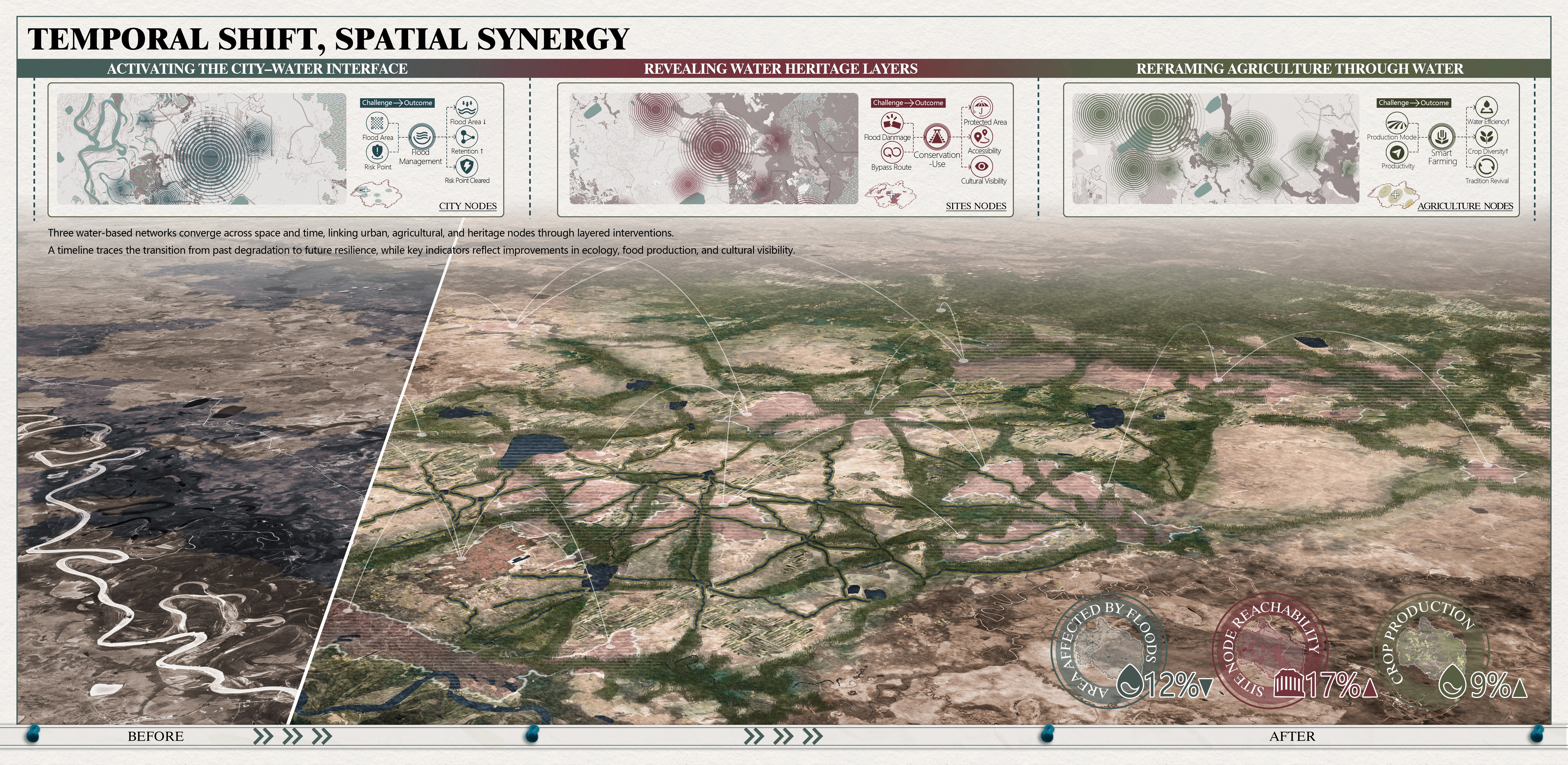 Drawing on ancestral water wisdom, our plan weaves three complementary network systems—Flood Management, Agricultural Water Ecology, and Sites Water Context—into a unified framework: