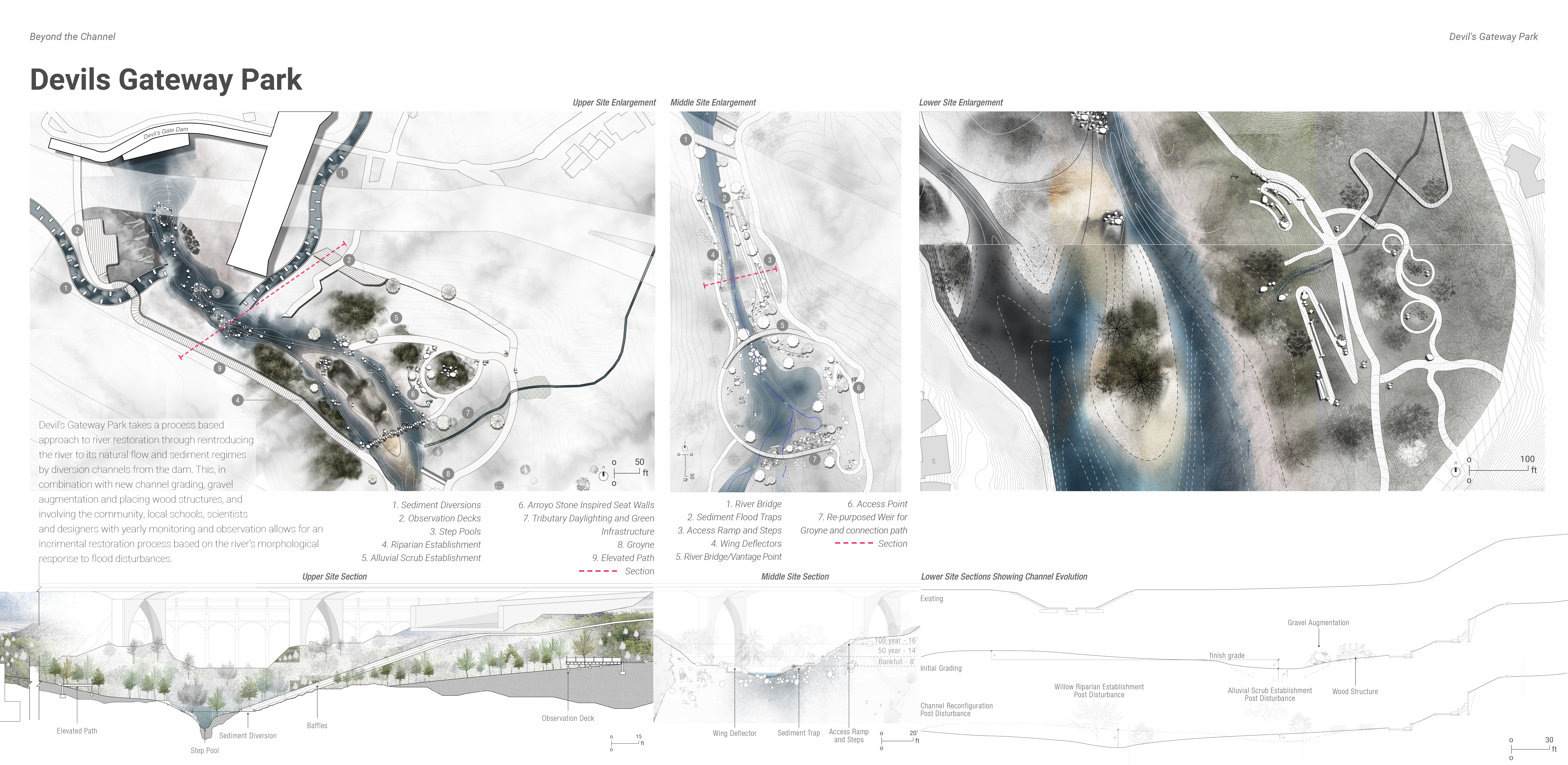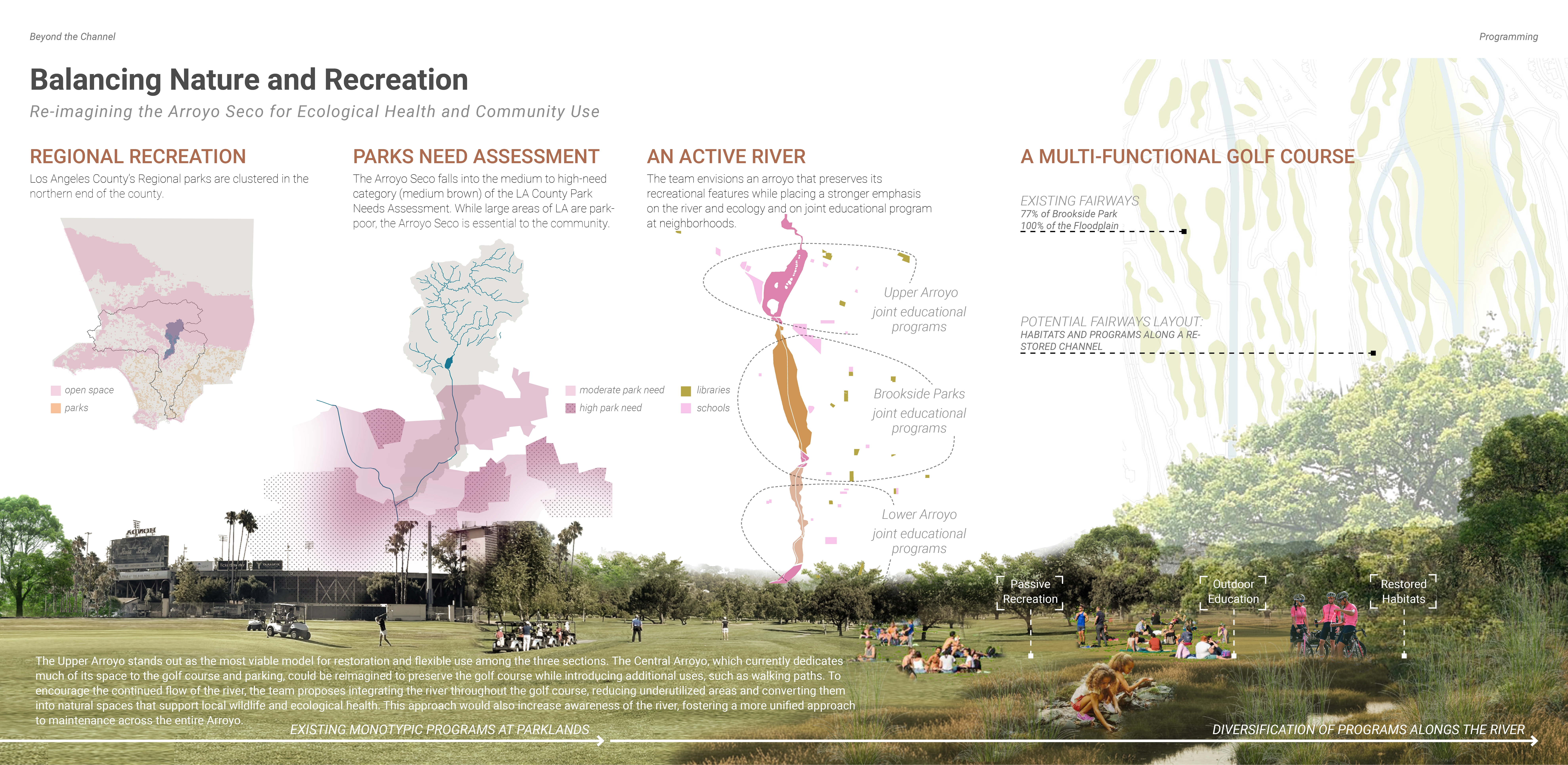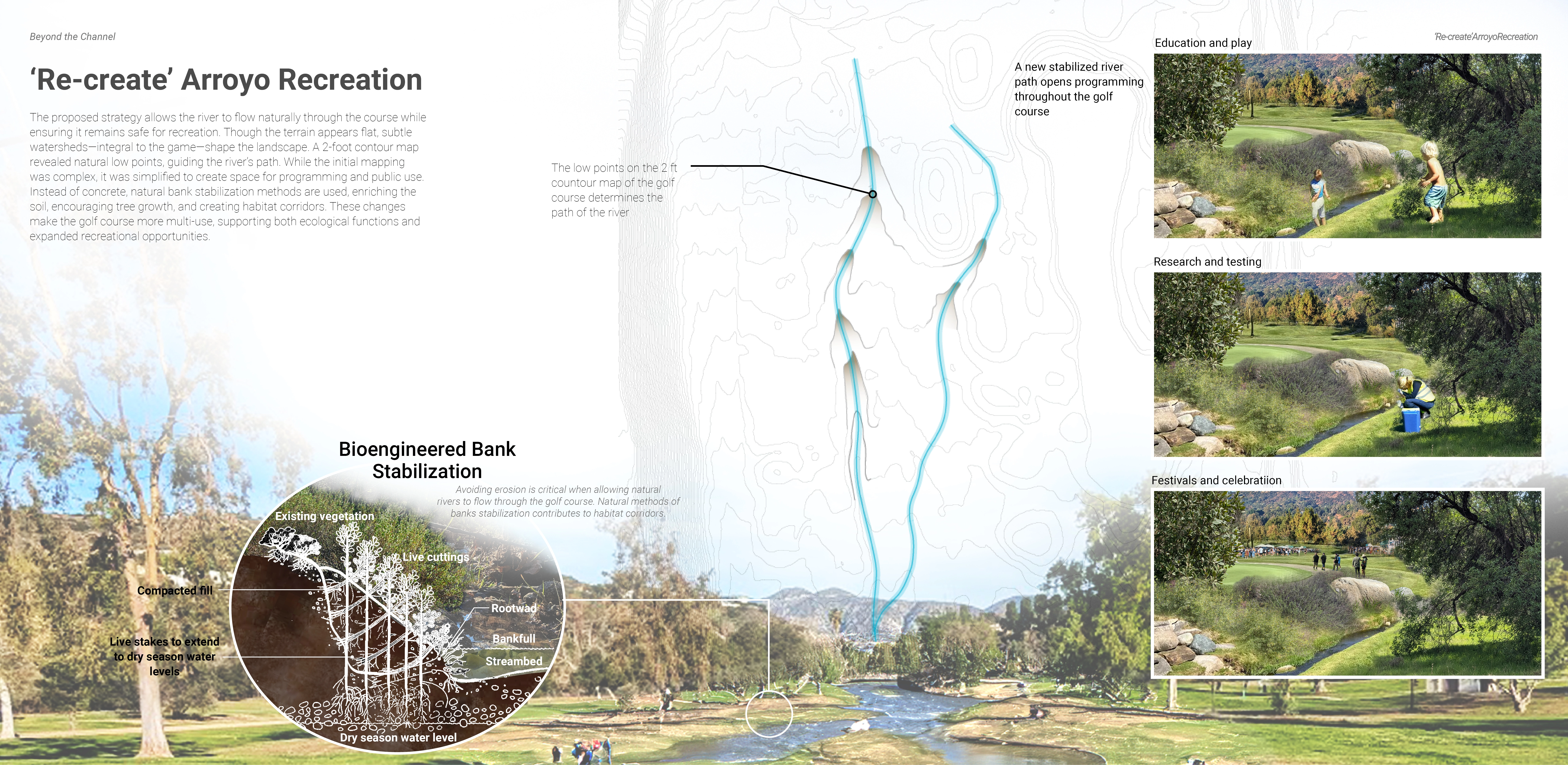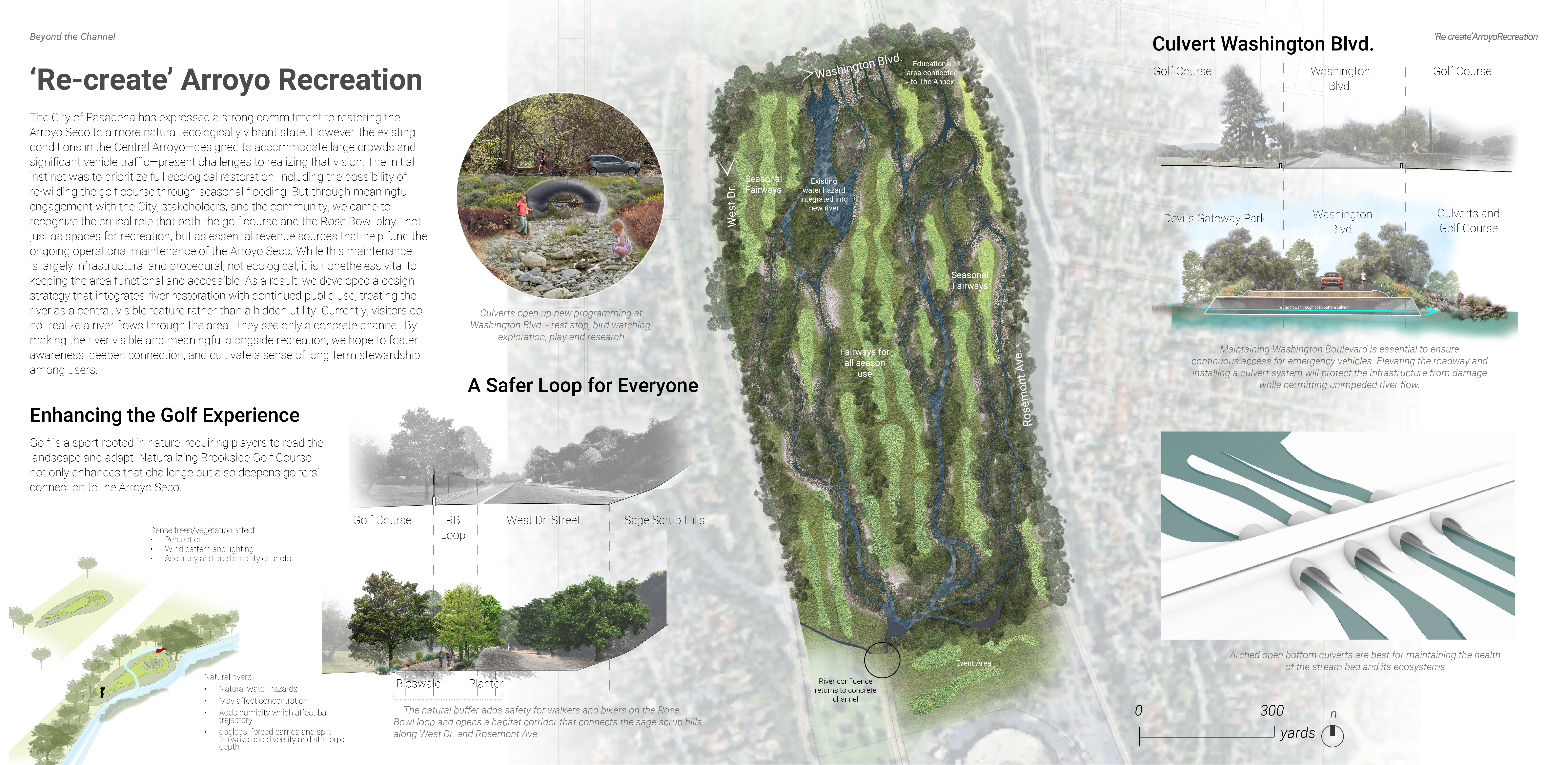 Our spatial and community strategies bring restoration to life. Our designs include an education hub with a nursery that fosters stewardship; A rerouted flow near Devil’s Gate Dam restores sediment and invites learning; A rewilded golf course merges ecology with recreation, and urban upgrades improve access and pedestrian safety. We aim to demonstrate a successful model of urban river revitalization through culture building, community reconnecting, and care to both the human and natural systems.