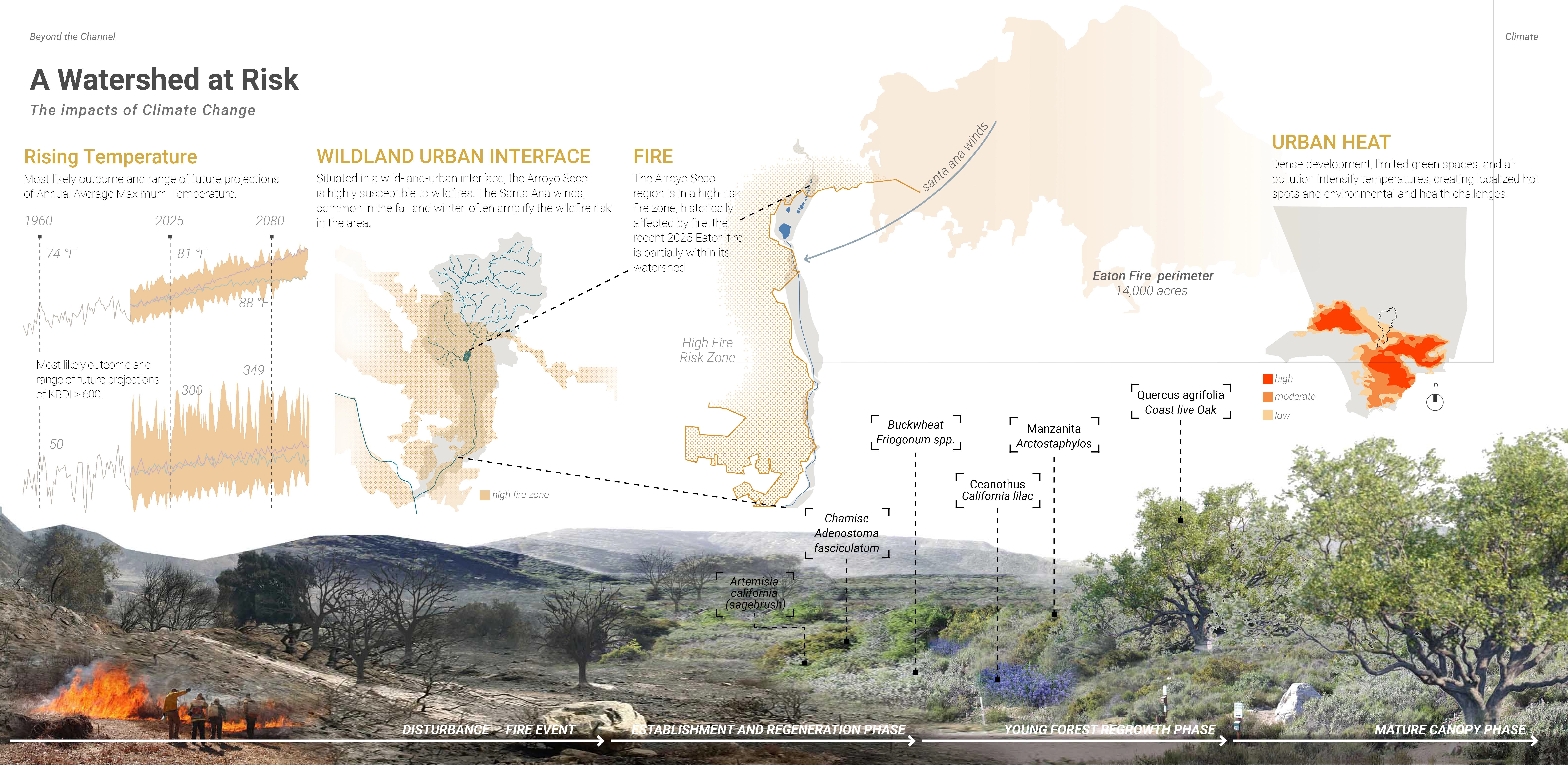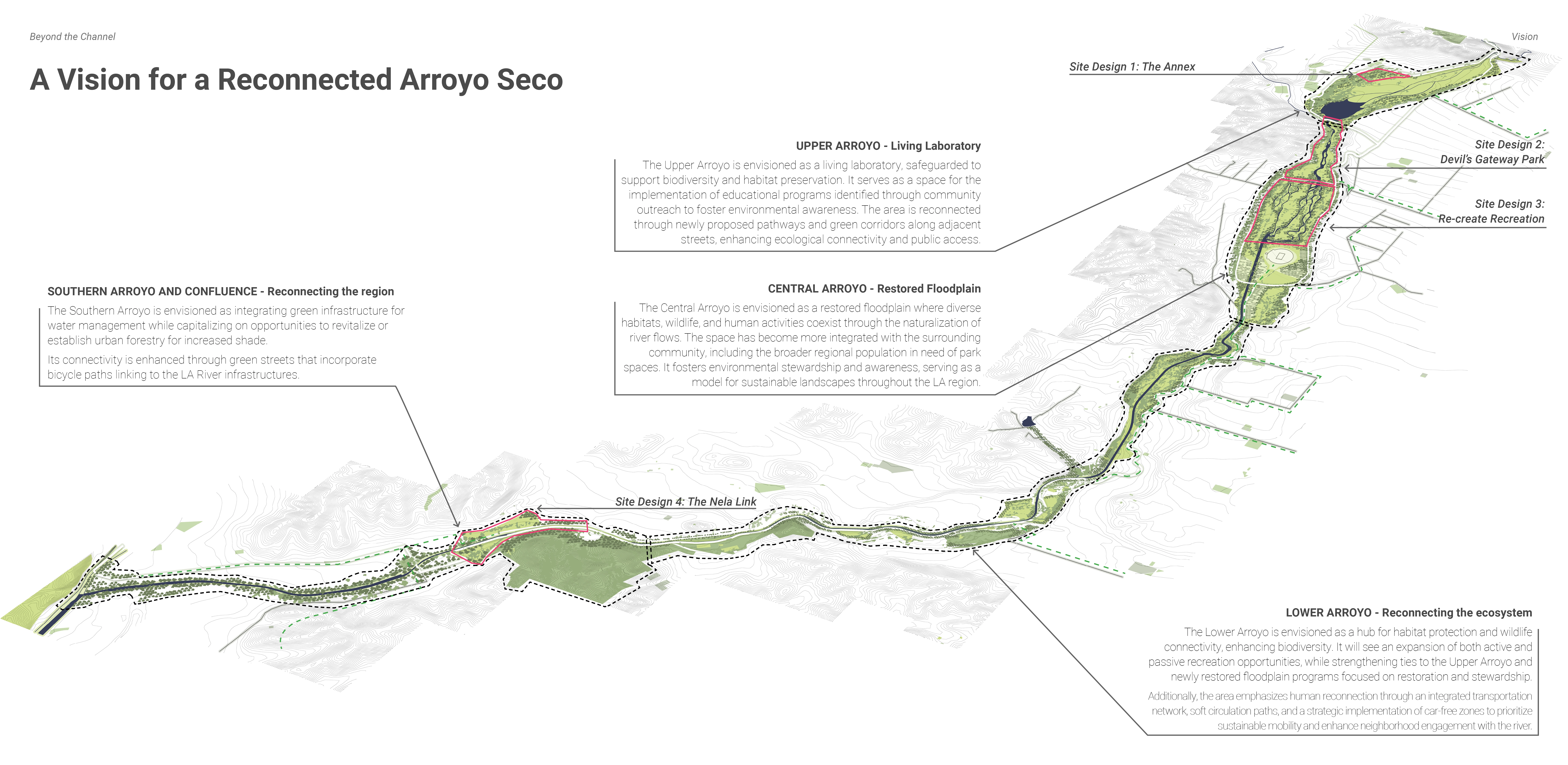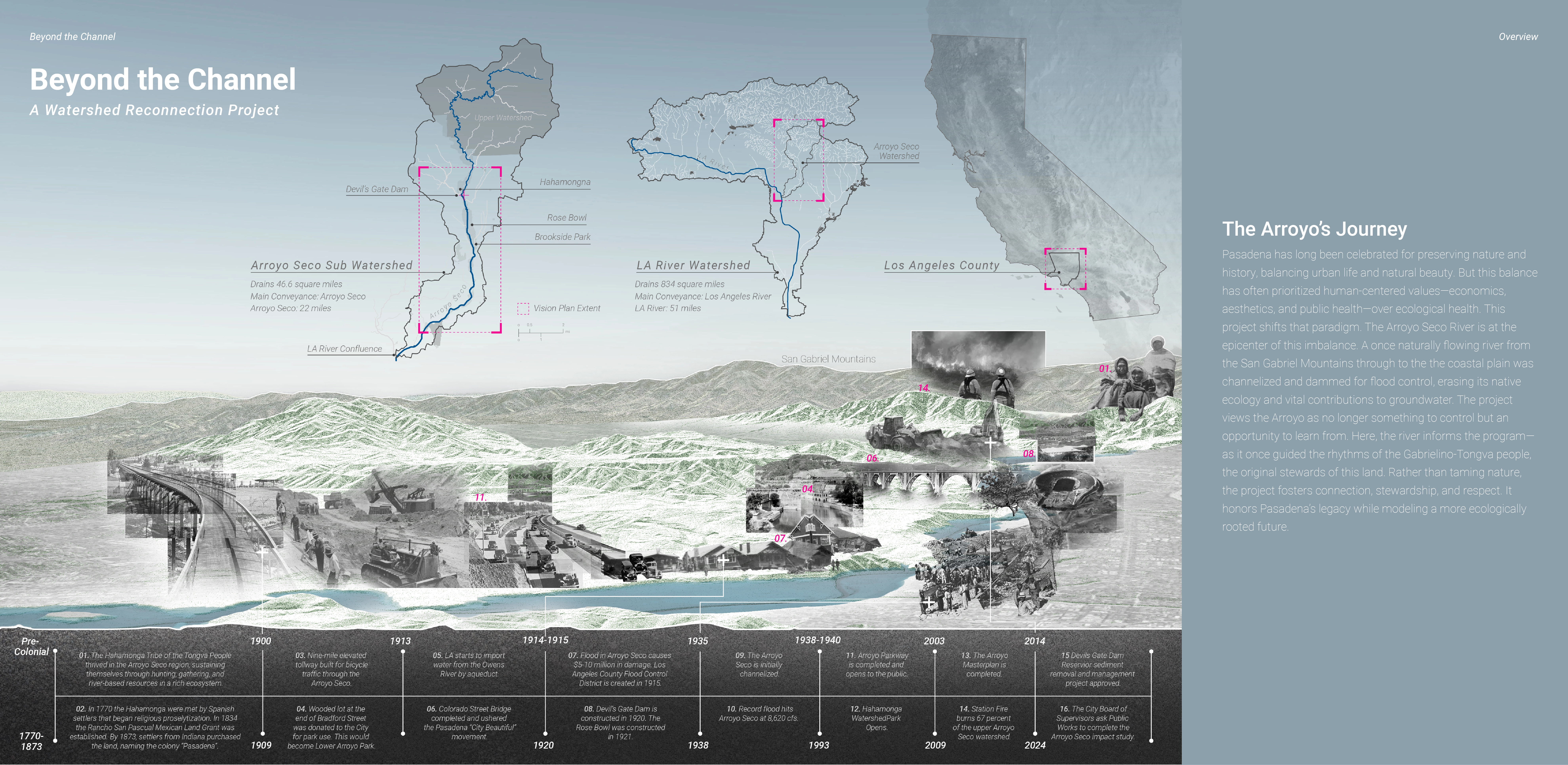 Pasadena is known for balancing urban life and natural beauty. But this balance has prioritized economics, aesthetics, and recreation over ecological and public health. The Arroyo Seco is at the epicenter of this imbalance. A once meandering river was channelized and dammed for flood control, erasing its native ecology and vital contributions to groundwater. The project no longer views the river as a control, but as an opportunity to learn from. In our vision, the river should inform the human programs as it once guided the rhythms of the indigenous Gabrielino-Tongva people. The project fosters natural processes, connection, stewardship, and respect. It honors Pasadena’s legacy while envisioning a more resilient, ecologically rooted future.