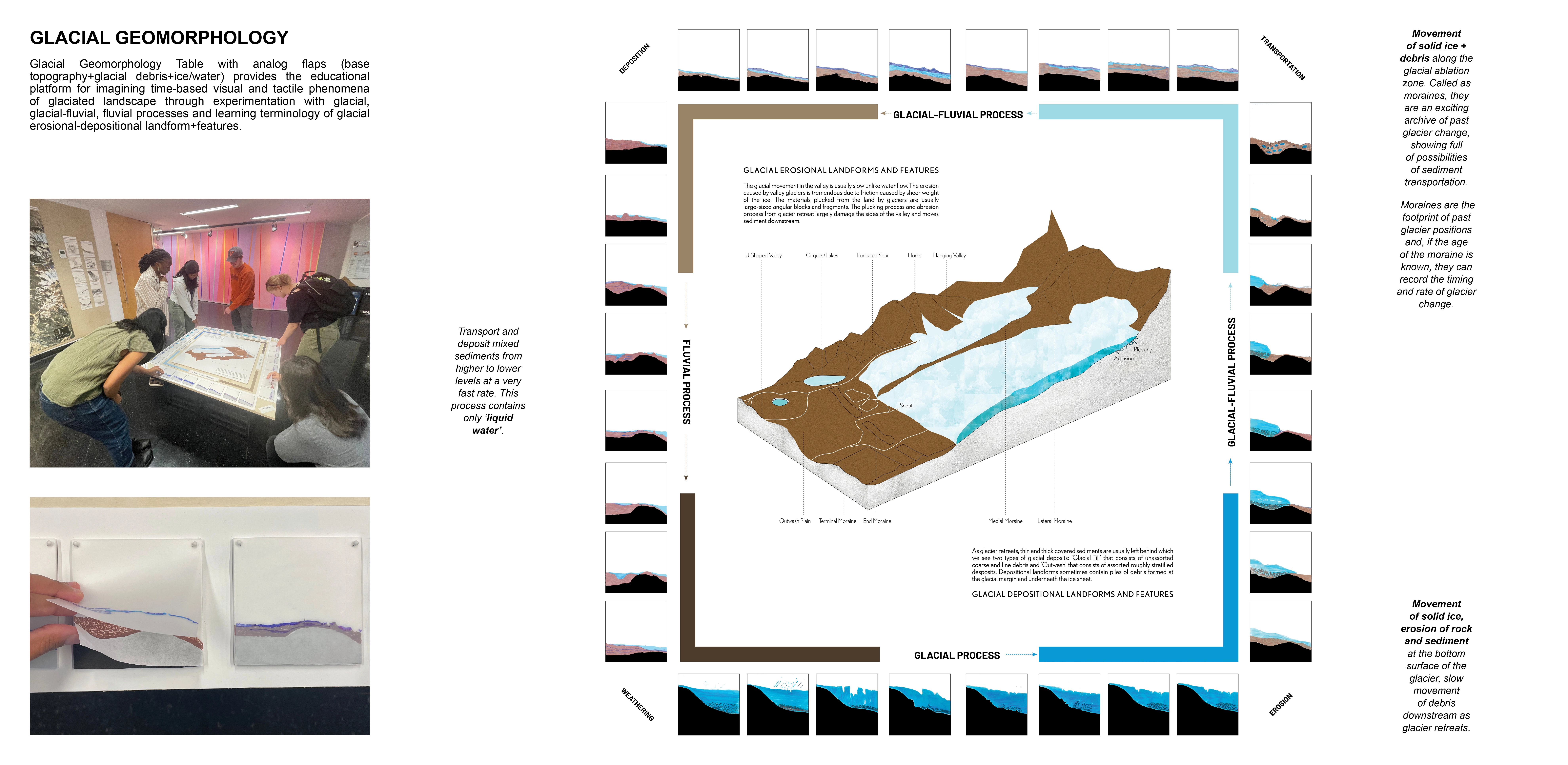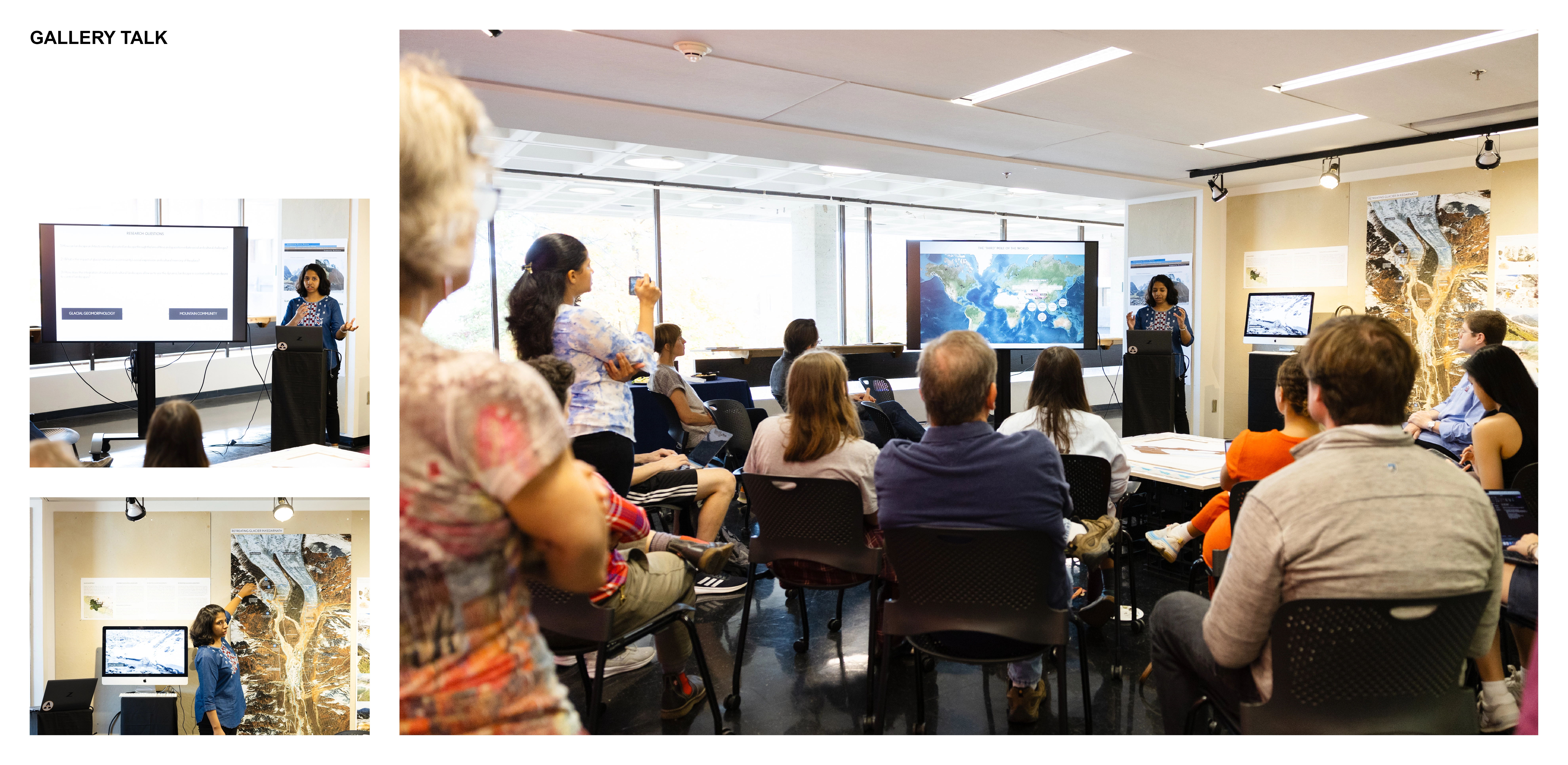 Audience: A 45-minute gallery talk accompanied the exhibition where storytelling played a central role in making glacial geomorphology concepts inclusive and accessible to link ice dynamics with lived experiences. The talk prompted questions on how the landscape architecture field might more meaningfully respond to upstream landscape vulnerabilities. Over 100 visitors engaged with the exhibition where conversations revealed a shared urgency to engage more deeply with landscapes in flux.