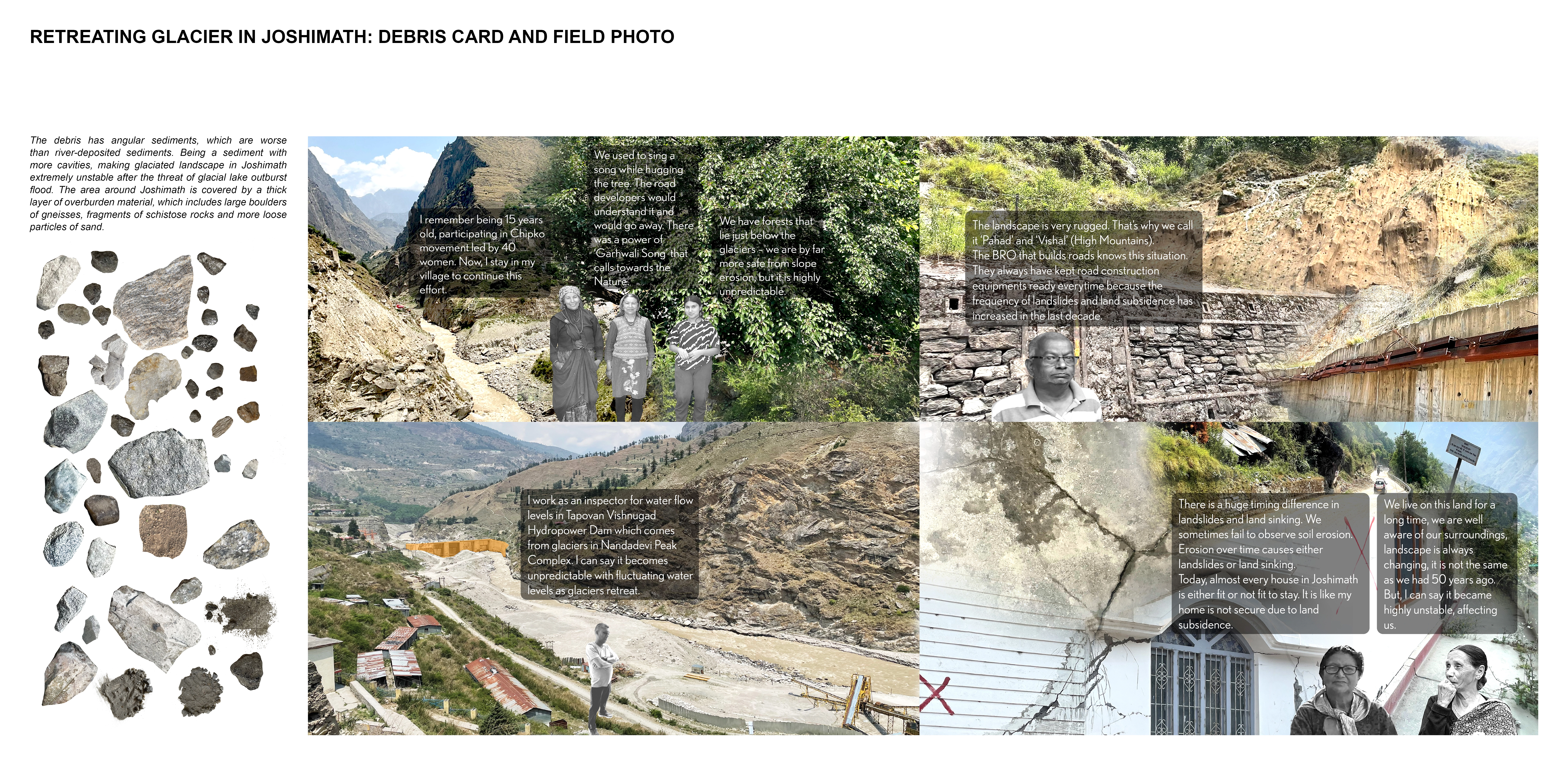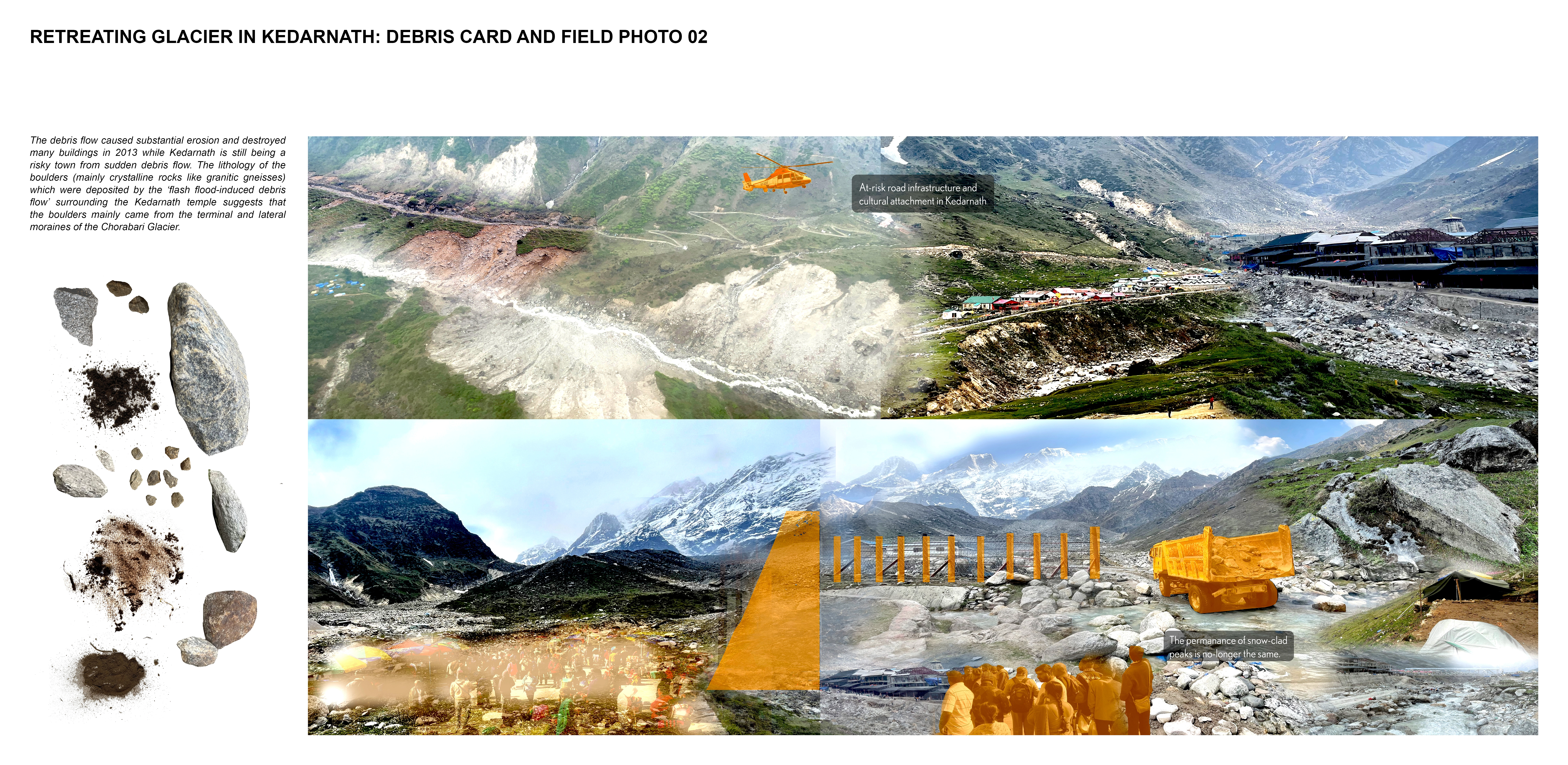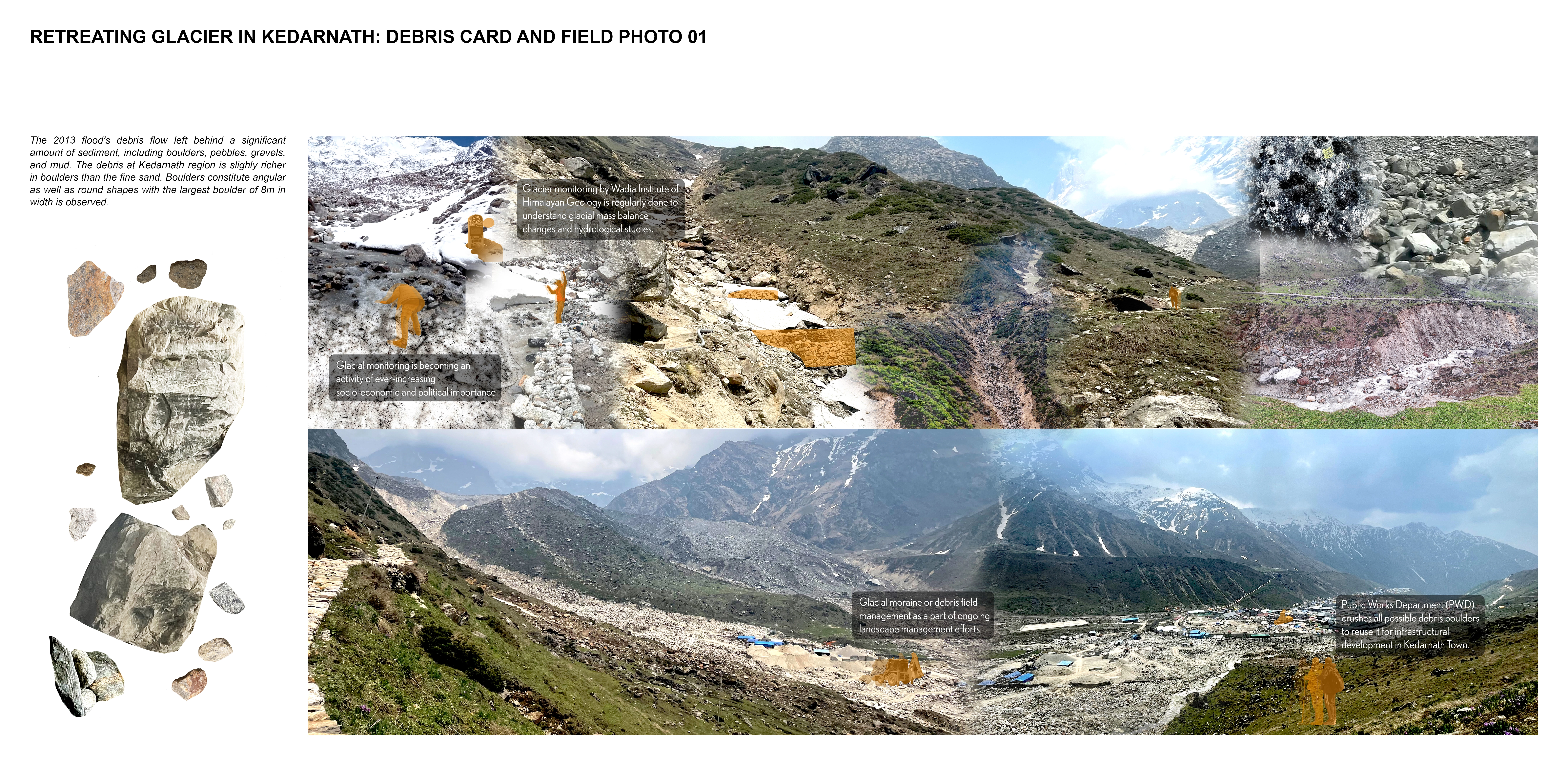 Purpose: Often called the “Third Pole of the World”, the Himalayas are home to the largest number of alpine glaciers outside the Arctic and Antarctica. These glaciated landscapes are not only vital freshwater reserves but also sensitive climate indicators. In the Garhwal Himalayas of Uttarakhand, India, glacial retreat is no longer an invisible process. It is perceived highly through frequent and devastating glacial lake outburst floods (GLOFs). These events have become defining moments for upstream mountain communities navigating the risks posed by glacial debris - sediment left behind by retreating glaciers. As a graduate landscape architecture student who has travelled and hiked extensively in the Garhwal Himalayas, witnessing these transformations firsthand shaped an embodied-disembodied relationship with glacial debris, becoming a lens through which to develop the consciousness of landscape change at both nature and personal scales.