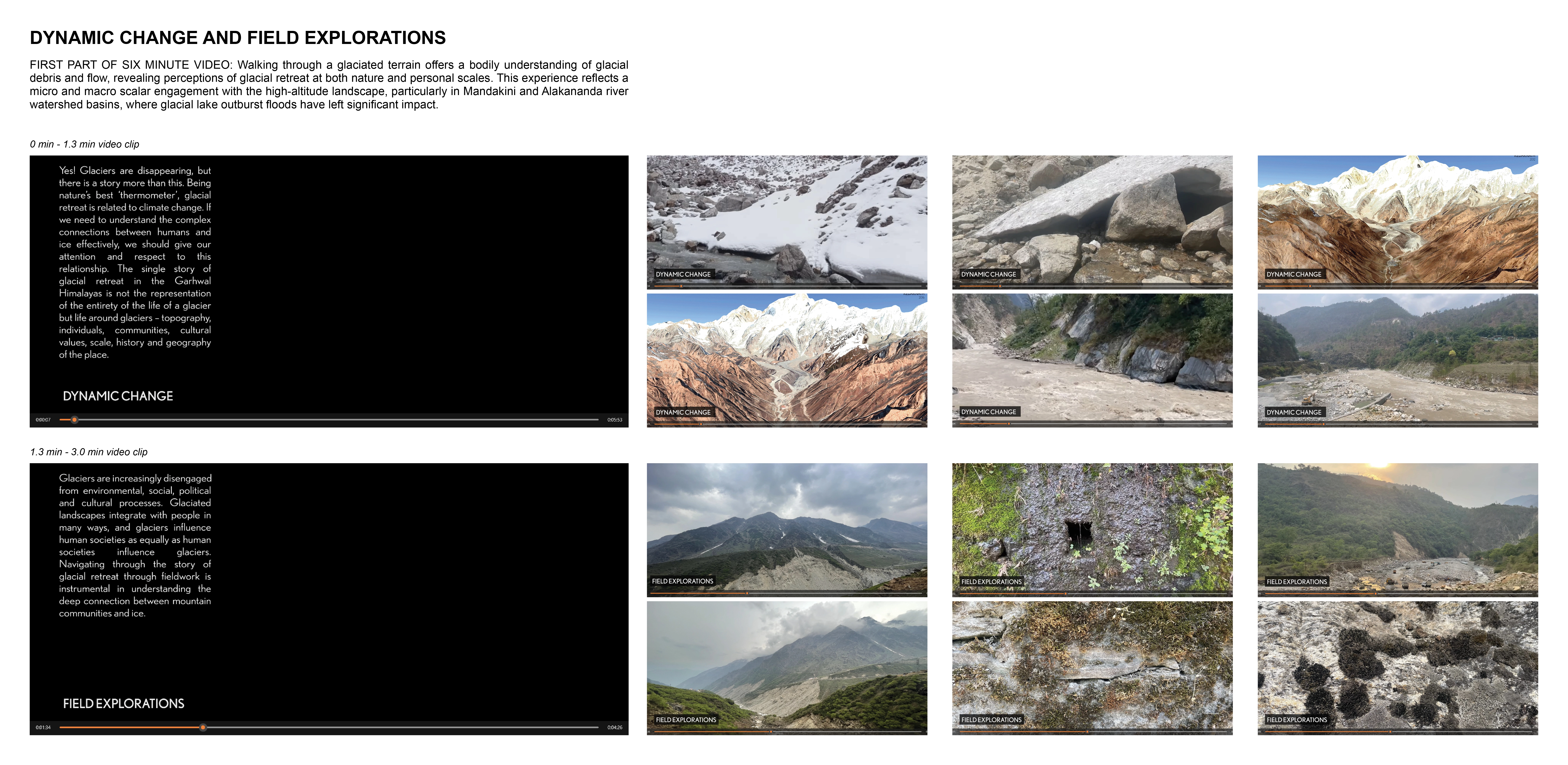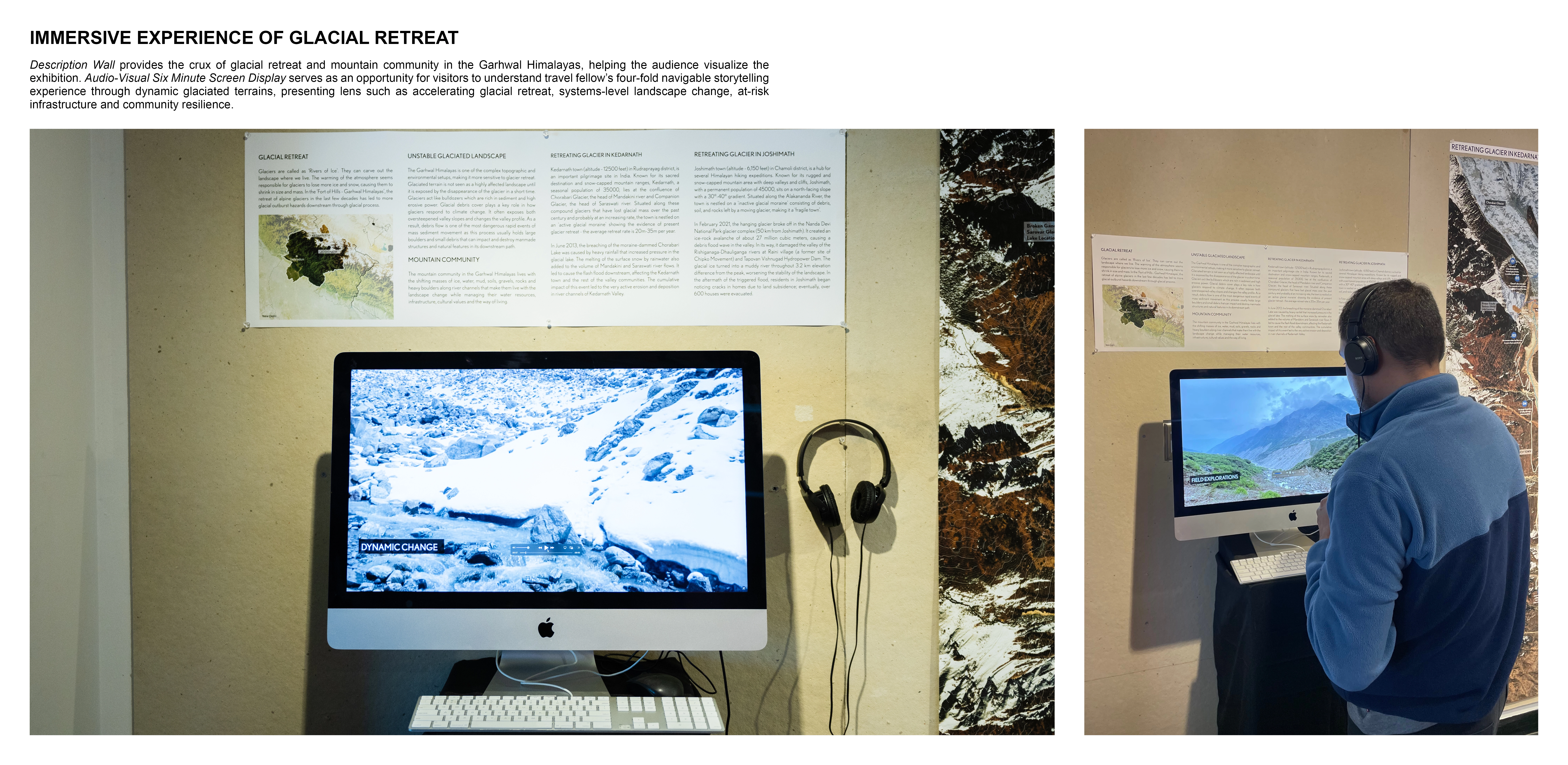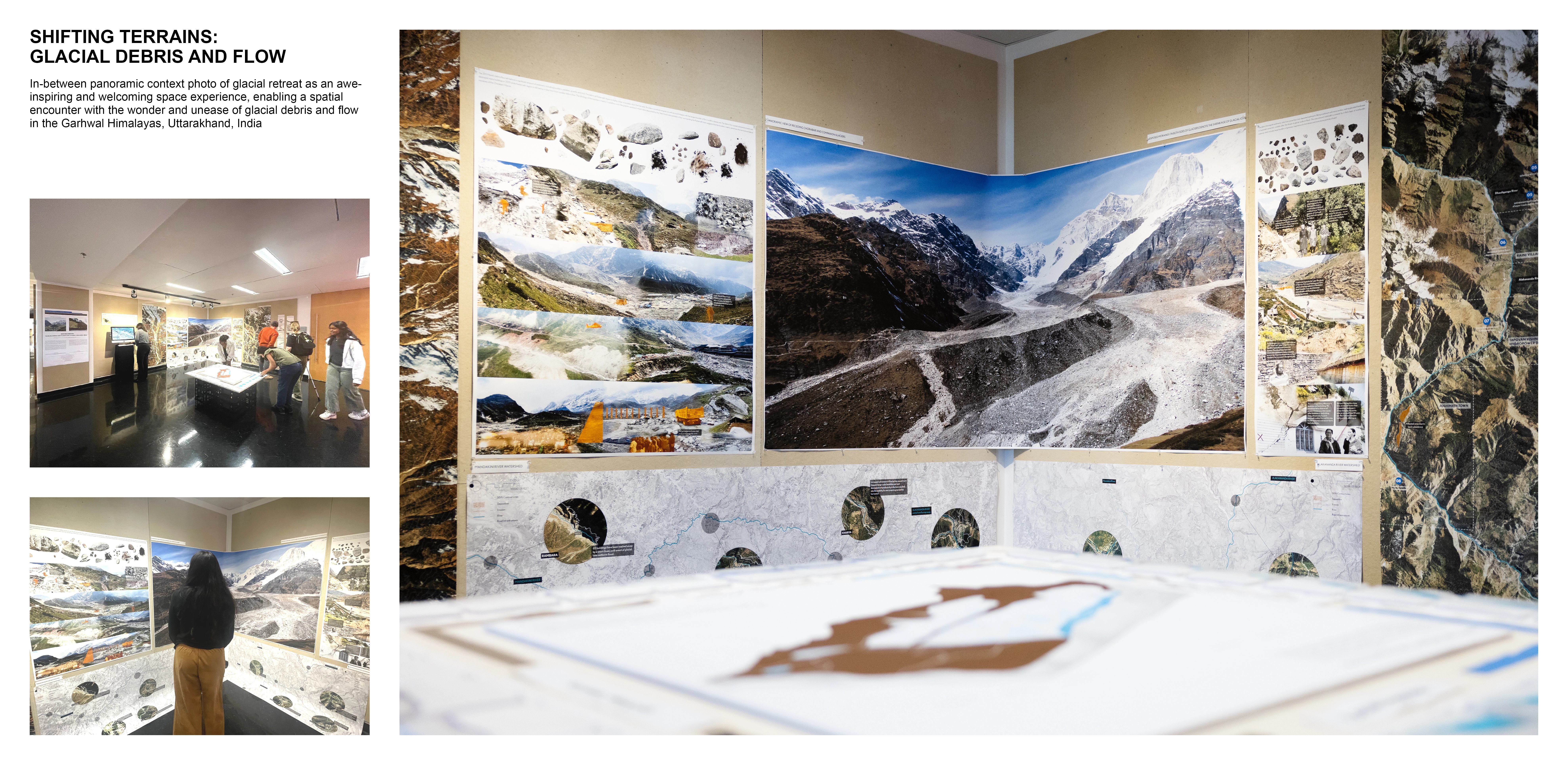 In the context of climate change, the rapid retreat of alpine glaciers is reshaping both upstream river infrastructure and socio-cultural values of mountain communities. The travel fellowship exhibition, led by a graduate landscape architecture student, investigates unstable glaciated landscapes in the Garhwal Himalayas, India, focusing on the 2013 and 2021 glacial lake outburst floods. By unpacking landscape change, it highlights the relationship between glacial geomorphology and mountain communities. As UNESCO and WMO have declared 2025 as the International Year of Glaciers' Preservation, the exhibition serves as a foundation for transdisciplinary dialogue to rethink the role of landscape architecture in high-altitude mountain regions.