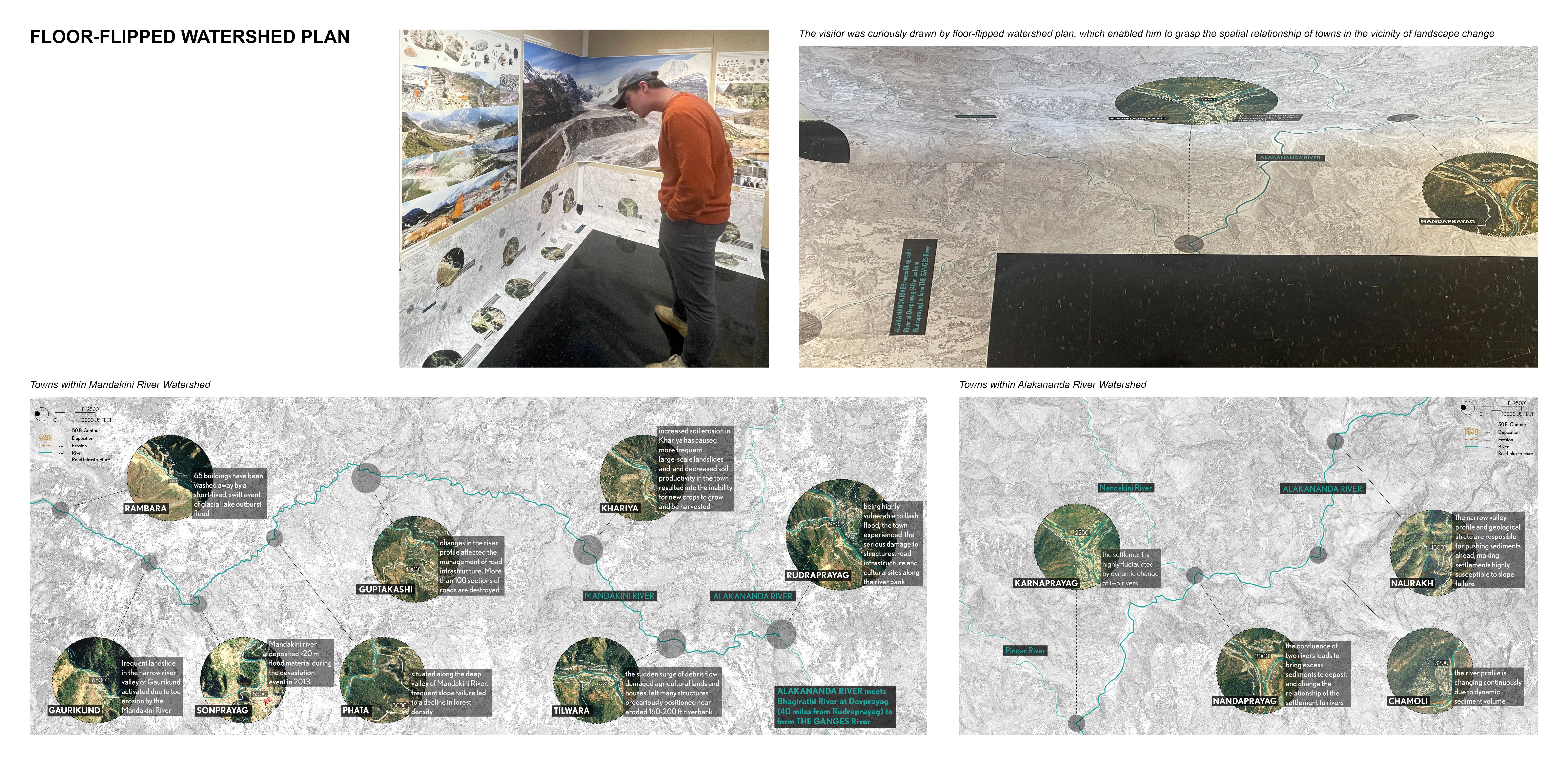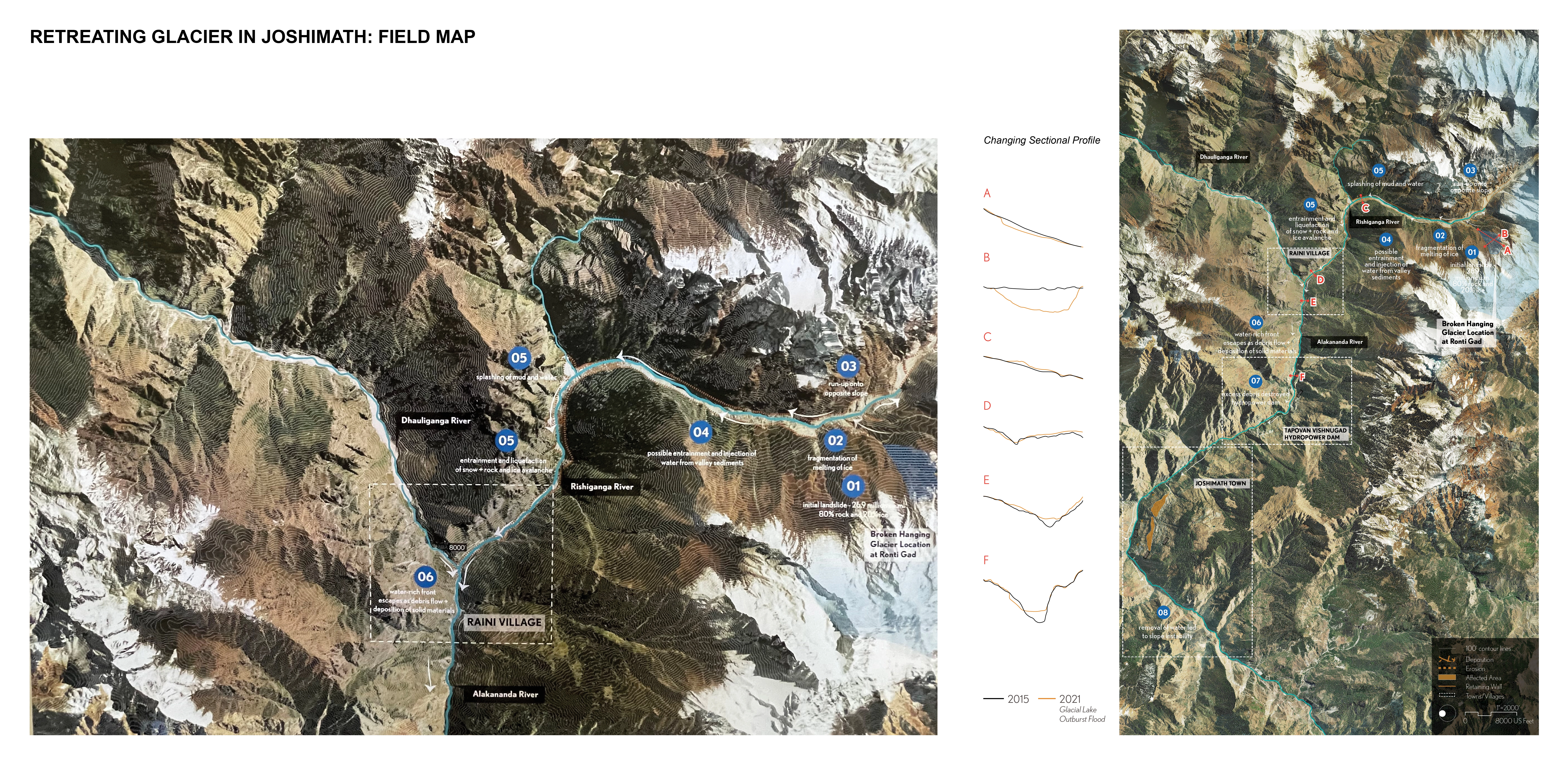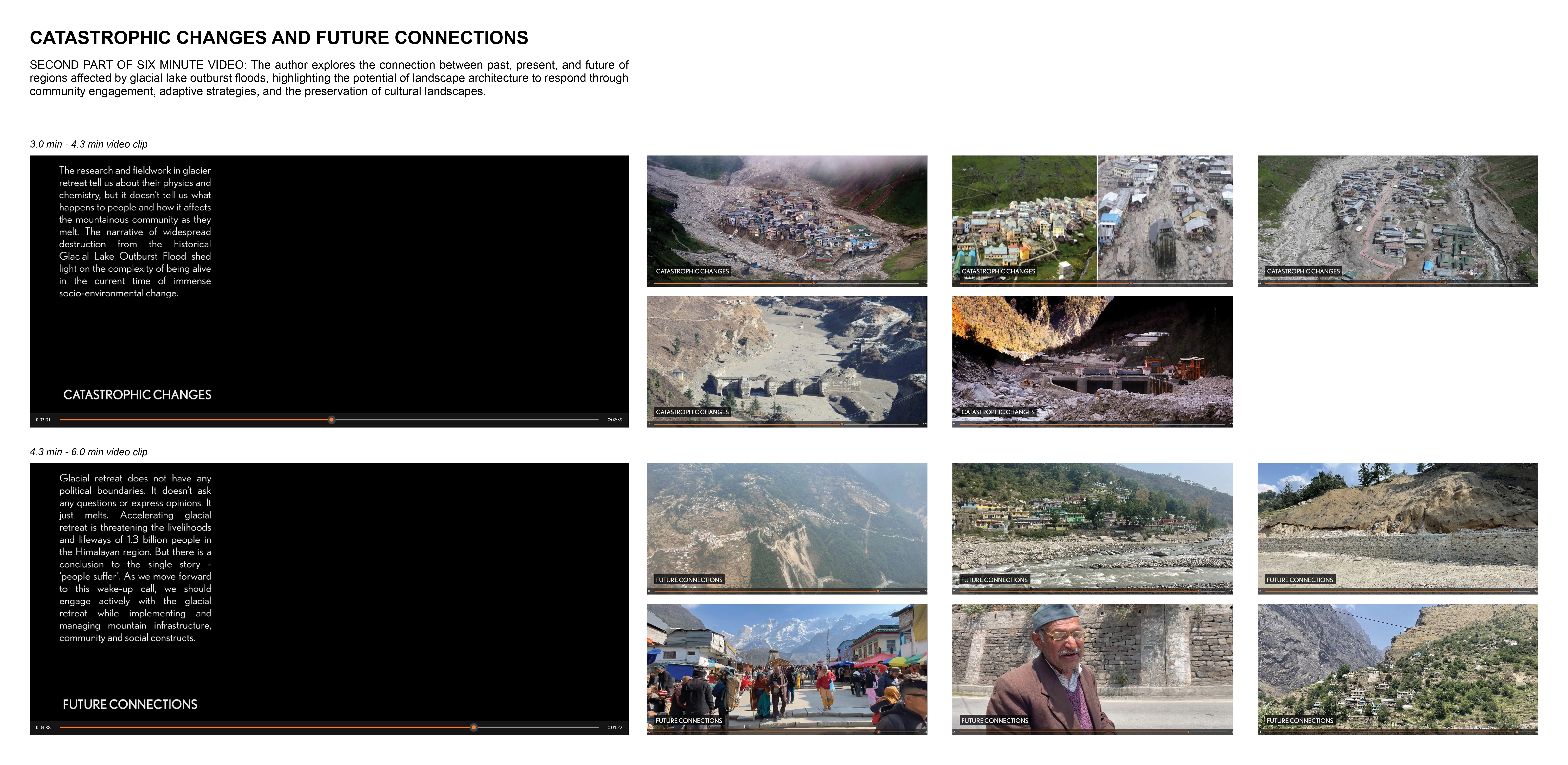 In the context of climate change, the rapid retreat of alpine glaciers is reshaping both upstream river infrastructure and socio-cultural values of mountain communities. The travel fellowship exhibition, led by a graduate landscape architecture student, investigates unstable glaciated landscapes in the Garhwal Himalayas, India, focusing on the 2013 and 2021 glacial lake outburst floods. By unpacking landscape change, it highlights the relationship between glacial geomorphology and mountain communities. As UNESCO and WMO have declared 2025 as the International Year of Glaciers' Preservation, the exhibition serves as a foundation for transdisciplinary dialogue to rethink the role of landscape architecture in high-altitude mountain regions.