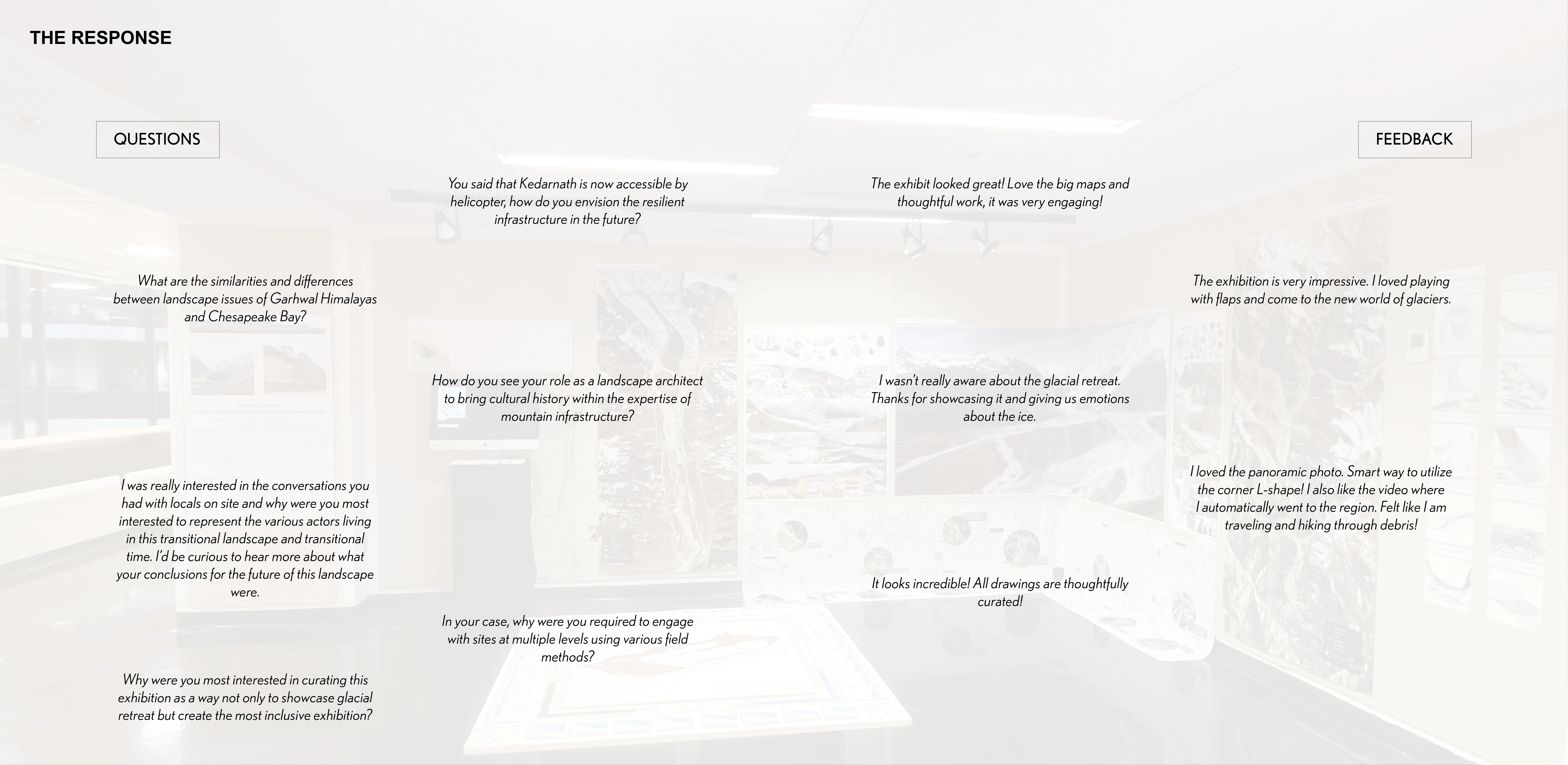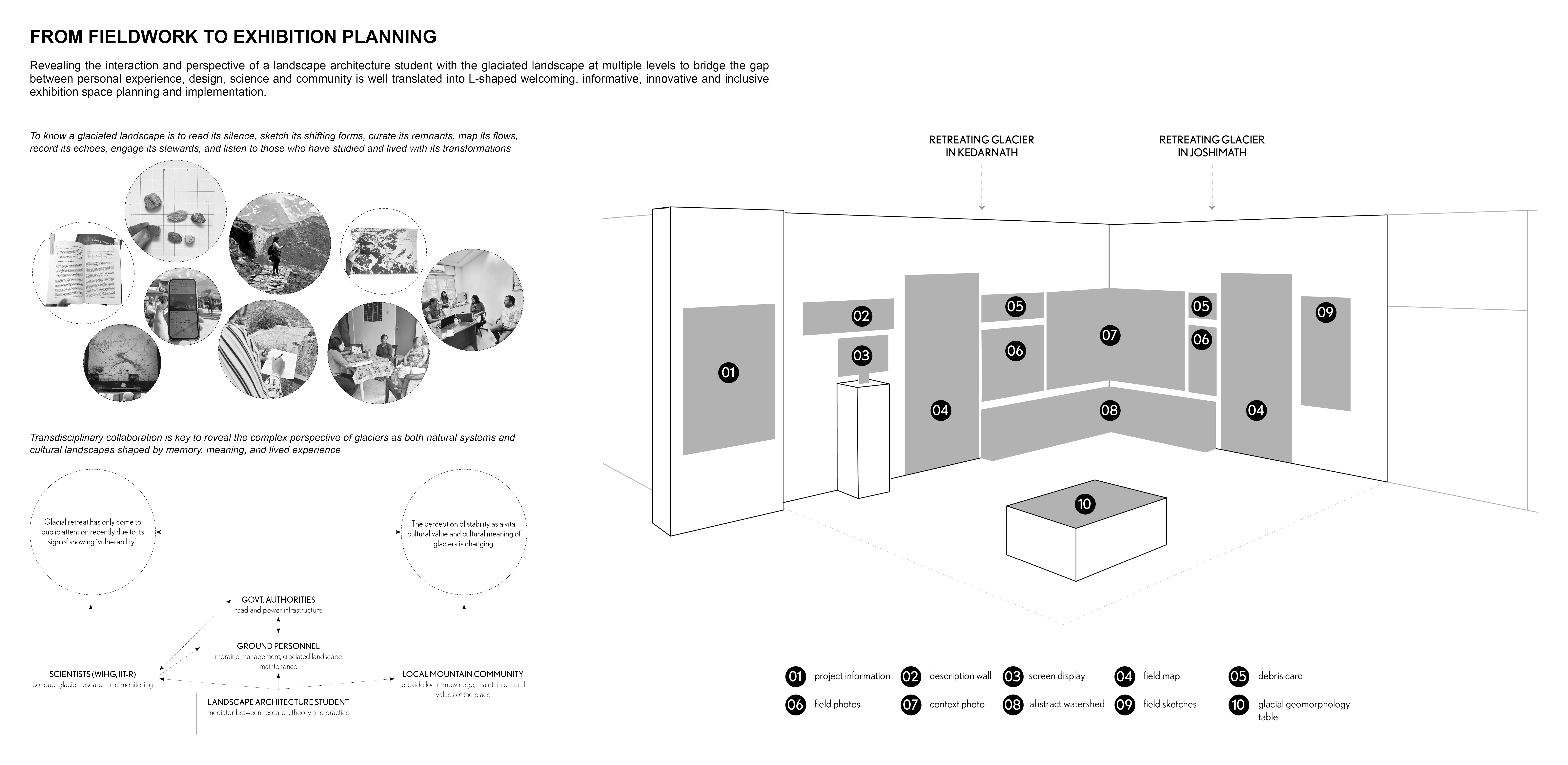 Method: In the fall of 2024, the travel fellowship exhibition was designed to keep in mind one objective - to provide an opportunity for the diverse public to engage, gather, sense, discuss and connect themselves with retreating glaciers. From three-week fieldwork to assembling over nine months, the four-week inclusive and innovative public exhibition aimed at raising awareness of glacial-fluvial landscapes. Through ten themes - combining immersive walking experience, field maps, annotated photographs, sketches and interactive models, it portrayed the dynamic and temporal nature of the high-altitude terrain.