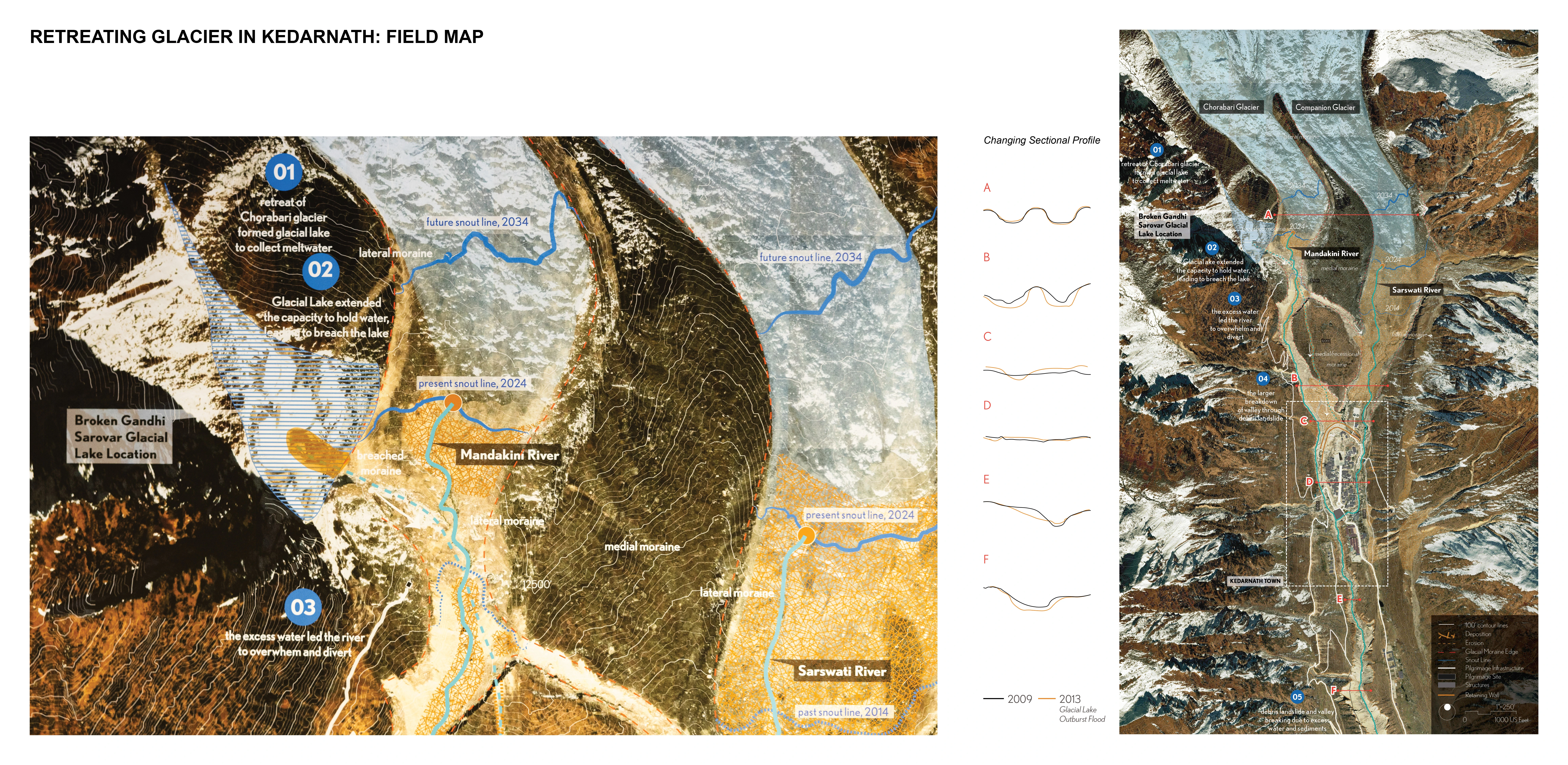 Message: While landscape architecture has traditionally focused on sea-level rise in downstream coastal environments, upstream glacial-fluvial processes remain underrepresented in the field. By finding resonance in Gena Wirth’s quote from Unlock Alameda Creek: “We must look Upstream” for the conceptual anchor of traveling fellowship, the research and fieldwork focused on retreating glaciers of two sites: the Chorabari + Companion Compound Glacier in Kedarnath and the Hanging Glacier in Joshimath. These sites were chosen for their geomorphological complexity and for their roles in recent GLOFs - the 2013 Kedarnath disaster and the 2021 Chamoli disaster. Additional visits to nearby towns enriched an understanding of upstream infrastructural vulnerability, ecological shifts and memory of the place that challenges traditional notions of landscape stability.