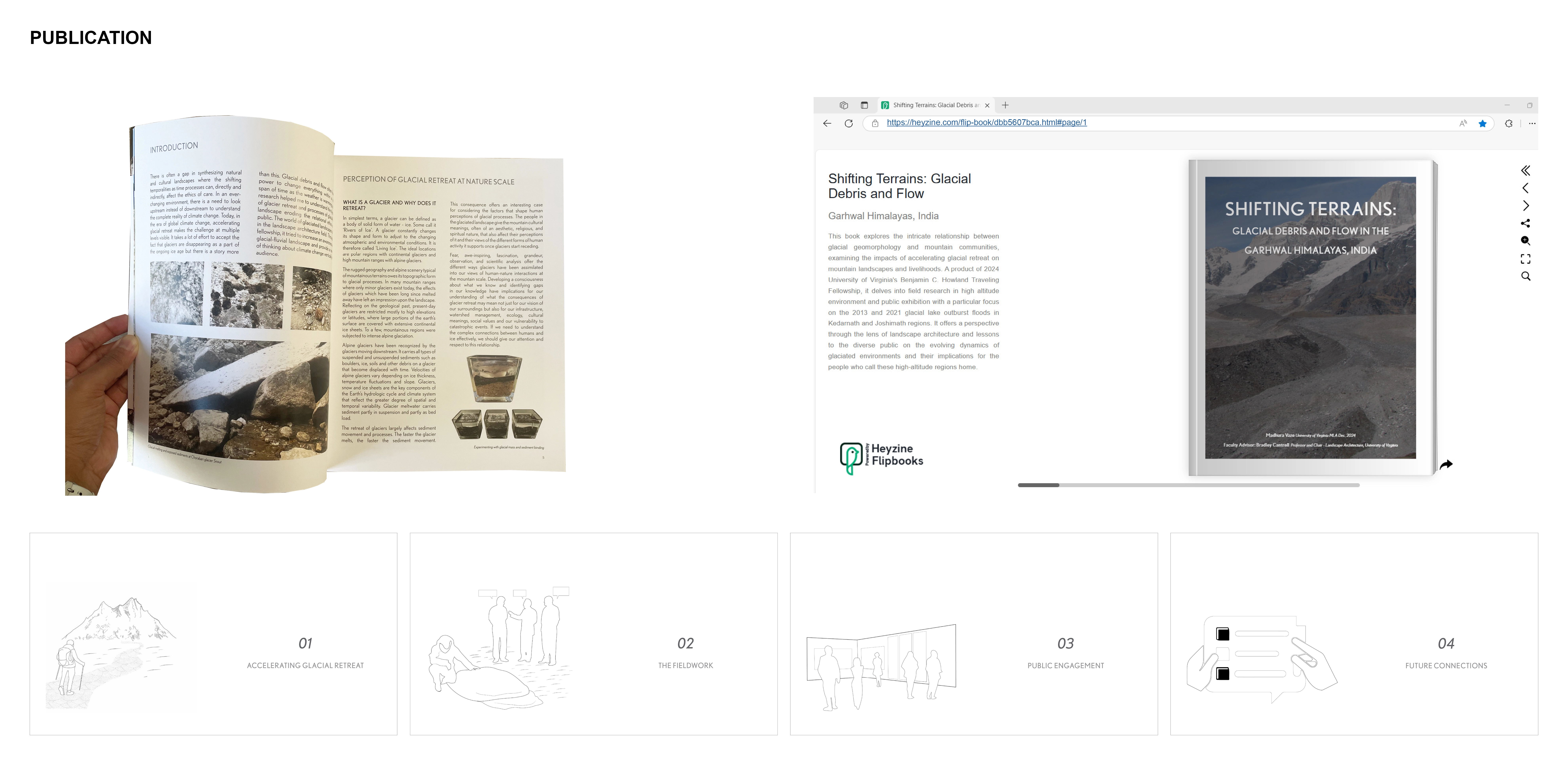 Distribution and Impact: A key insight was that retreating landscapes can act as media of communication and public engagement. Audience reflections and exhibition process were incorporated into a research booklet publication, extending the reach of the exhibition and inviting continued conversation. As UNESCO and the WMO declared 2025 the International Year of Glaciers’ Preservation, this work becomes especially timely. It calls for the landscape architecture community to reimagine glaciated regions as both ecological systems and cultural terrains in transition.