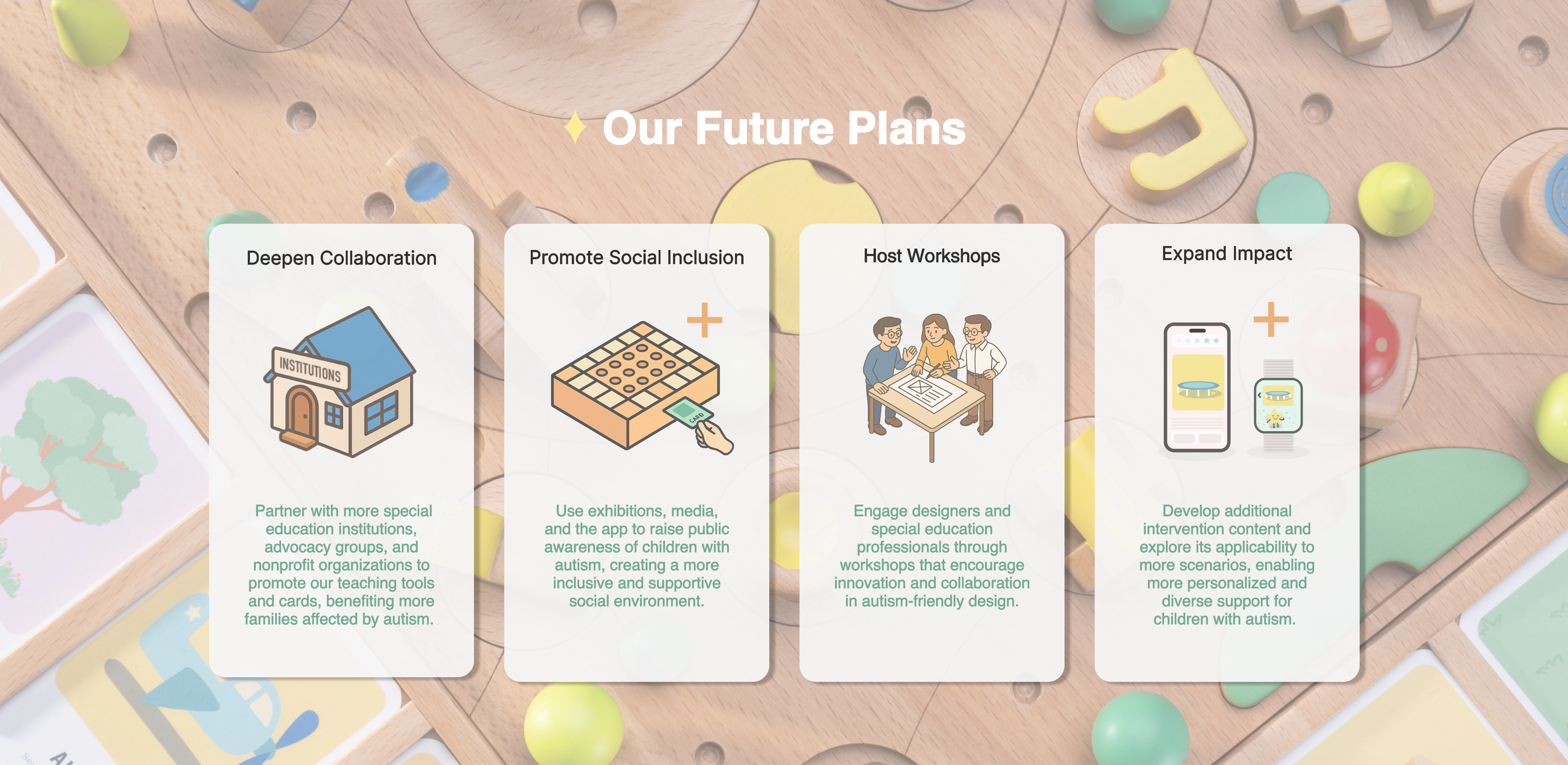 1.Deepen Collaboration: Partner with more special education institutions, advocacy groups, and nonprofit organizations to promote our teaching tools and cards, benefiting more families affected by autism.