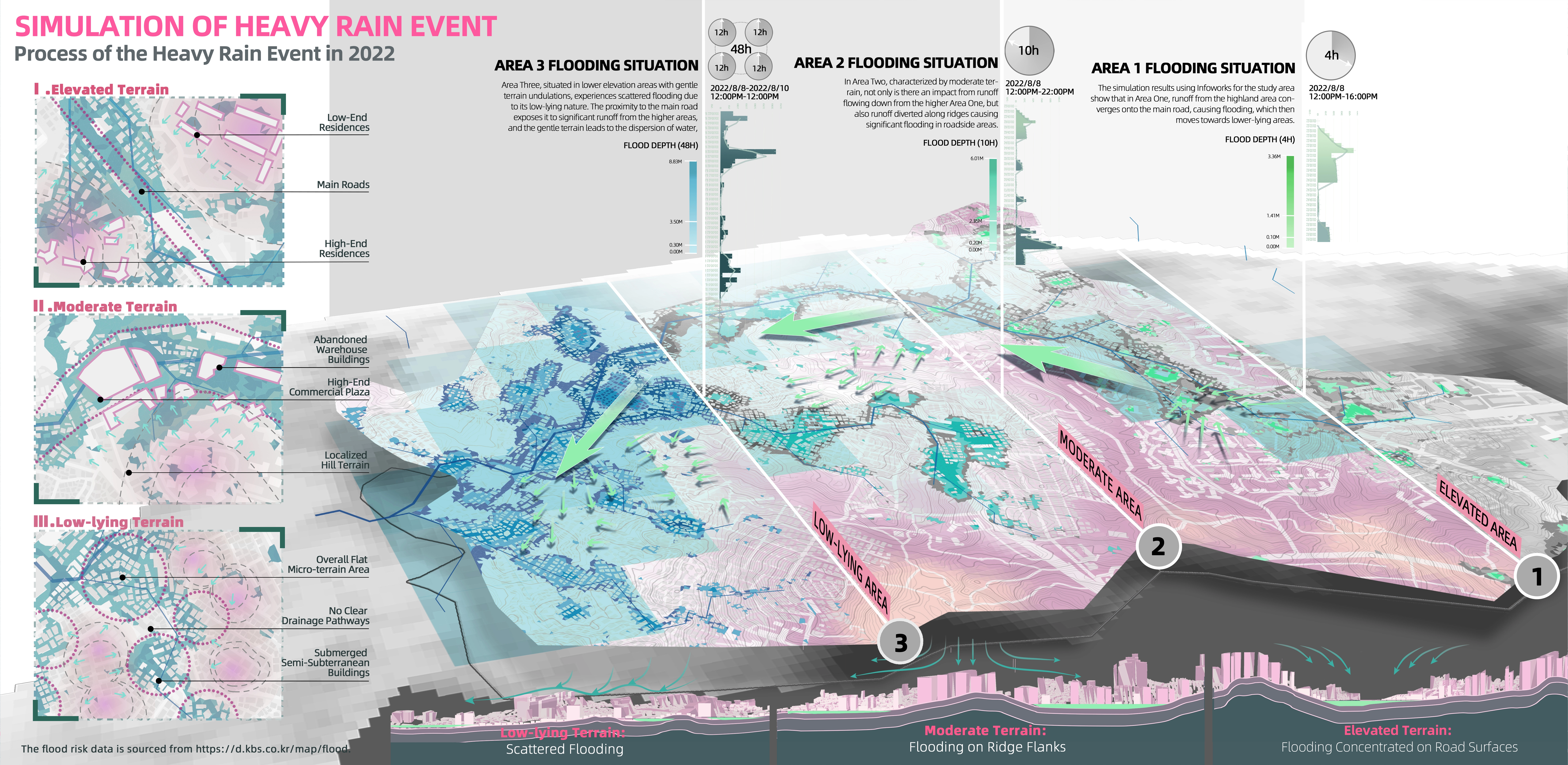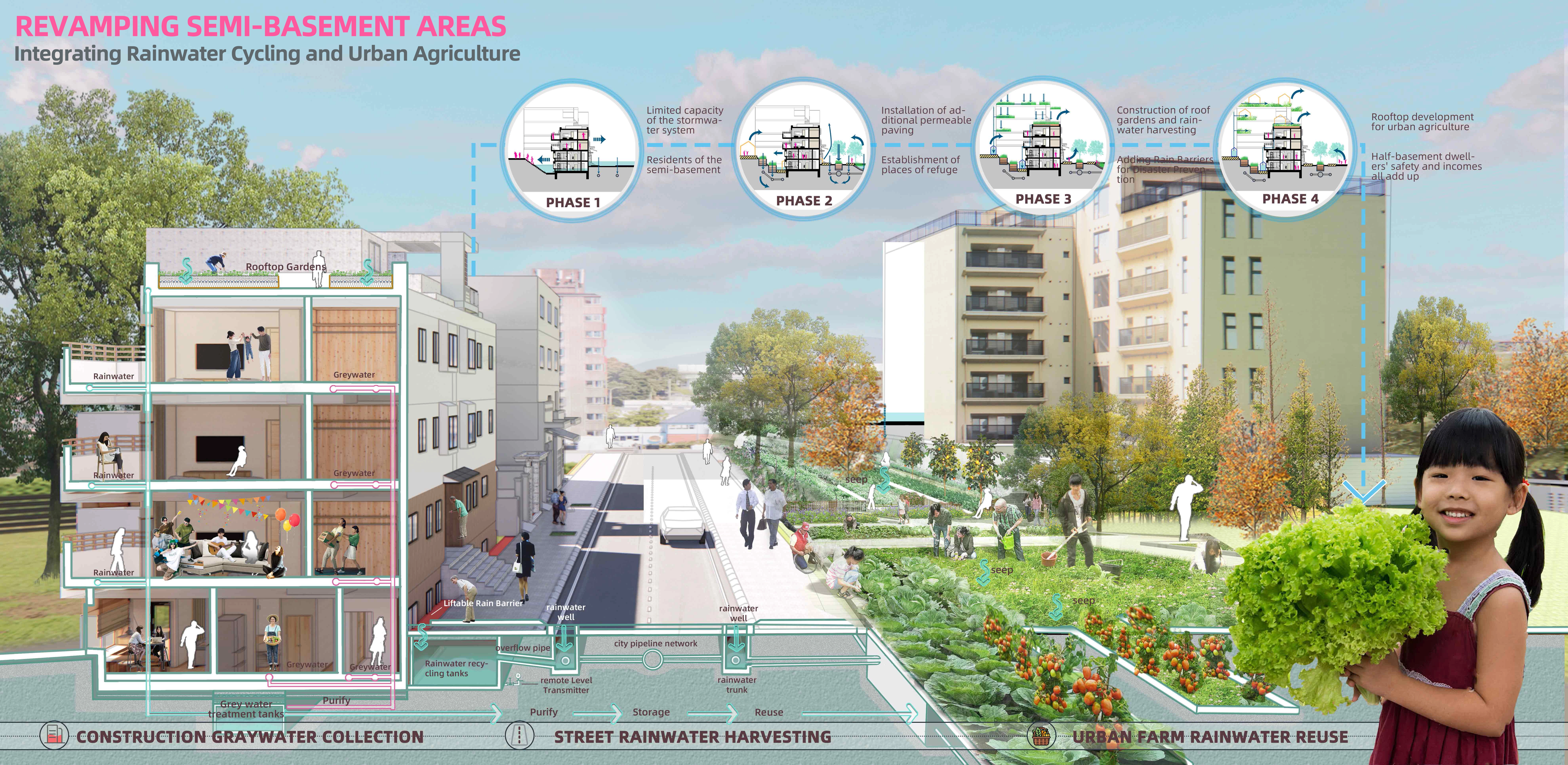 Node 3: The Wavelet area, characterized by lower elevation, dense clusters of semi-basement dwellings, limited available space, and a high flood risk, requires innovative strategies to address these challenges effectively. The proposed measures include: