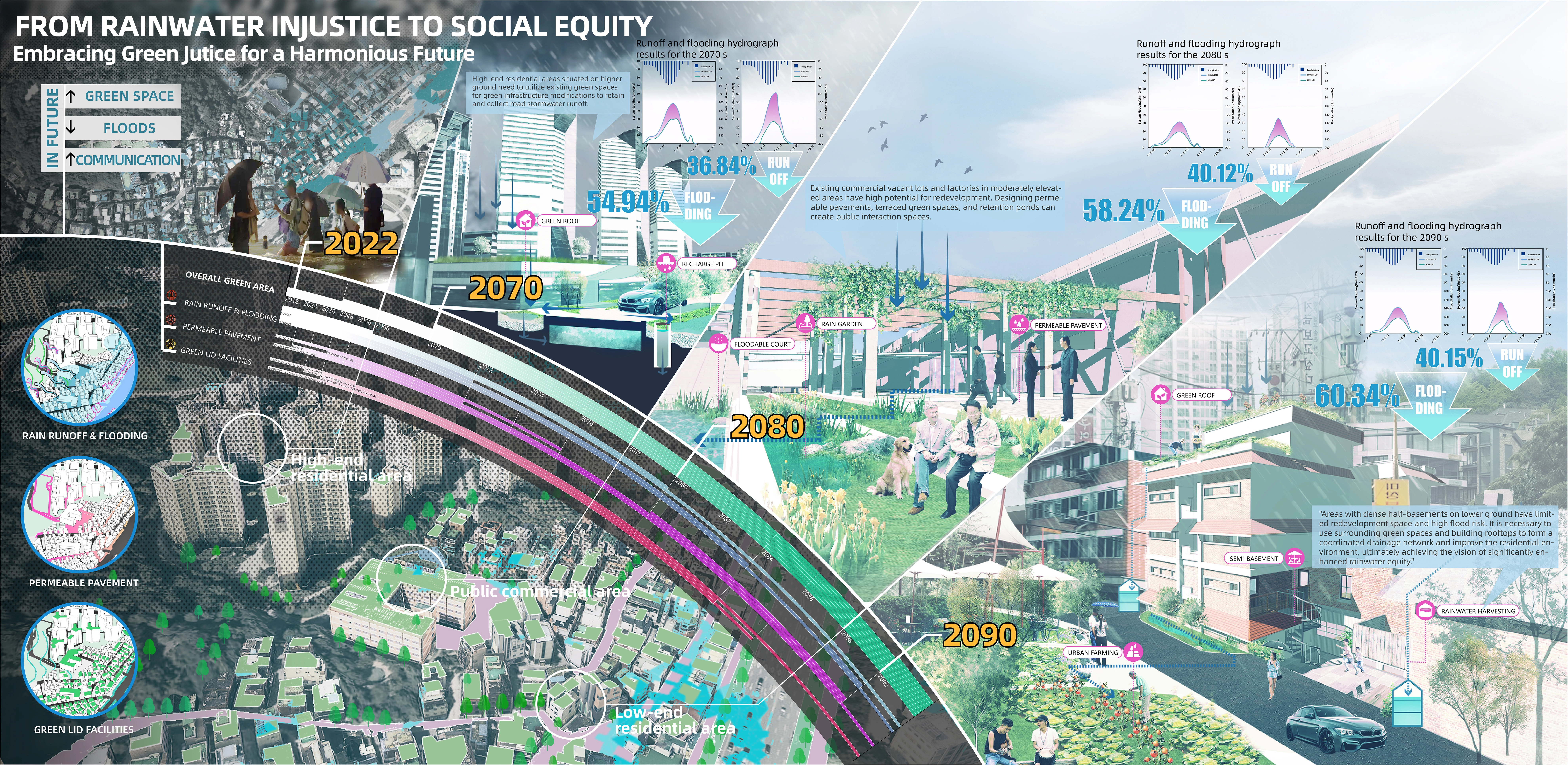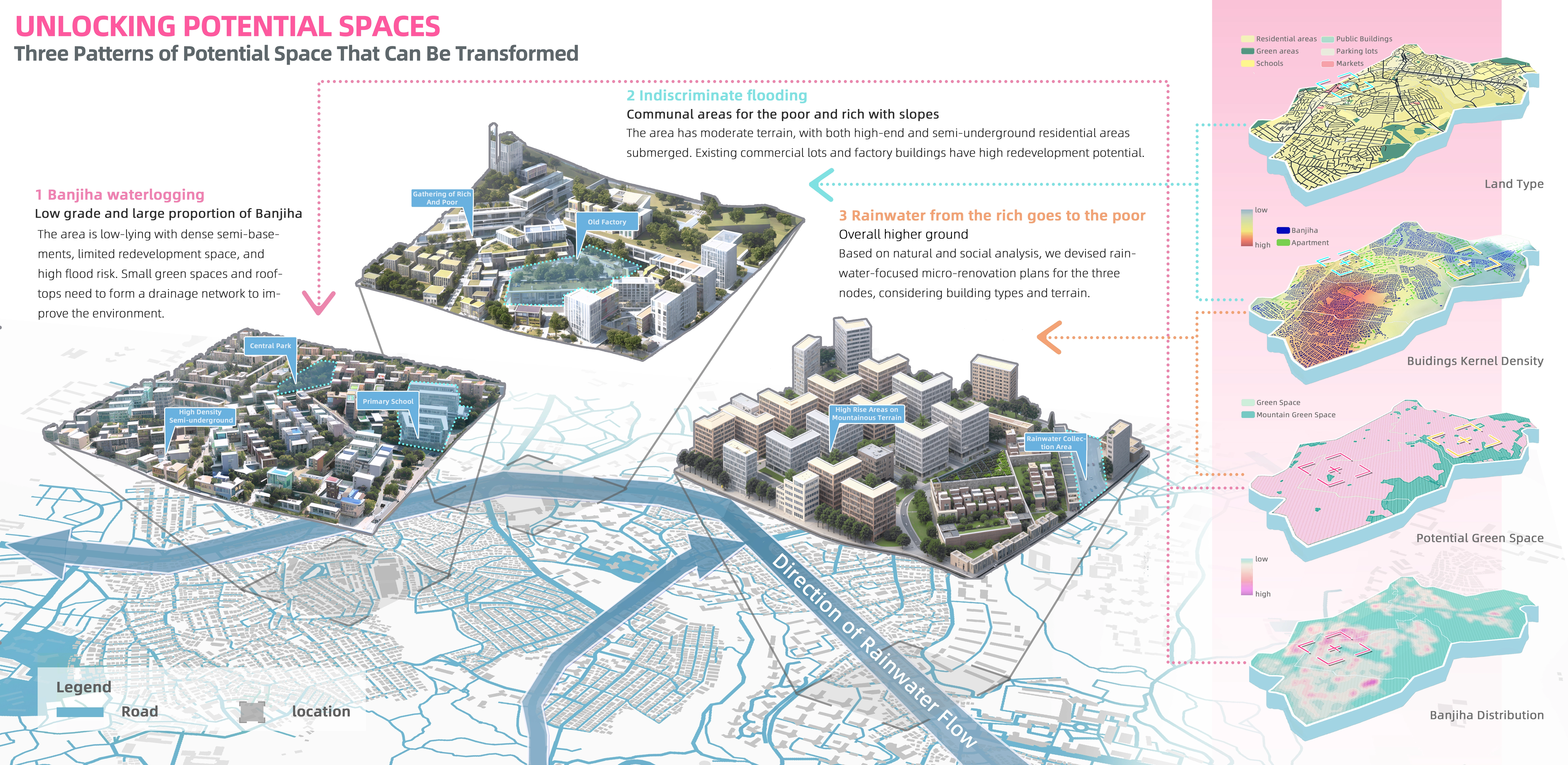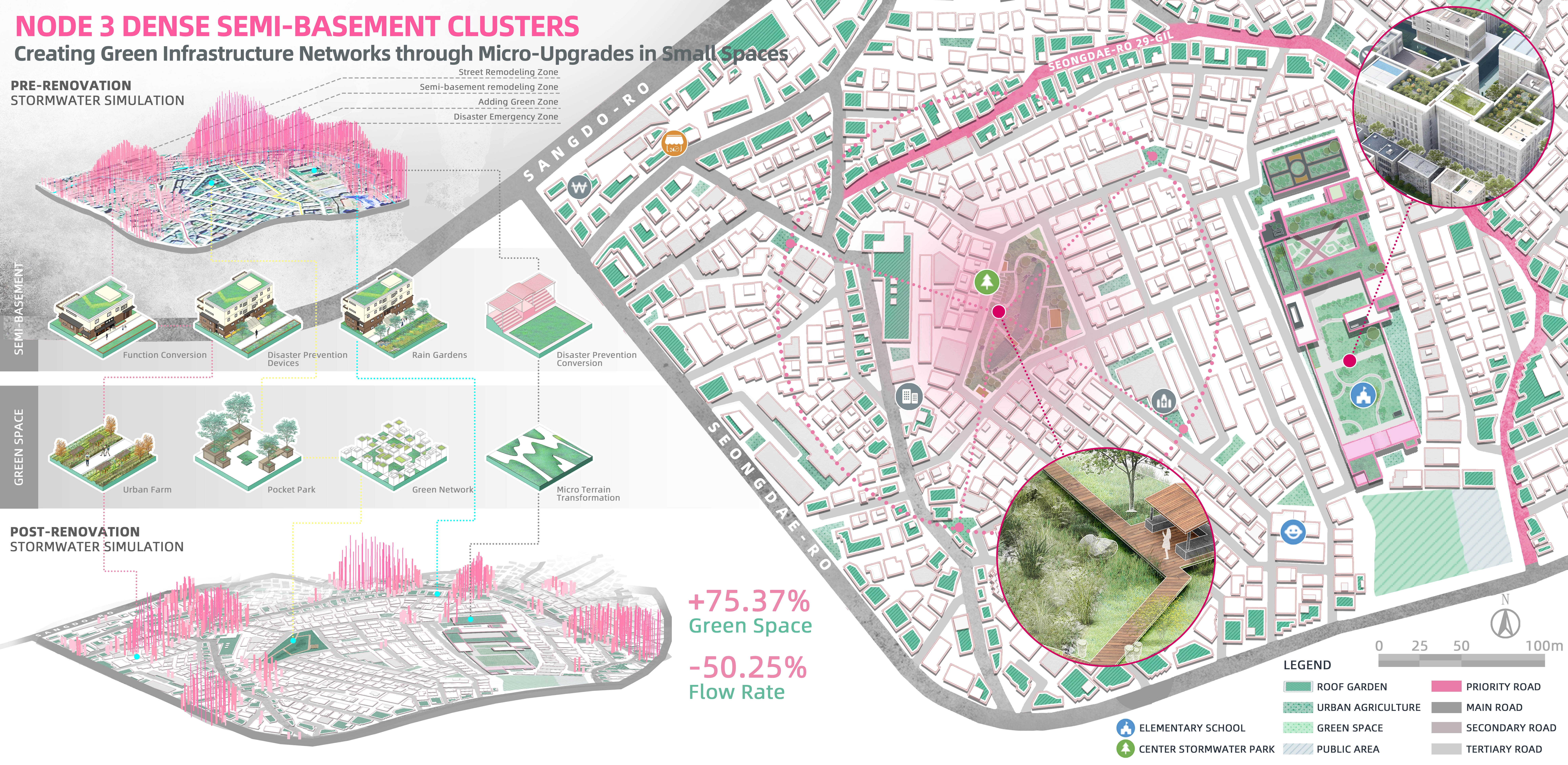 Heavy rainfall poses a significant threat in Seoul, South Korea. Semi-basements experience higher property damage and casualties due to urban flooding. To address this, we propose a synergistic urban rainwater micro-upgrading strategy and a path towards green justice to address the challenges and alleviate wealth disparity in Sangdo-dong, Dongjak District. The project offers three strategies: divert rainwater in affluent areas with higher elevation to minimize impacts on lower areas, transform vacant spaces into green infrastructure in economically diverse regions, and establish a network of rainwater pocket parks, pre-during-post disaster framework, and detailed rainwater management in low-lying semi-basement areas.
