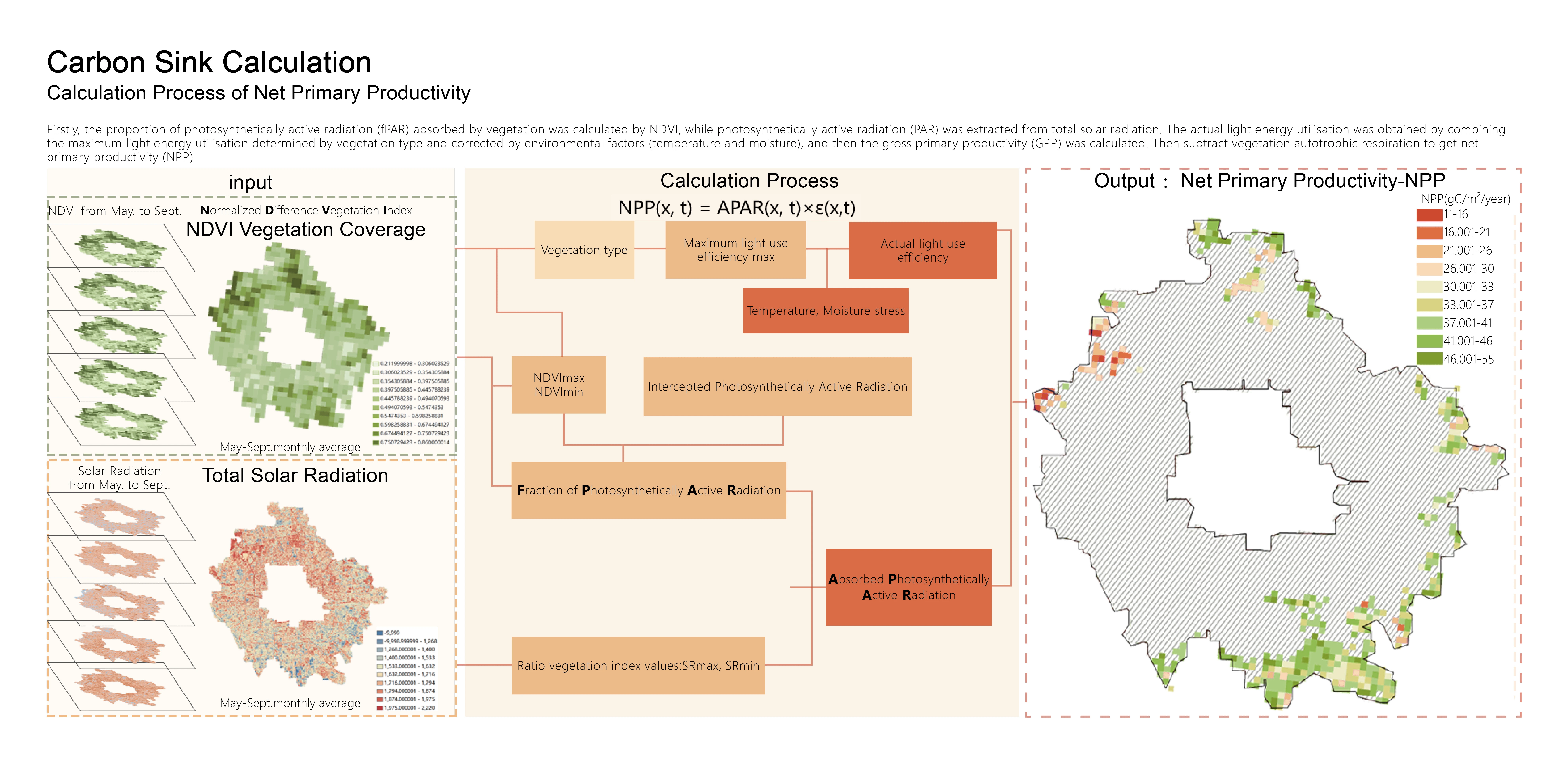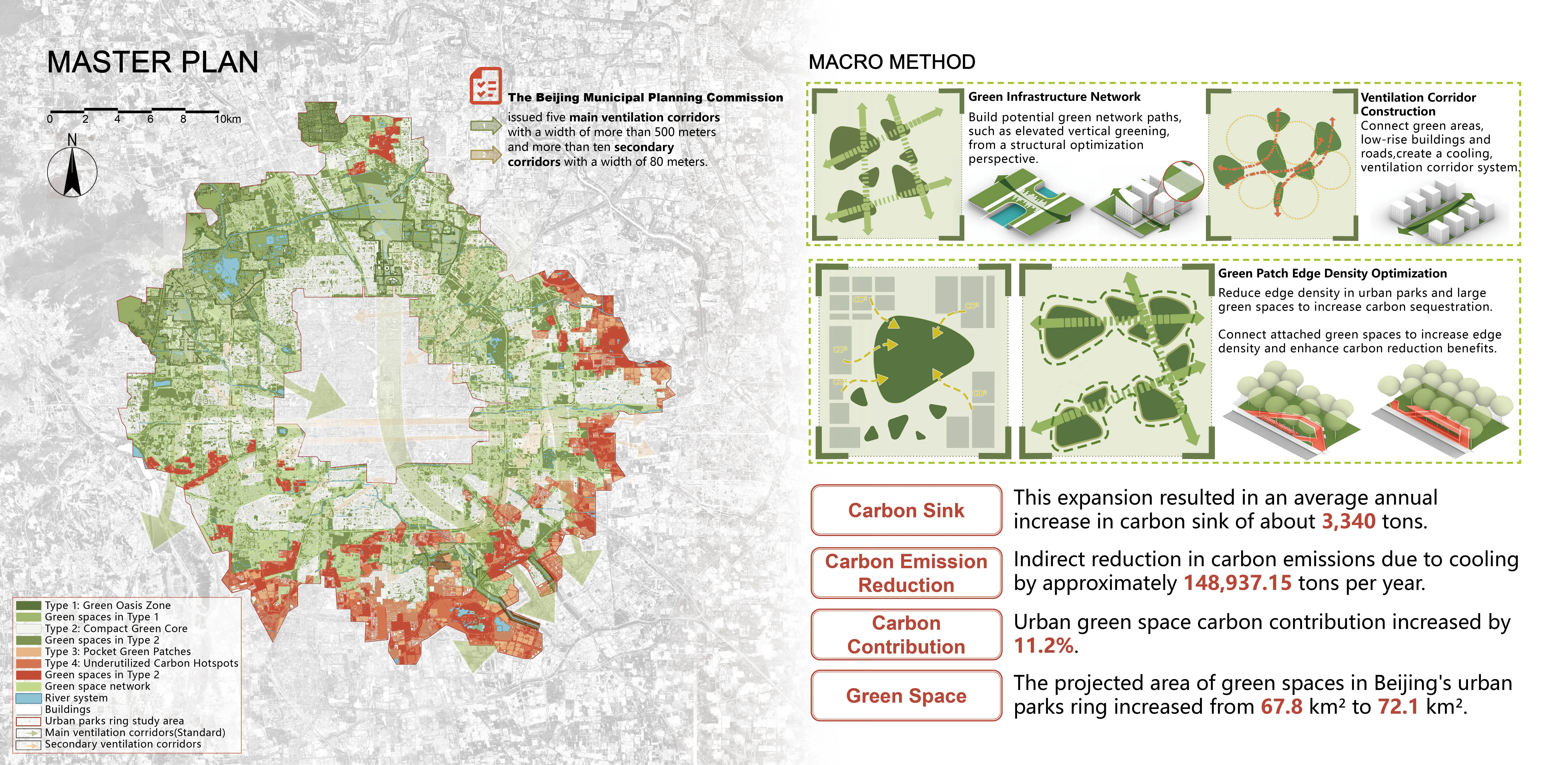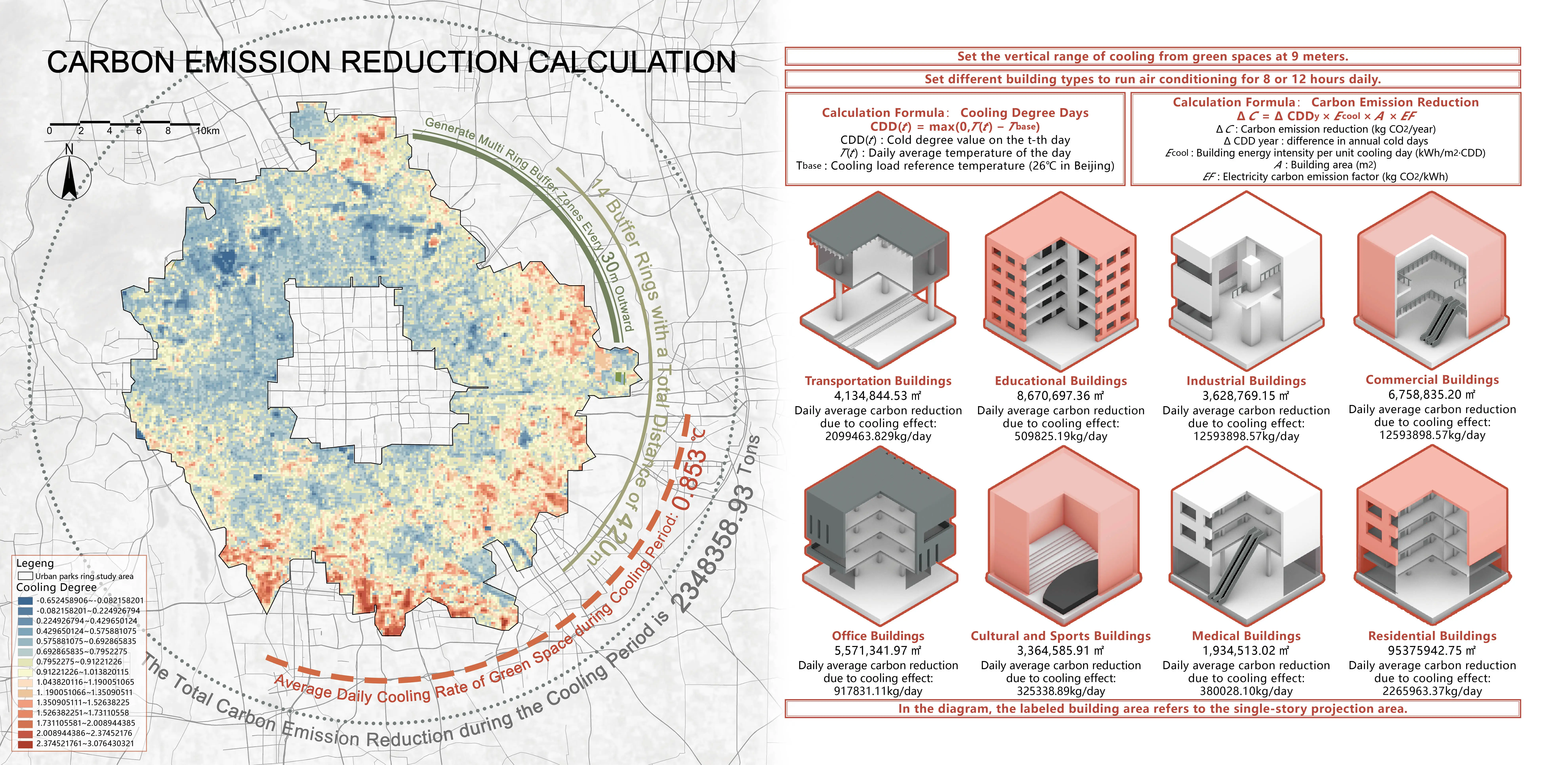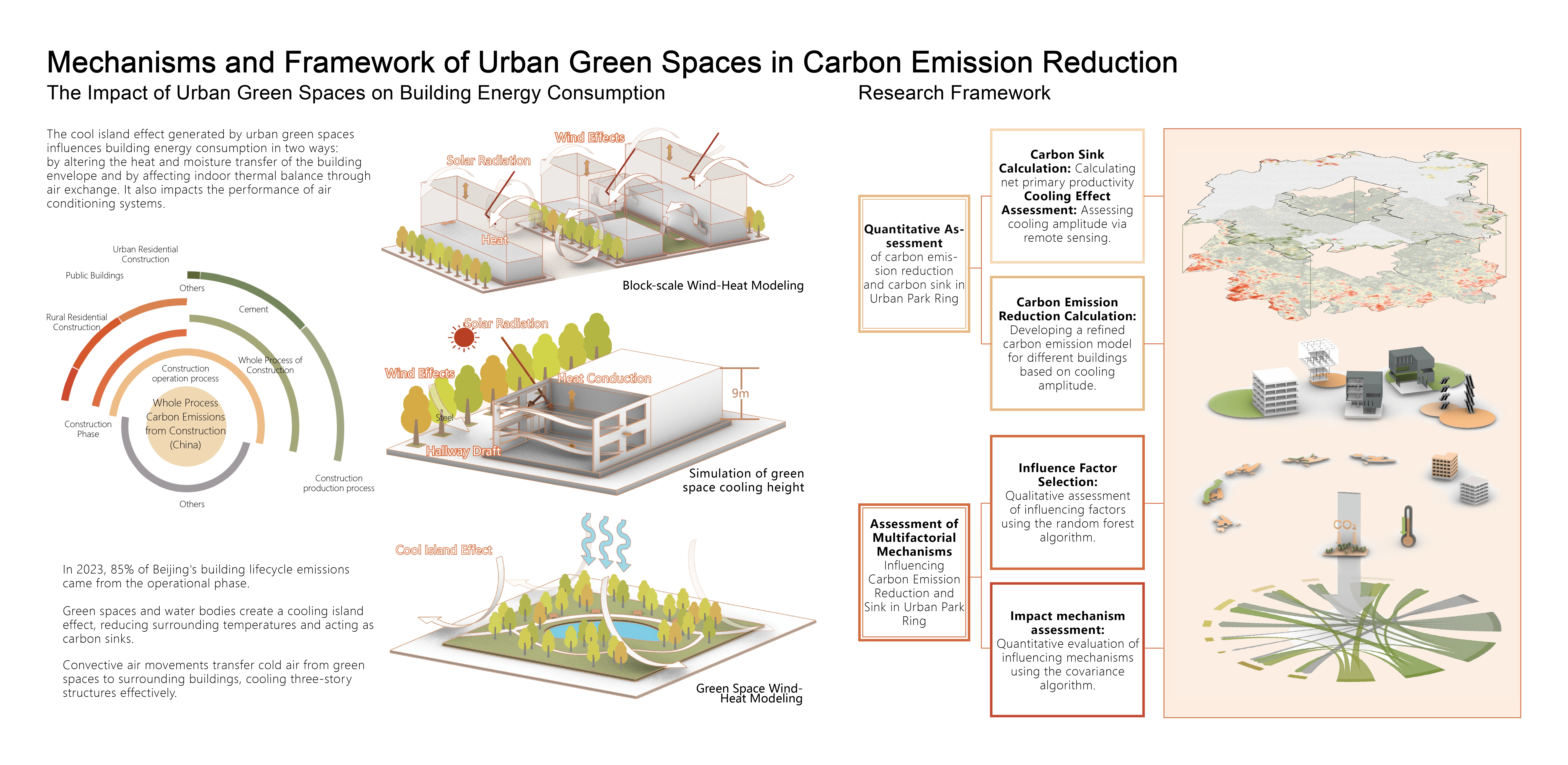 This study addresses these gaps by focusing on the urban park ring in Beijing, aiming to quantify both direct carbon sink and indirect cooling-induced carbon reduction. We employ a comprehensive methodological framework integrating remote sensing data analysis, numerical modeling, EnergyPlus simulations, and random forest machine learning. This framework enables precise estimation of green space–induced carbon reductions by quantifying their cooling range and intensity, and integrates an urban-scale building emission model to capture energy-use responses. By tracing the cooling–energy–carbon pathway, the study aims to quantify actual carbon reductions and uncover the multi-factor mechanisms that drive them.