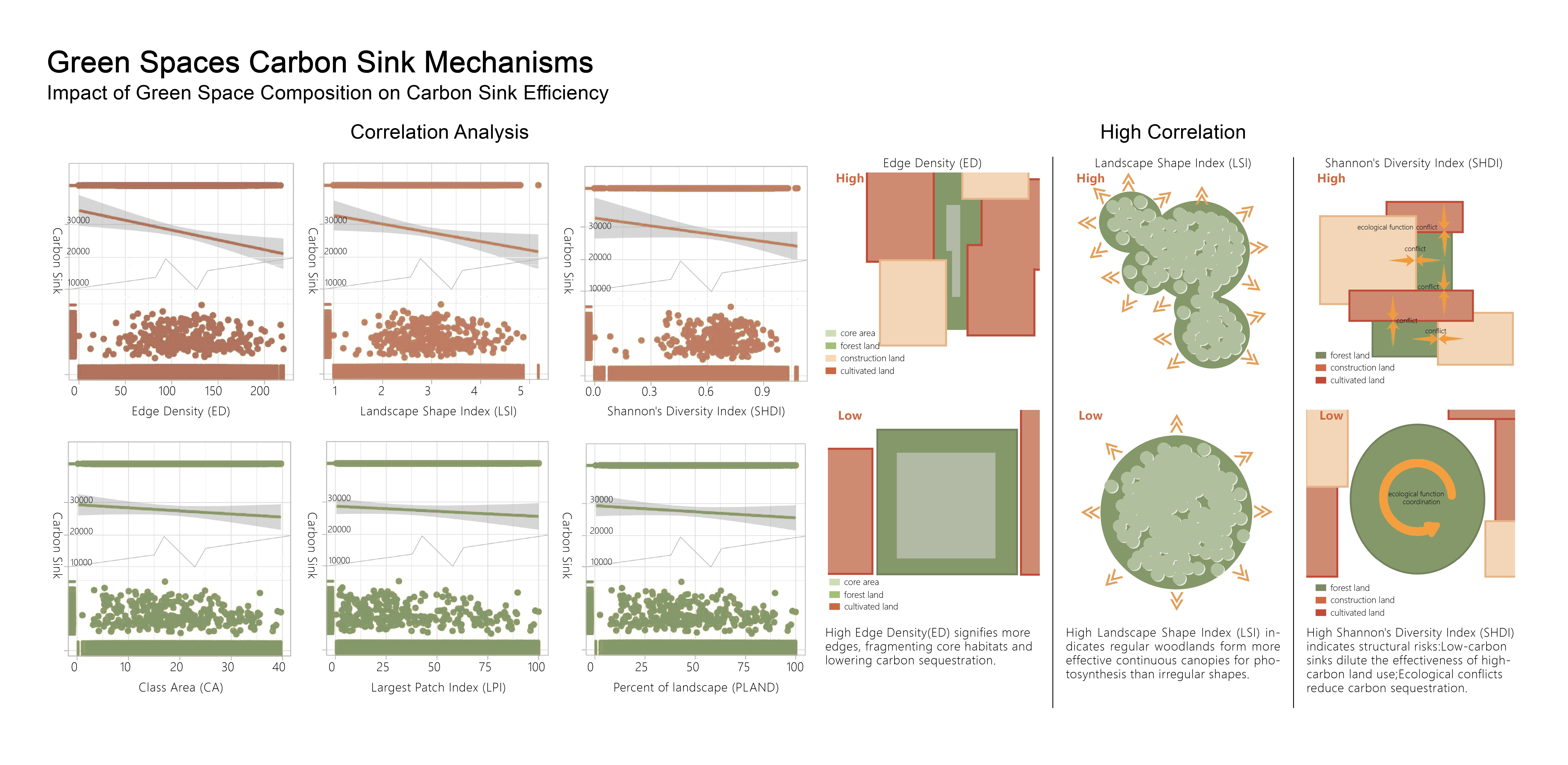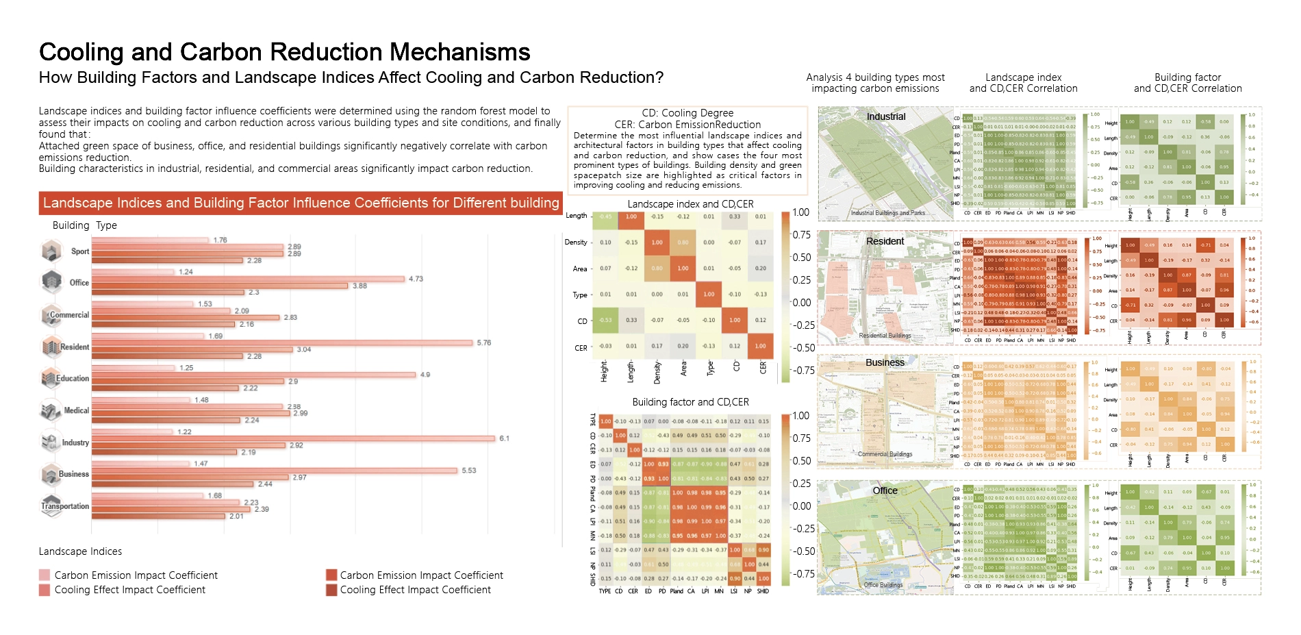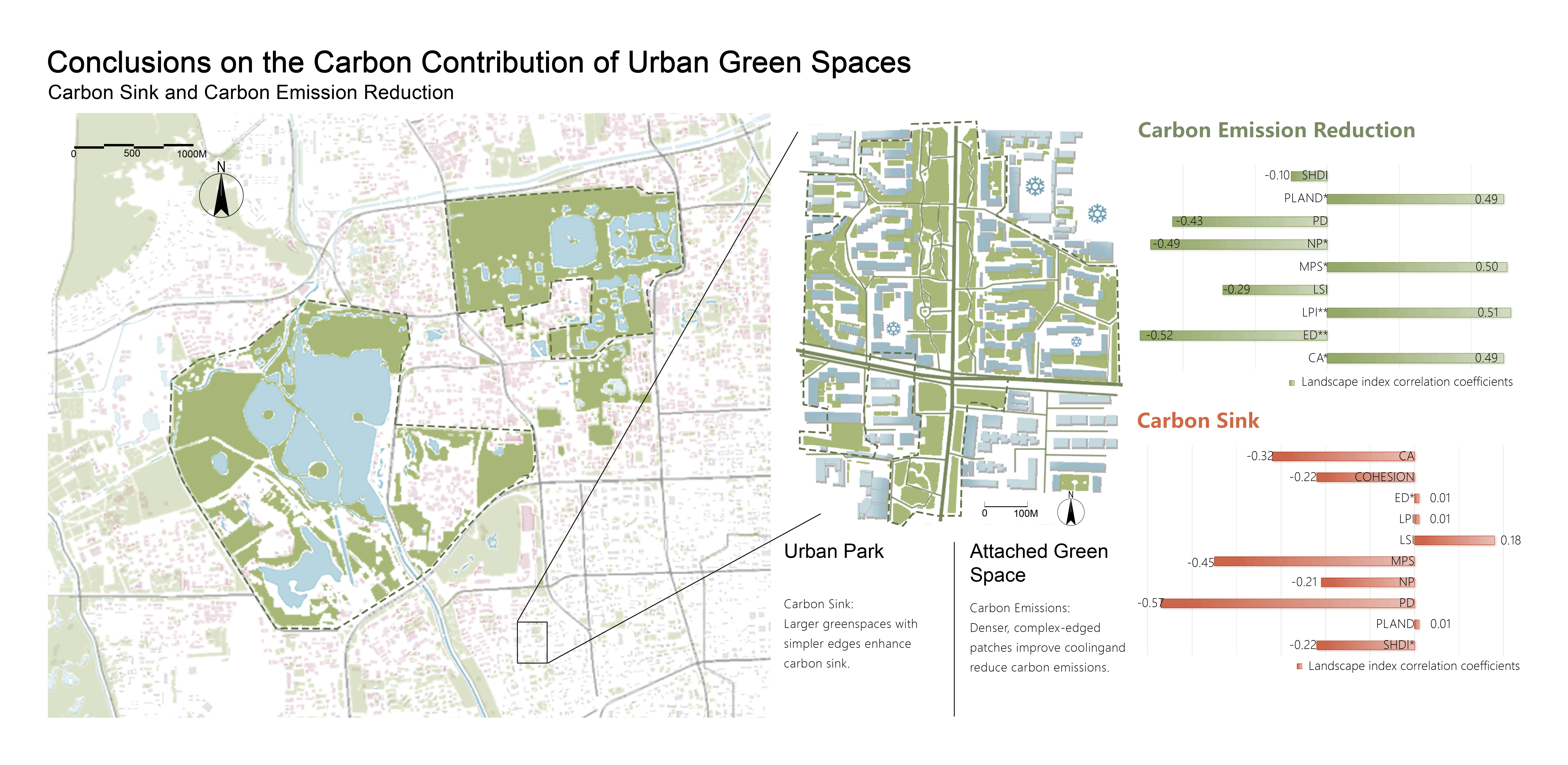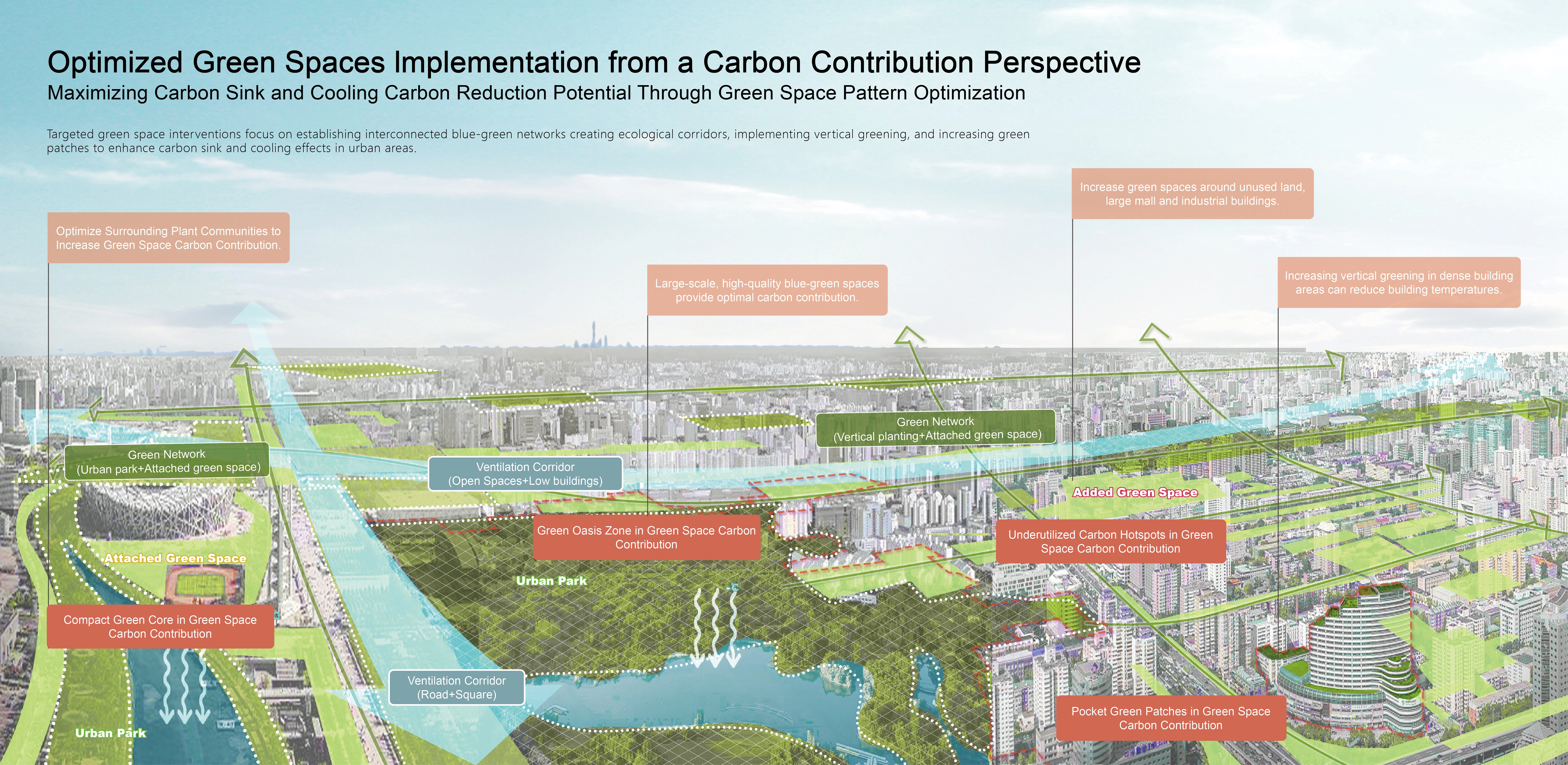 Megacities exacerbate carbon emissions due to intensified building energy use and urban heat islands. Urban green spaces offer dual carbon benefits: acting as direct carbon sinks and indirectly reducing emissions by lowering building energy demand through localized cooling. This study analyzes Beijing’s urban park ring using random forest analysis to quantify the impact of landscape indices and green space attributes on carbon reduction.  Results indicate that cooling-driven reductions dominate carbon benefits. Under the proposed green space optimization scenarios, total carbon mitigation potential is projected to increase by 11.2%. The framework supports urban green spaces optimization for carbon management and climate resilience.