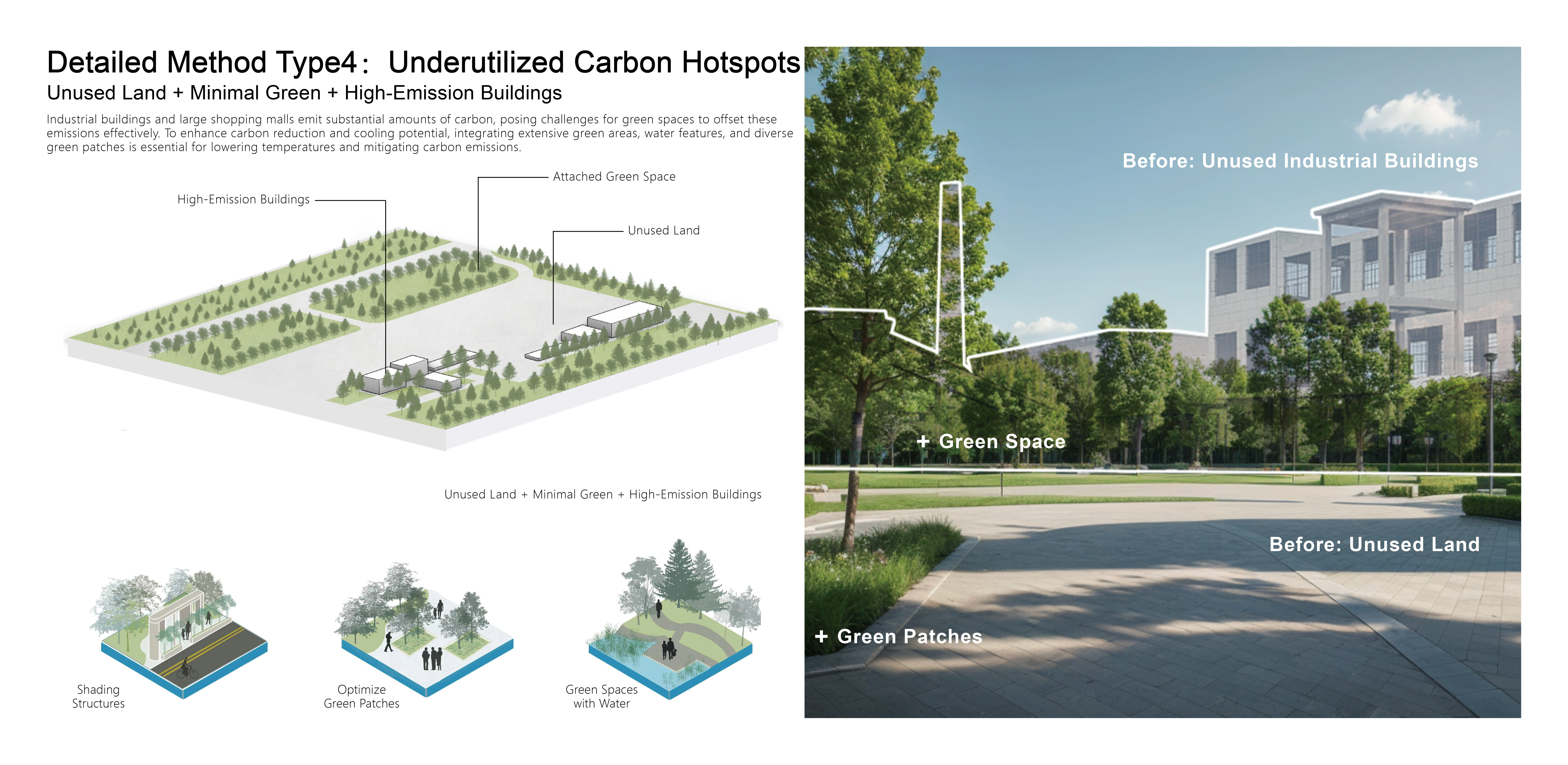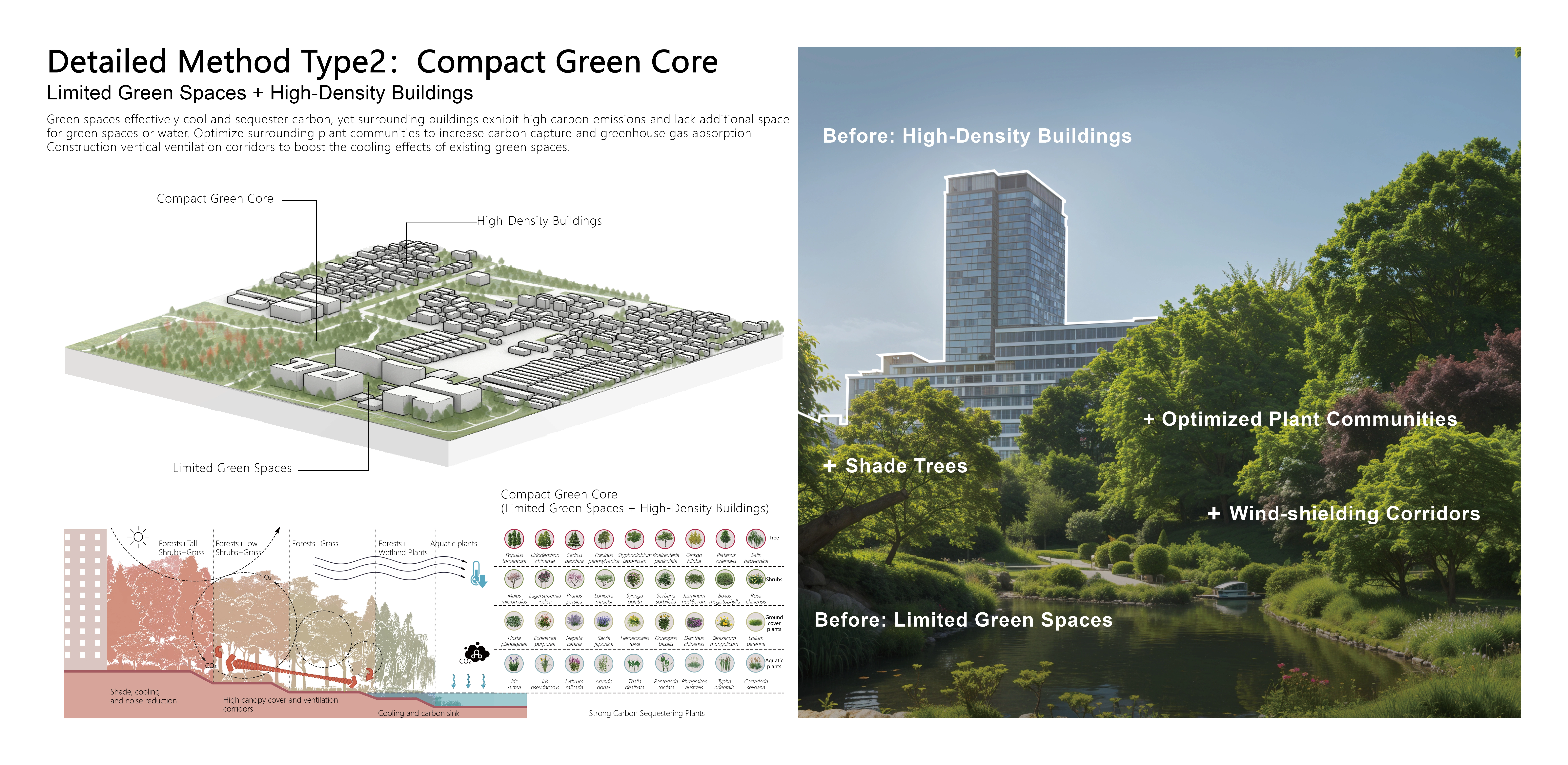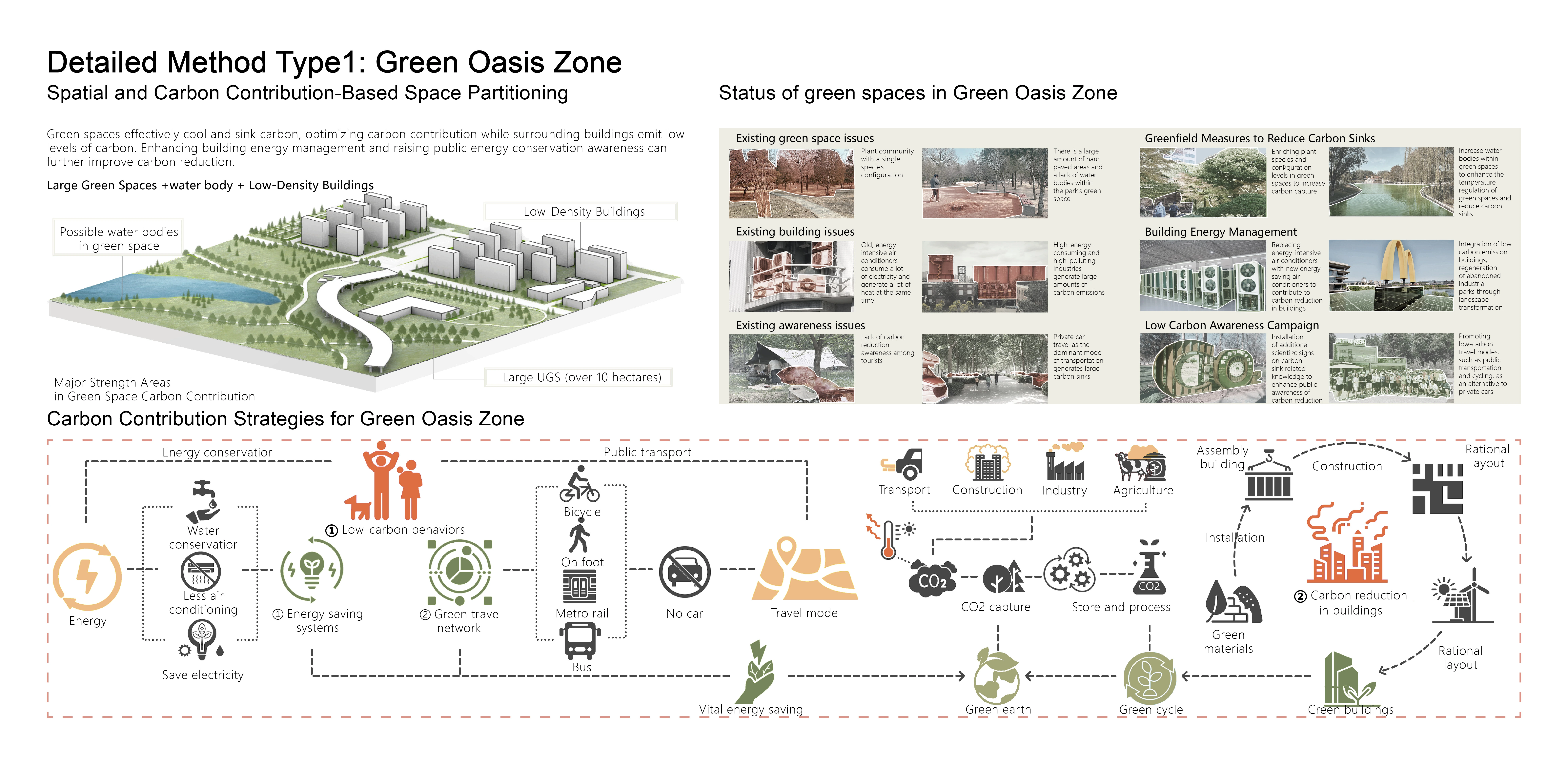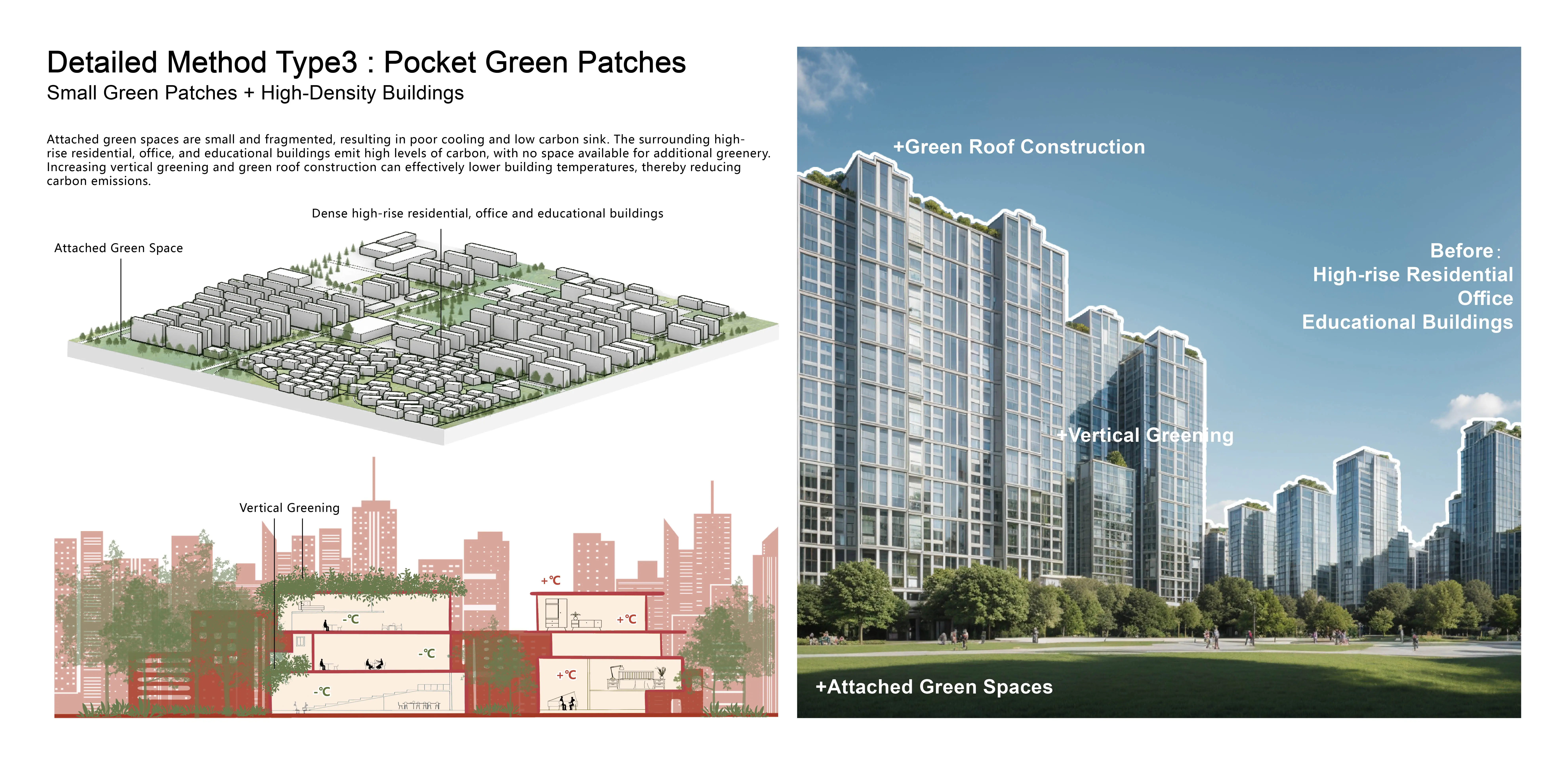 Building upon these findings, we propose three macro strategies — connecting green networks, establishing ventilation corridors, and optimizing green patch configurations — and four targeted design strategies — enhancing energy management, optimizing plant communities, increasing vertical greening, and expanding blue-green spaces. Implementation of these strategies could increase the green space area by 4.3 km², elevate vertical greening coverage, and enhance overall carbon contributions by 11.2%.