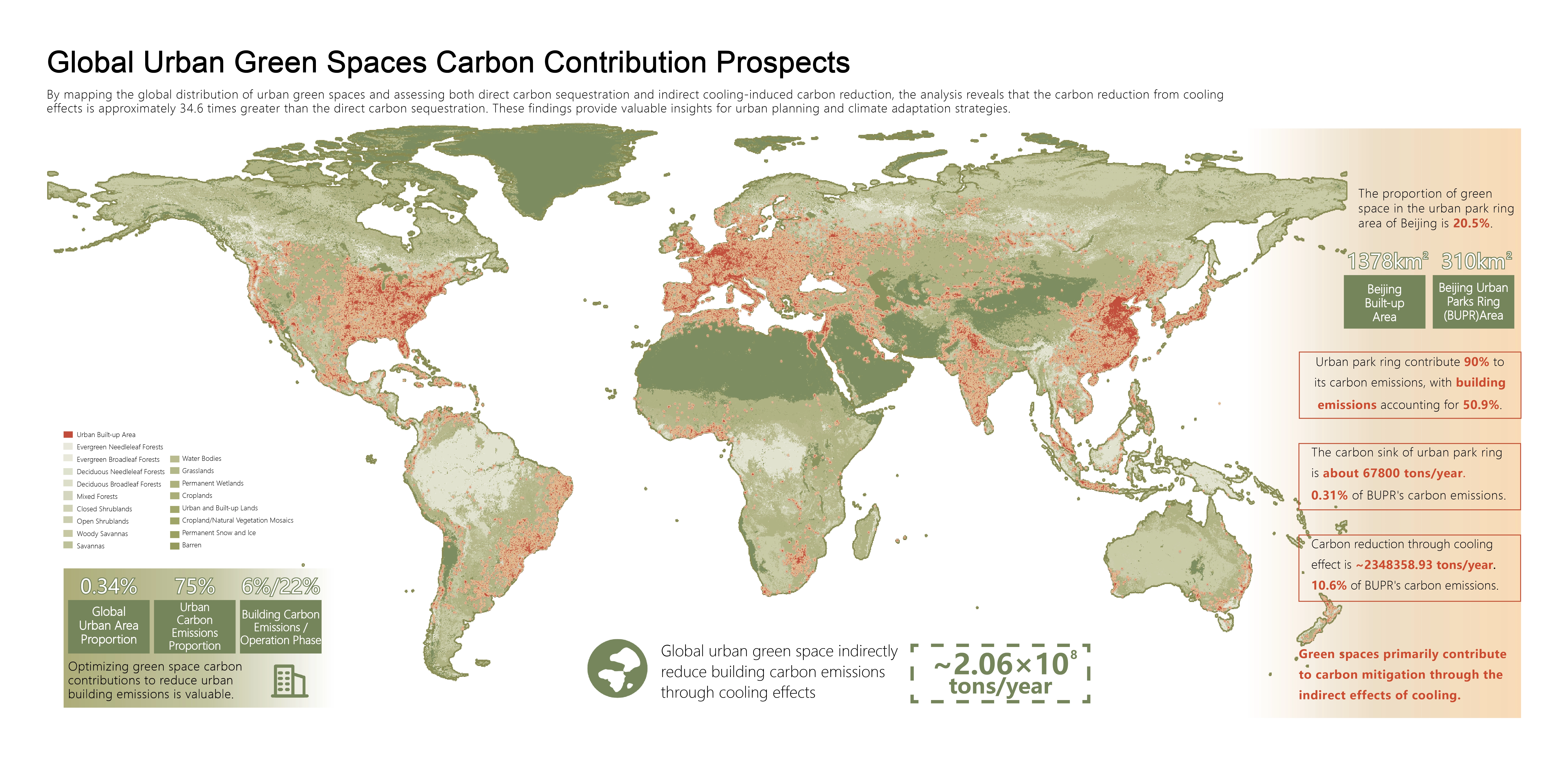 Urban built-up areas, covering just 0.34% of global land in 2020, account for approximately 75% of global carbon emissions. In megacities like Beijing, the disparity is even more pronounced, with 90% of the city’s carbon emissions originating from its built-up areas. Amidst the urgency to mitigate climate change, reducing urban carbon emissions has become a critical priority. However, the carbon contribution of urban green spaces is often underestimated, especially their potential for indirect reductions through cooling effects.